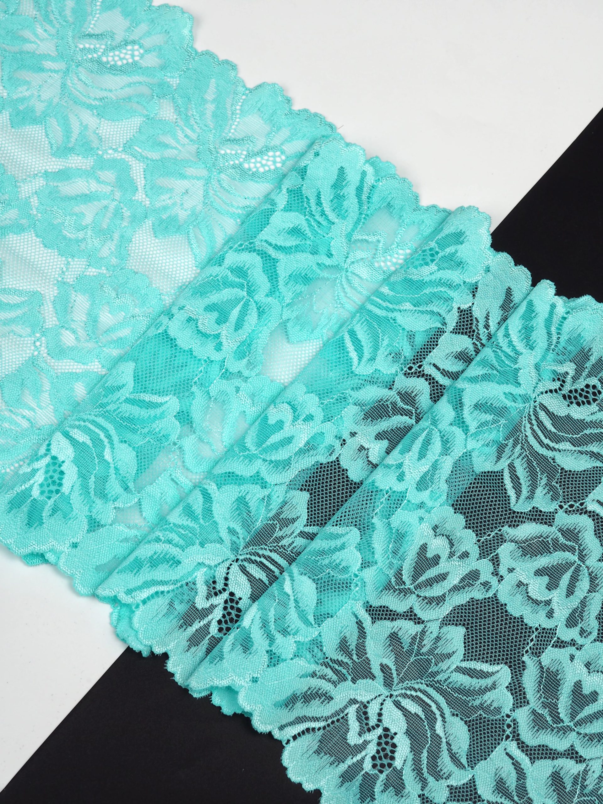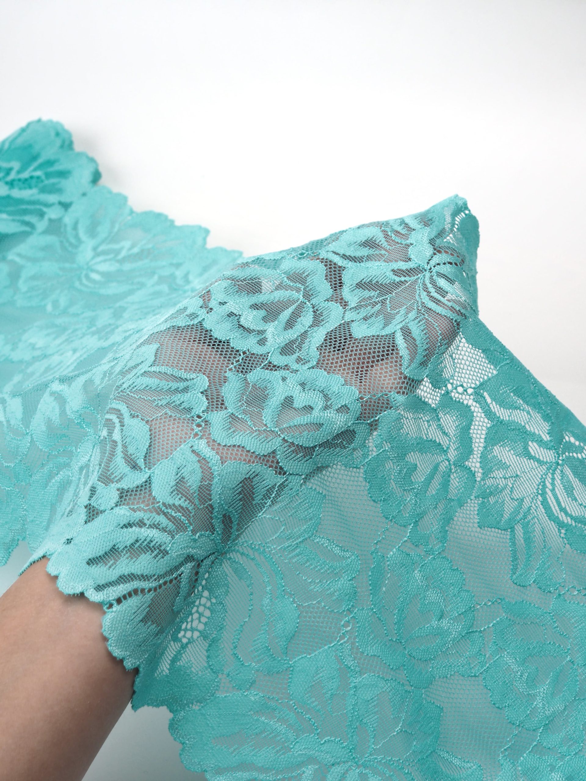 Эластичное кружево яркий тиффани используется для изготовления разнообразной одежды и предметов декора. Данный материал, как правило, хорошо сохраняет форму, но при этом неплохо тянется. Такие свойства делают его действительно универсальным в применении. Кружево стрейч можно использовать для пошива нижнего белья, чулков, сценических костюмов, элементов декора. С материалом достаточно просто работать - не только профессионалам, но и новичкам.