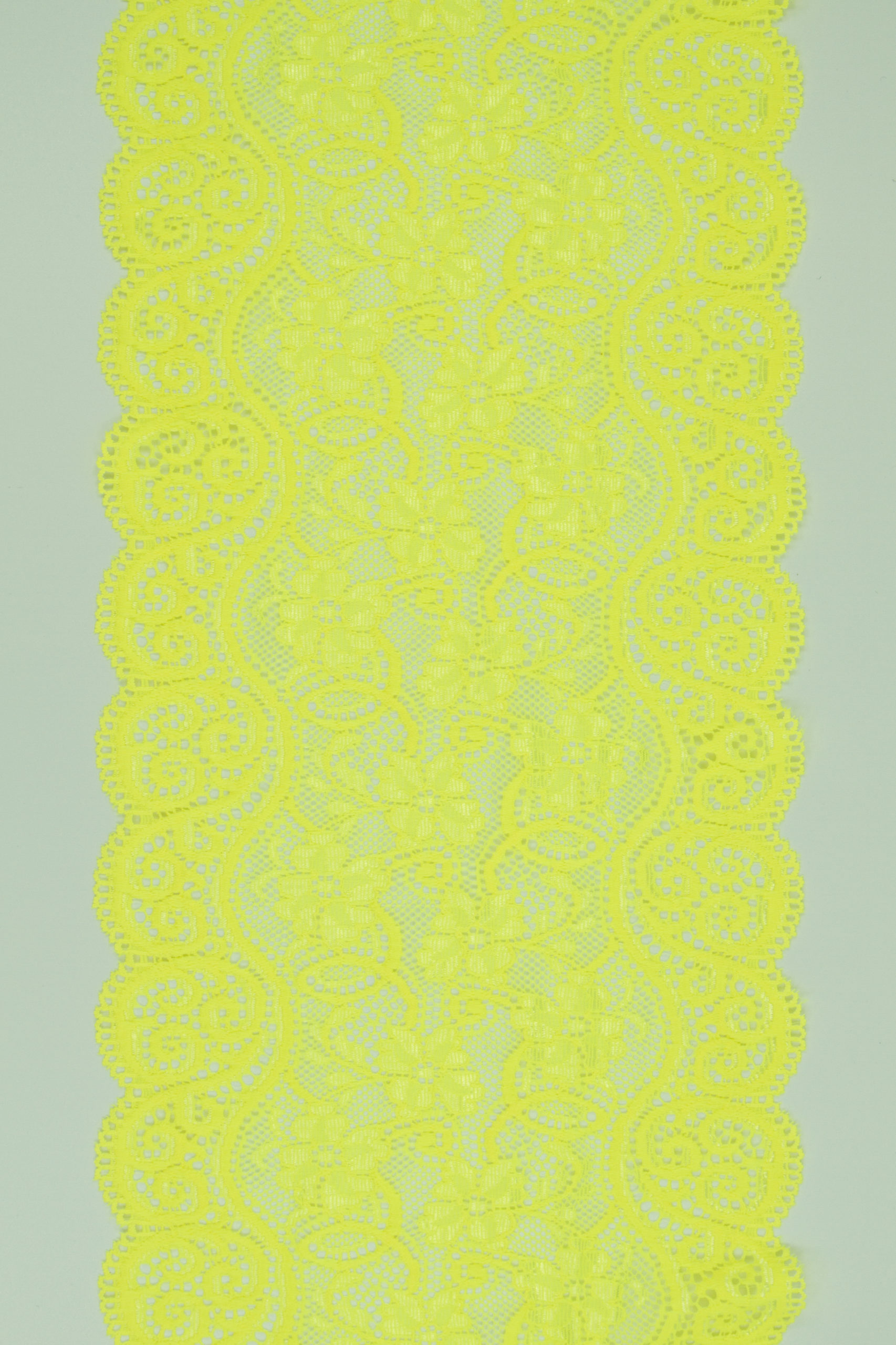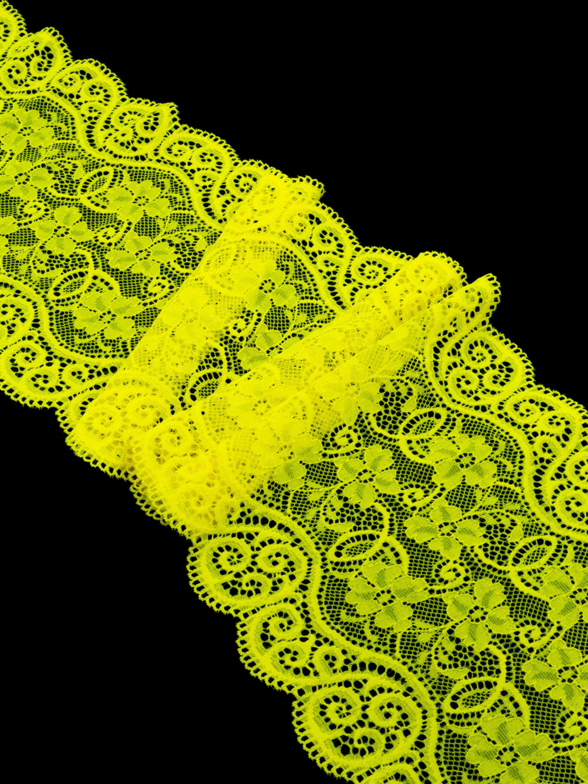 Эластичное кружево желтое неоновое используется для изготовления разнообразной одежды и предметов декора. Данный материал, как правило, хорошо сохраняет форму, но при этом неплохо тянется. Такие свойства делают его действительно универсальным в применении. Кружево стрейч можно использовать для пошива нижнего белья, чулков, сценических костюмов, элементов декора. С материалом достаточно просто работать - не только профессионалам, но и новичкам.