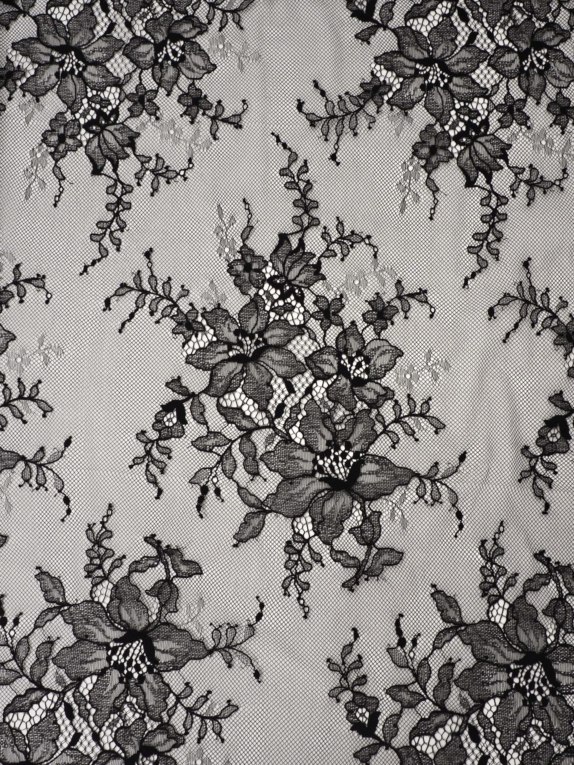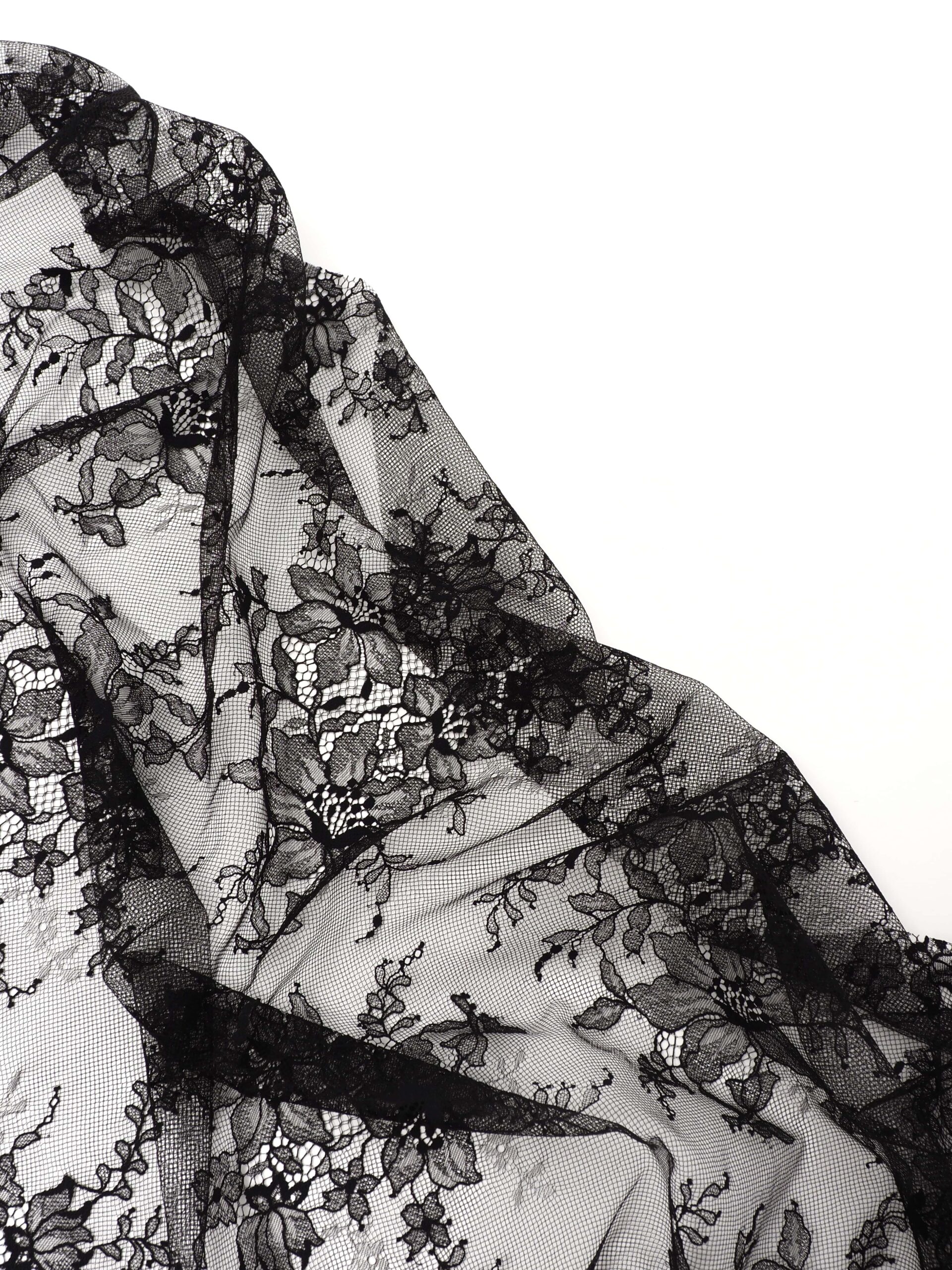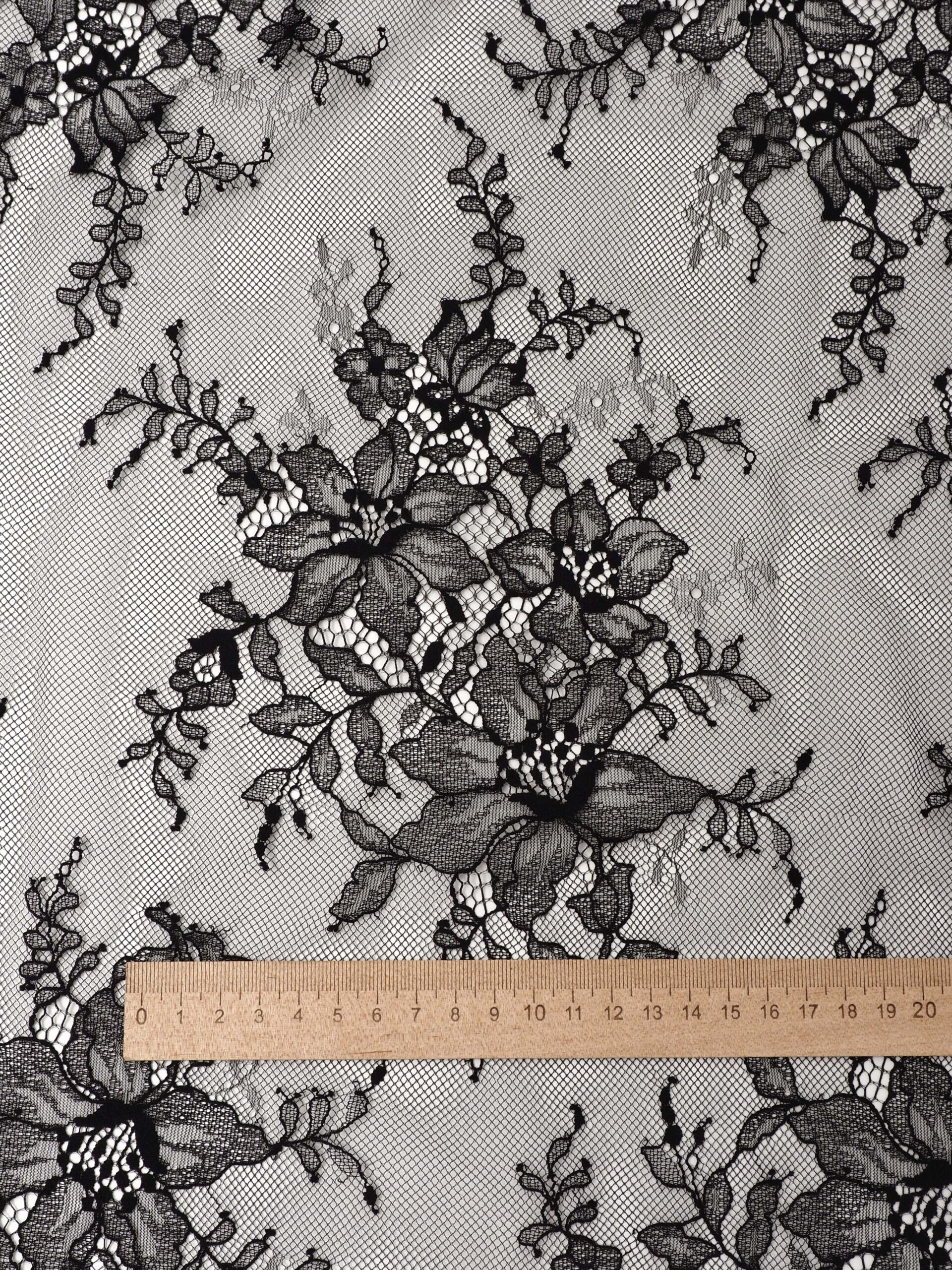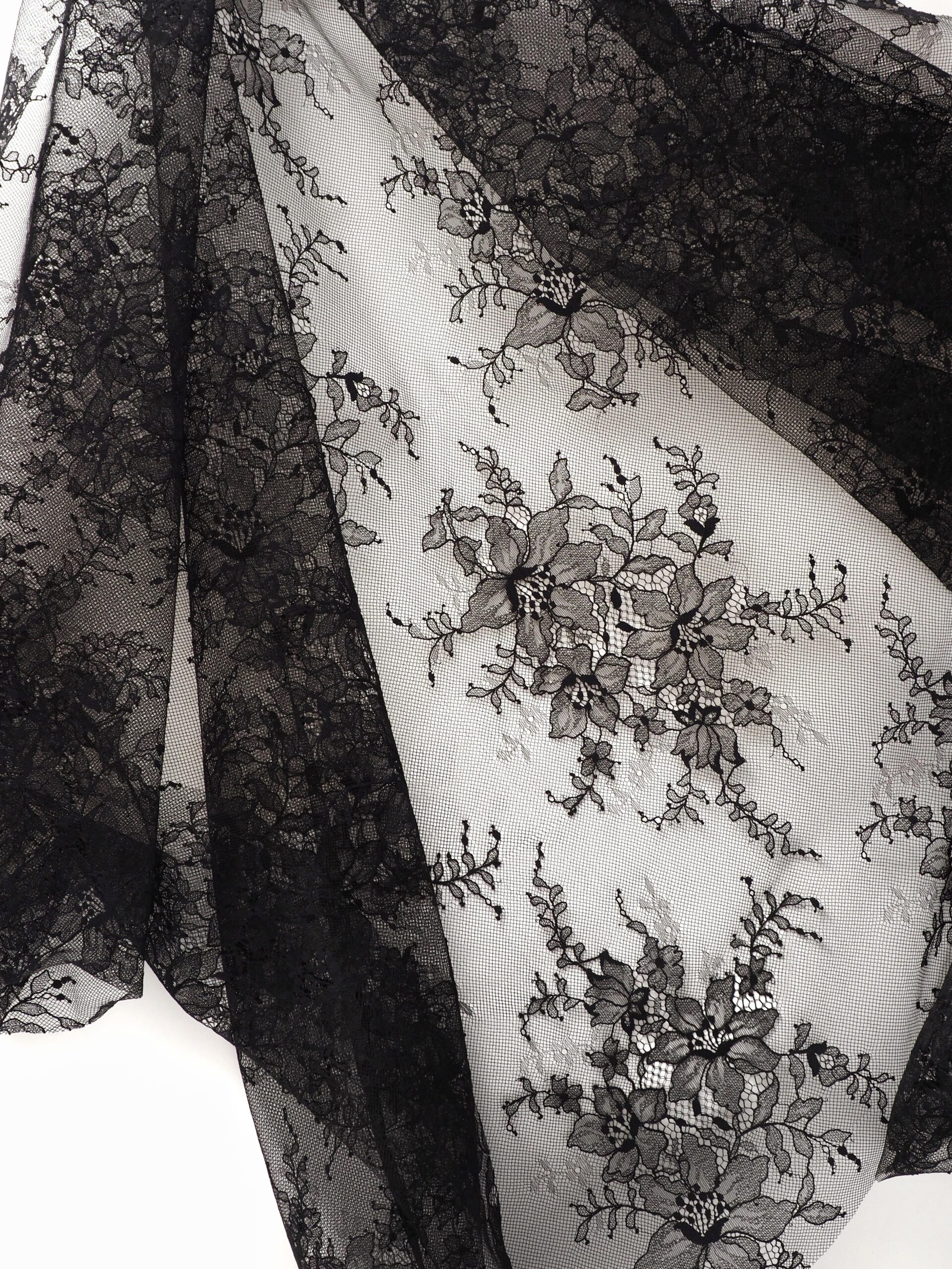 Кружевное полотно широкое черного оттенка с цветочным рисунком. Шантильи без ресничек черное тонкое.