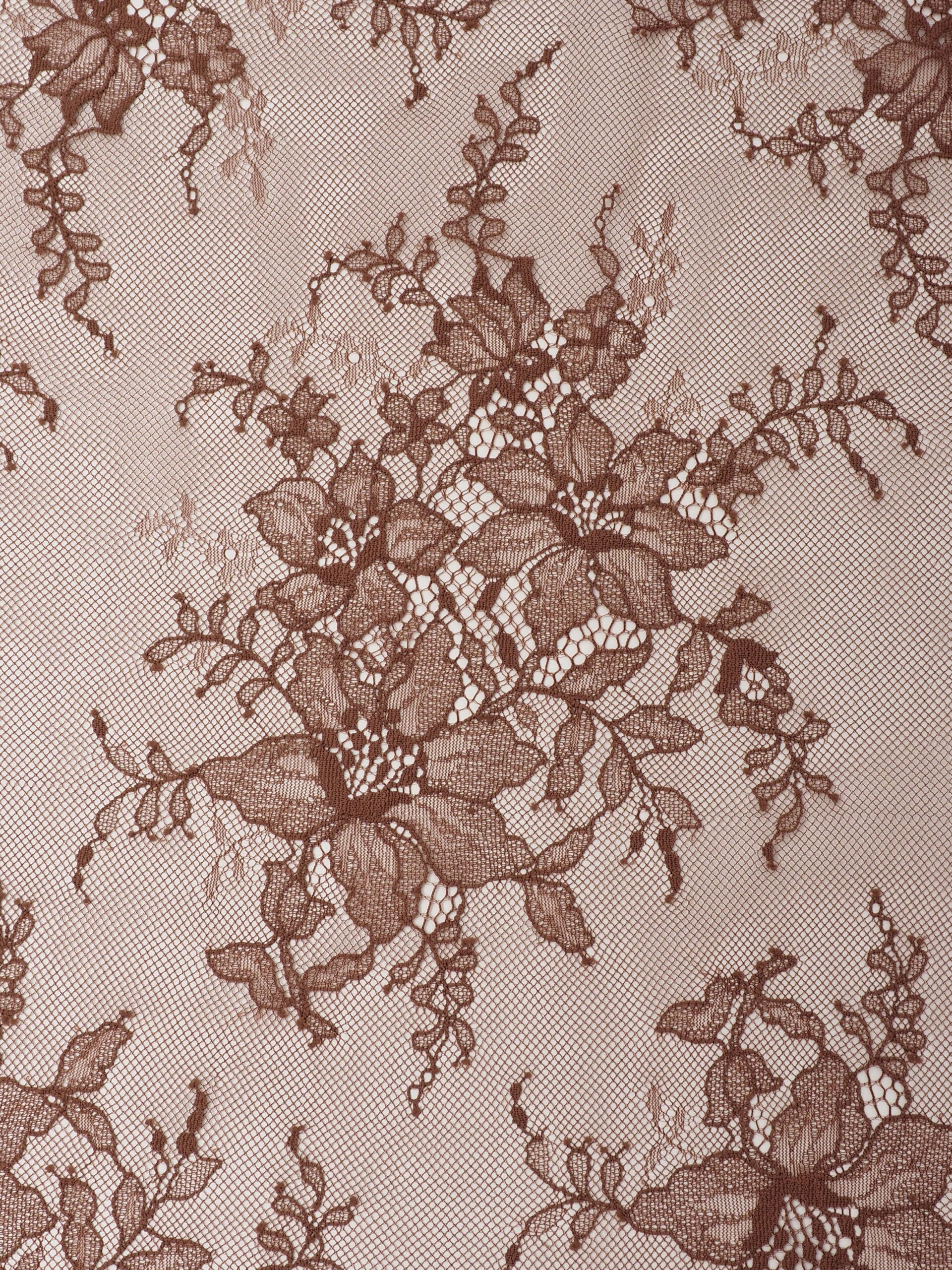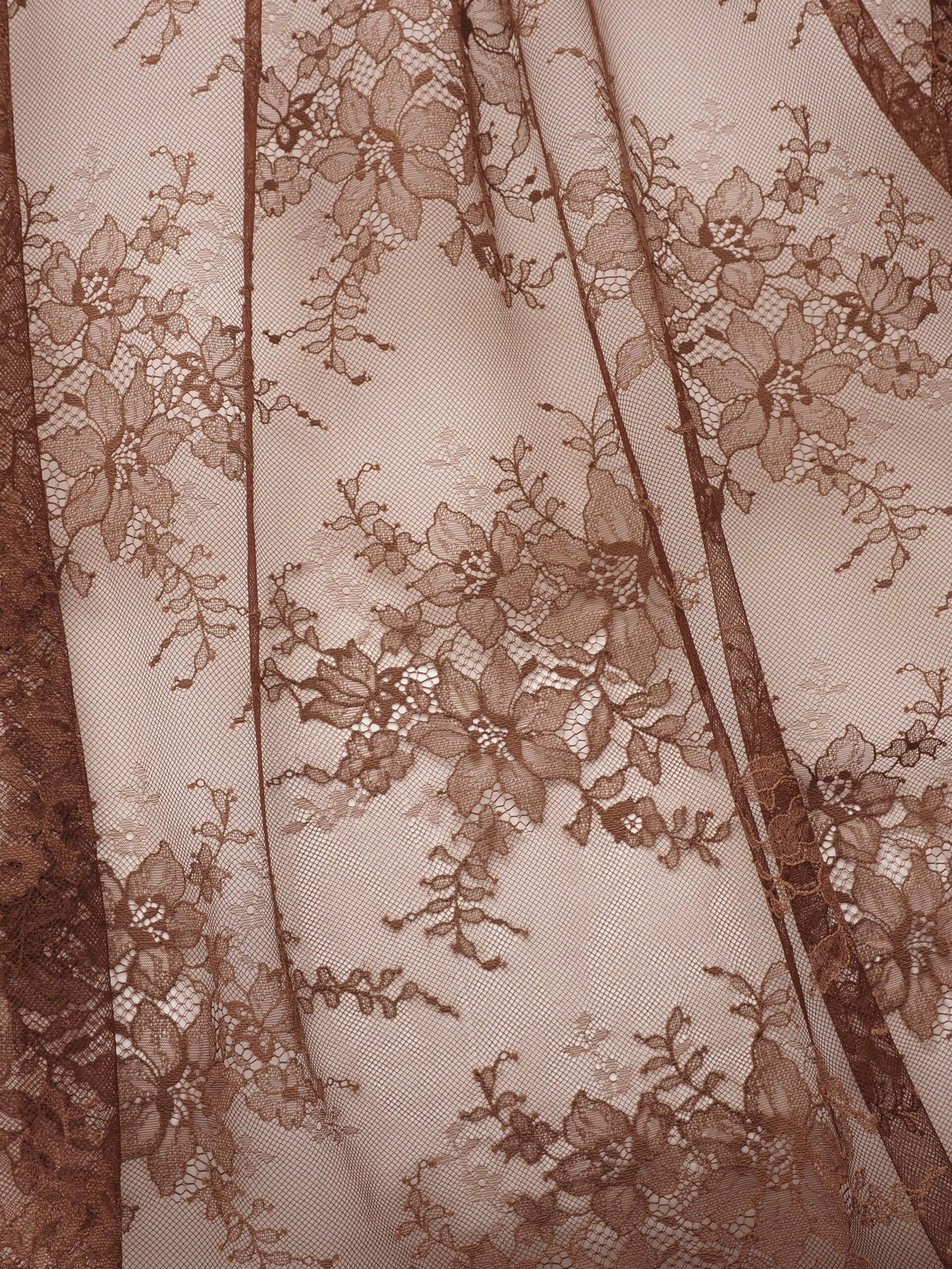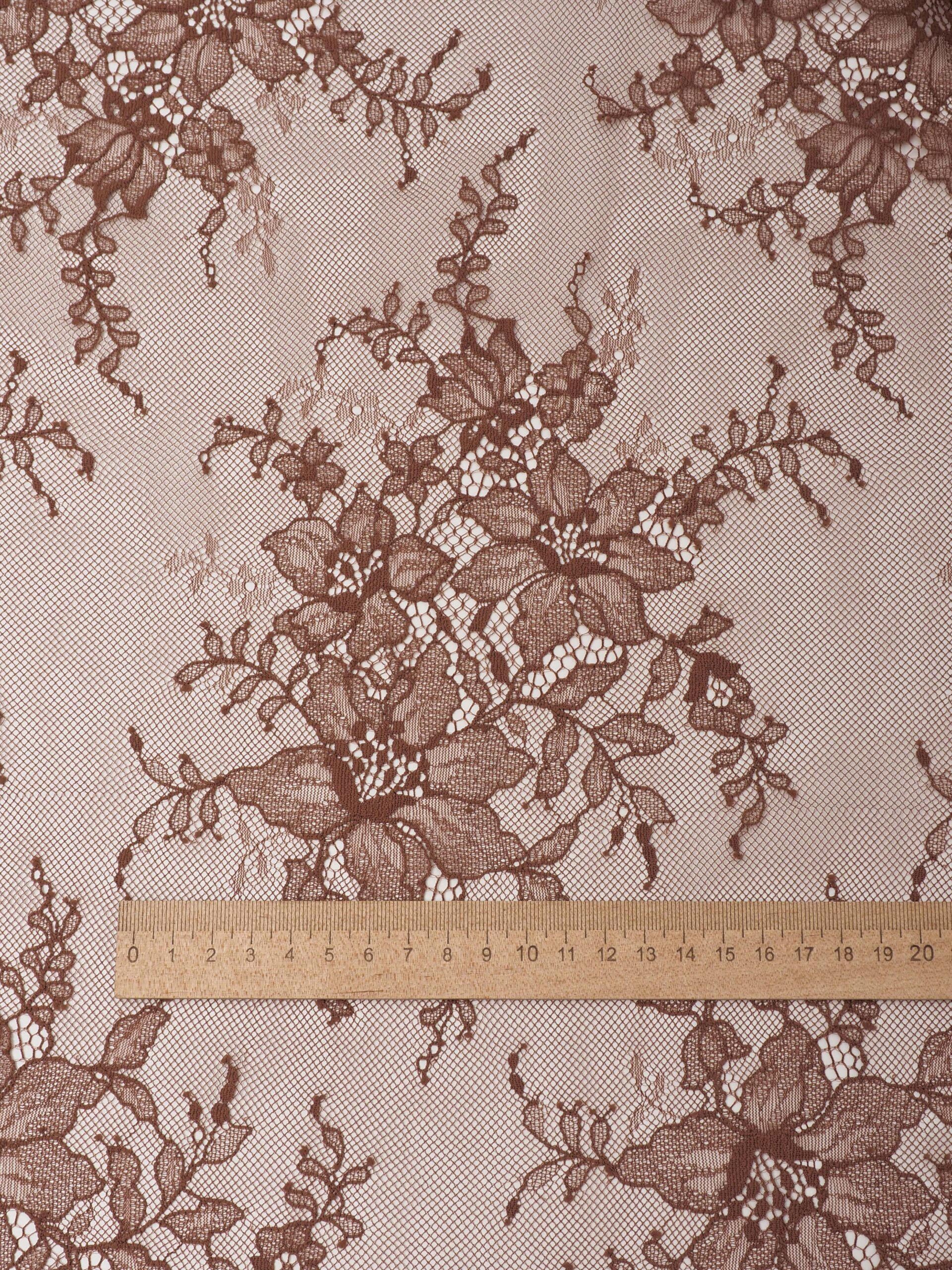 Кружевное полотно широкое коричневого оттенка с цветочным рисунком. Шантильи без ресничек молочный шоколад.