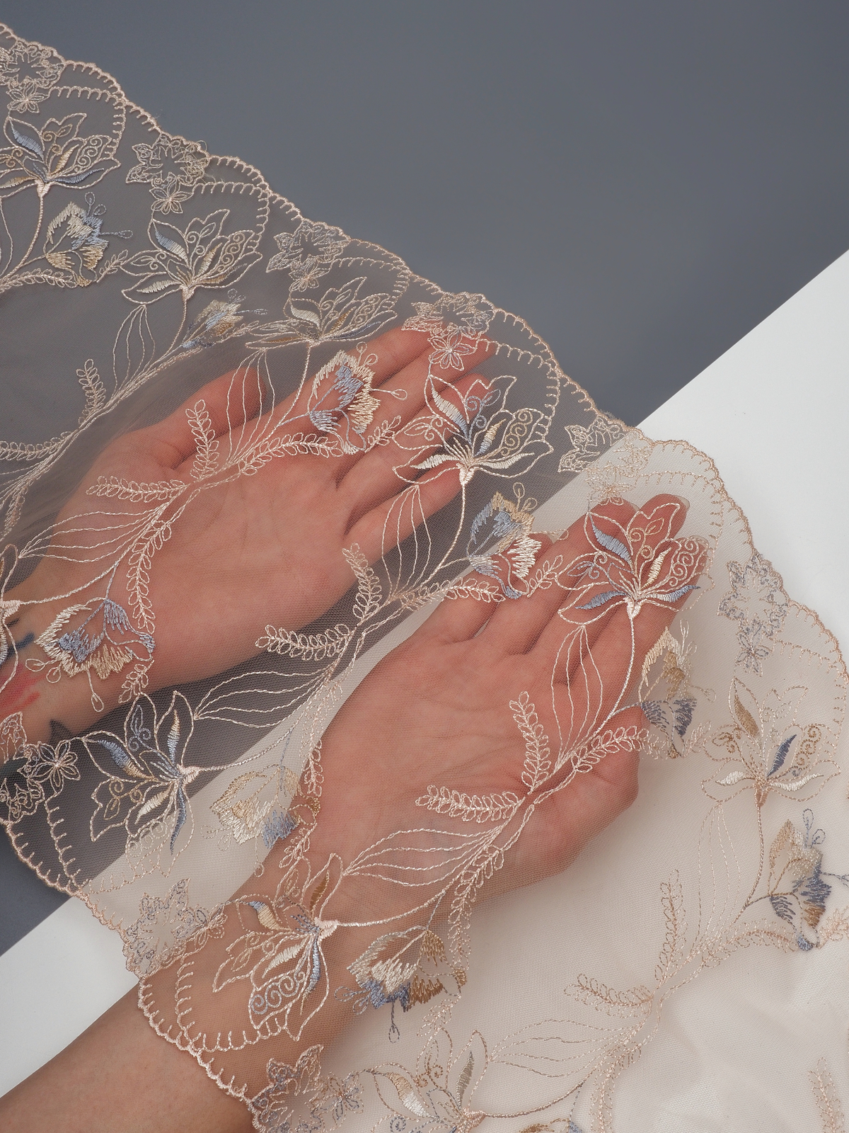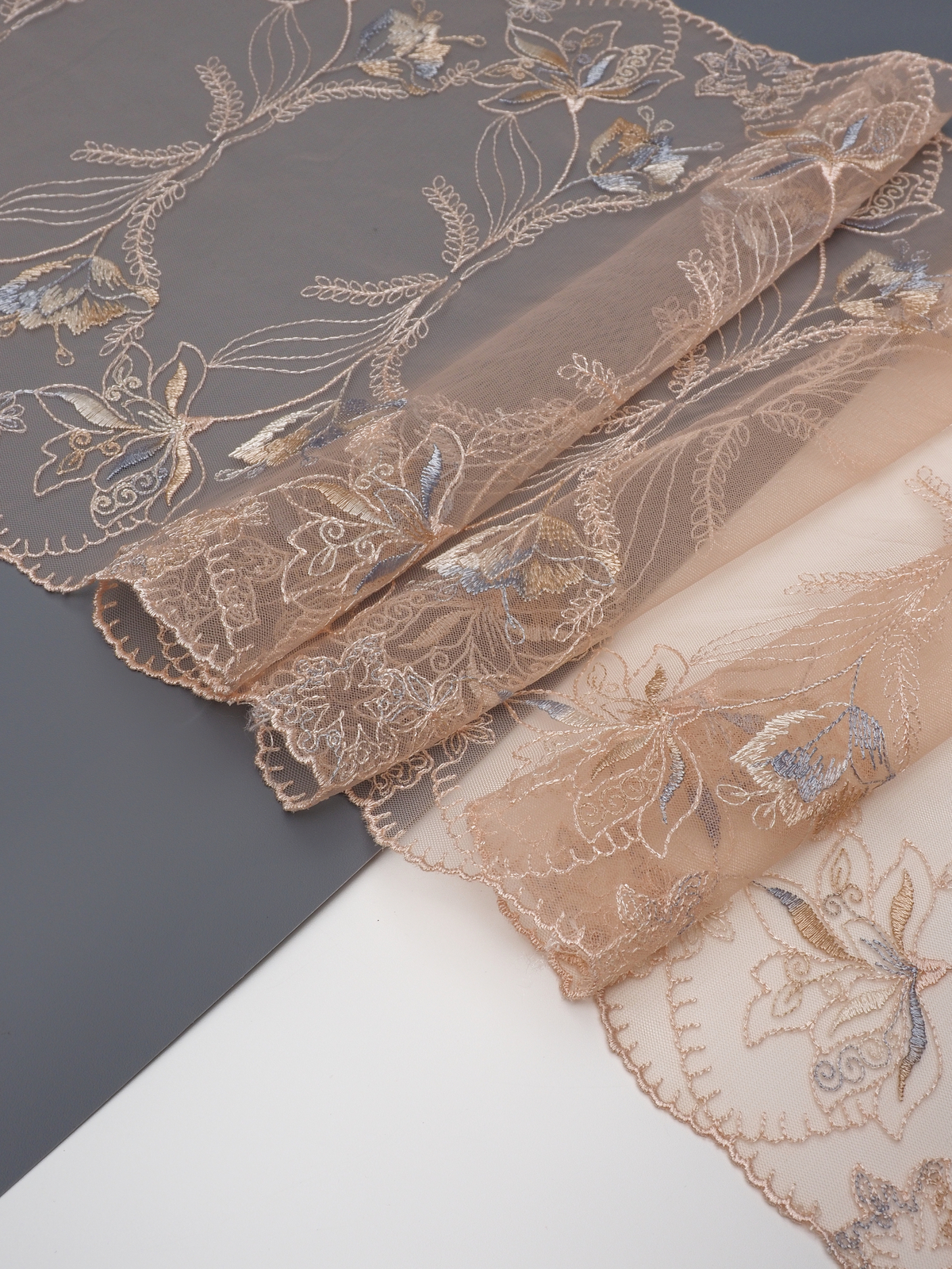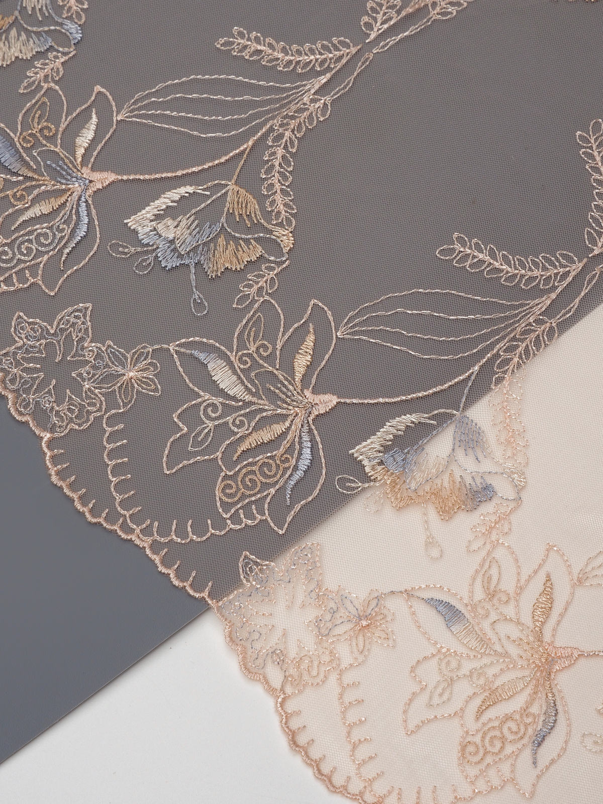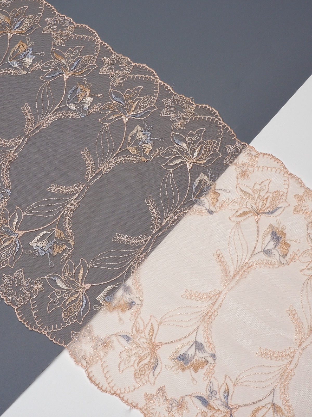 Ваше идеальное решение для создания эксклюзивного белья. Двухстороннее кружево с вышивкой на сетке сочетает эстетику и функциональность. Сочетание цвета с вышитым рисунком придаёт материалу особый шарм и универсальность.