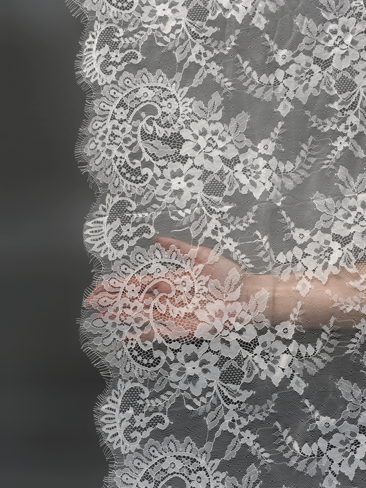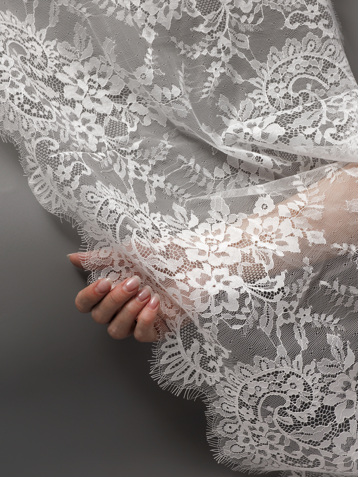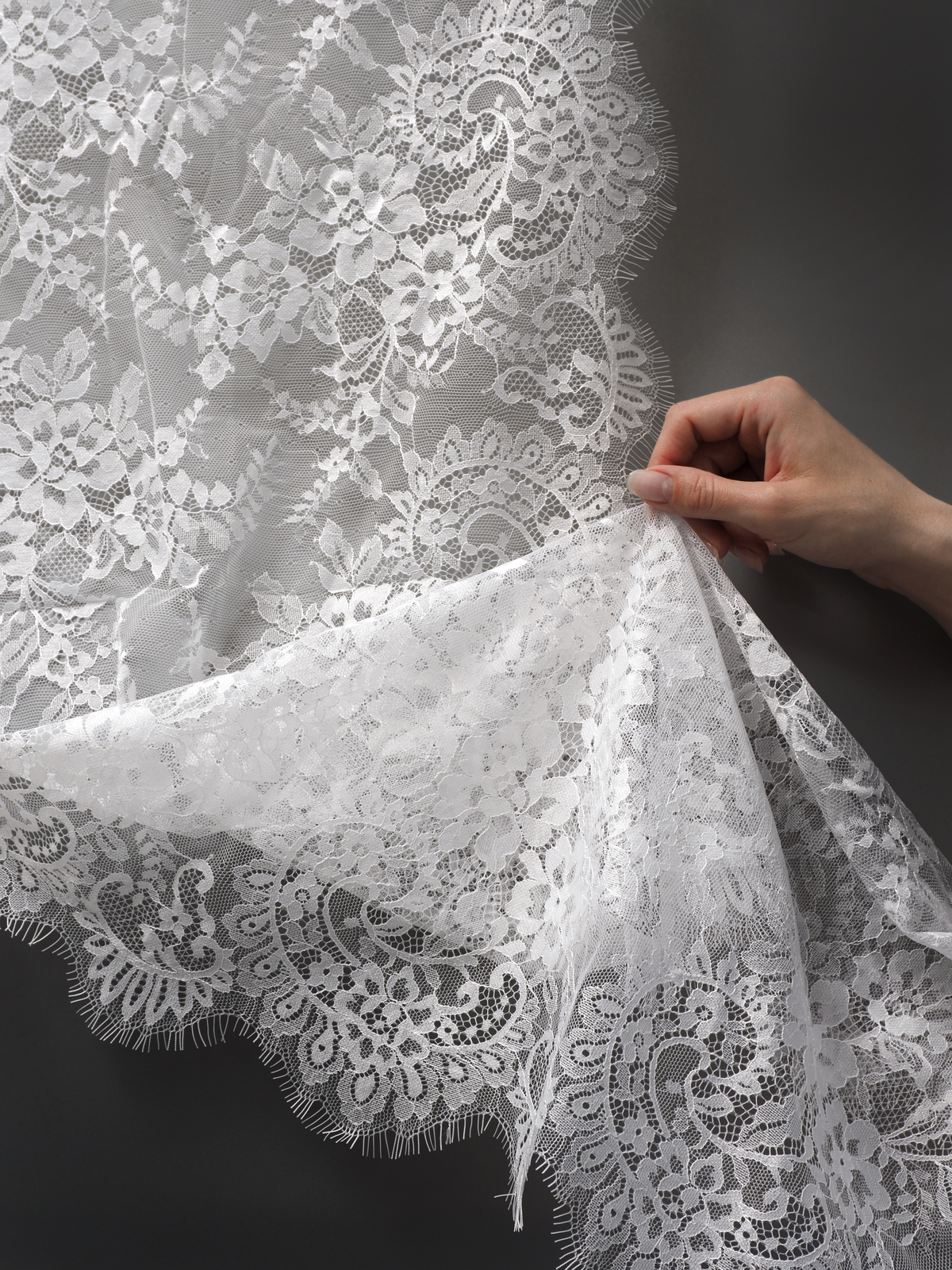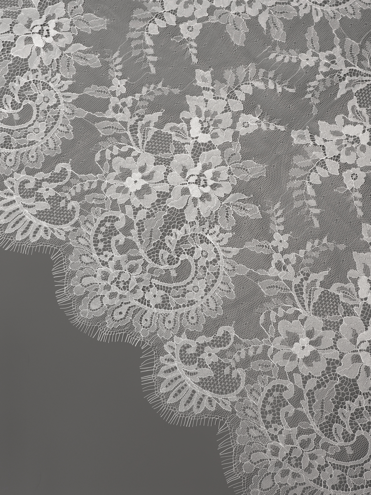 Шантильи кружево с ресничками без эластана с цветочным рисунком белого оттенка. БРАК 1-2 дырочки на купон.