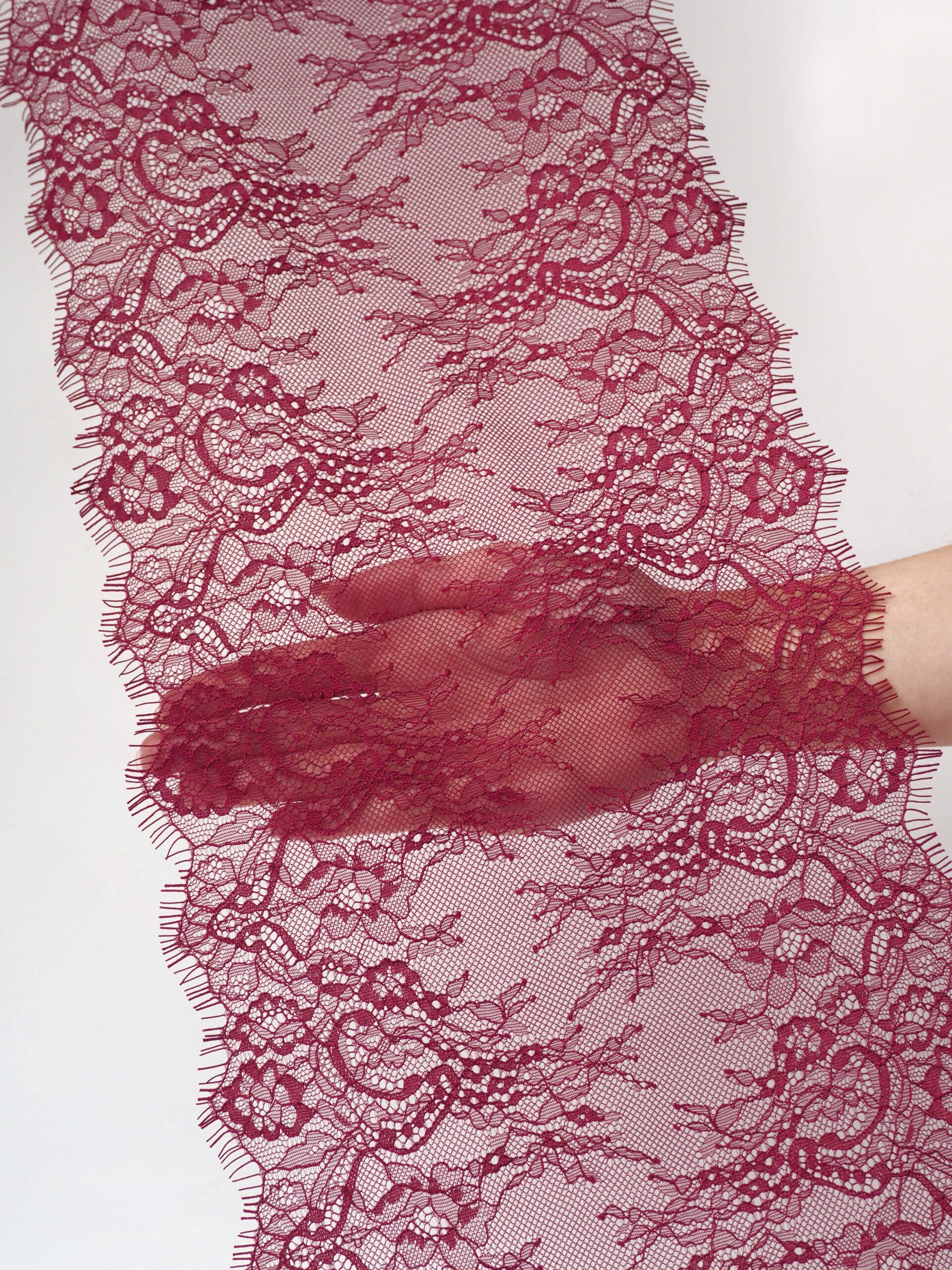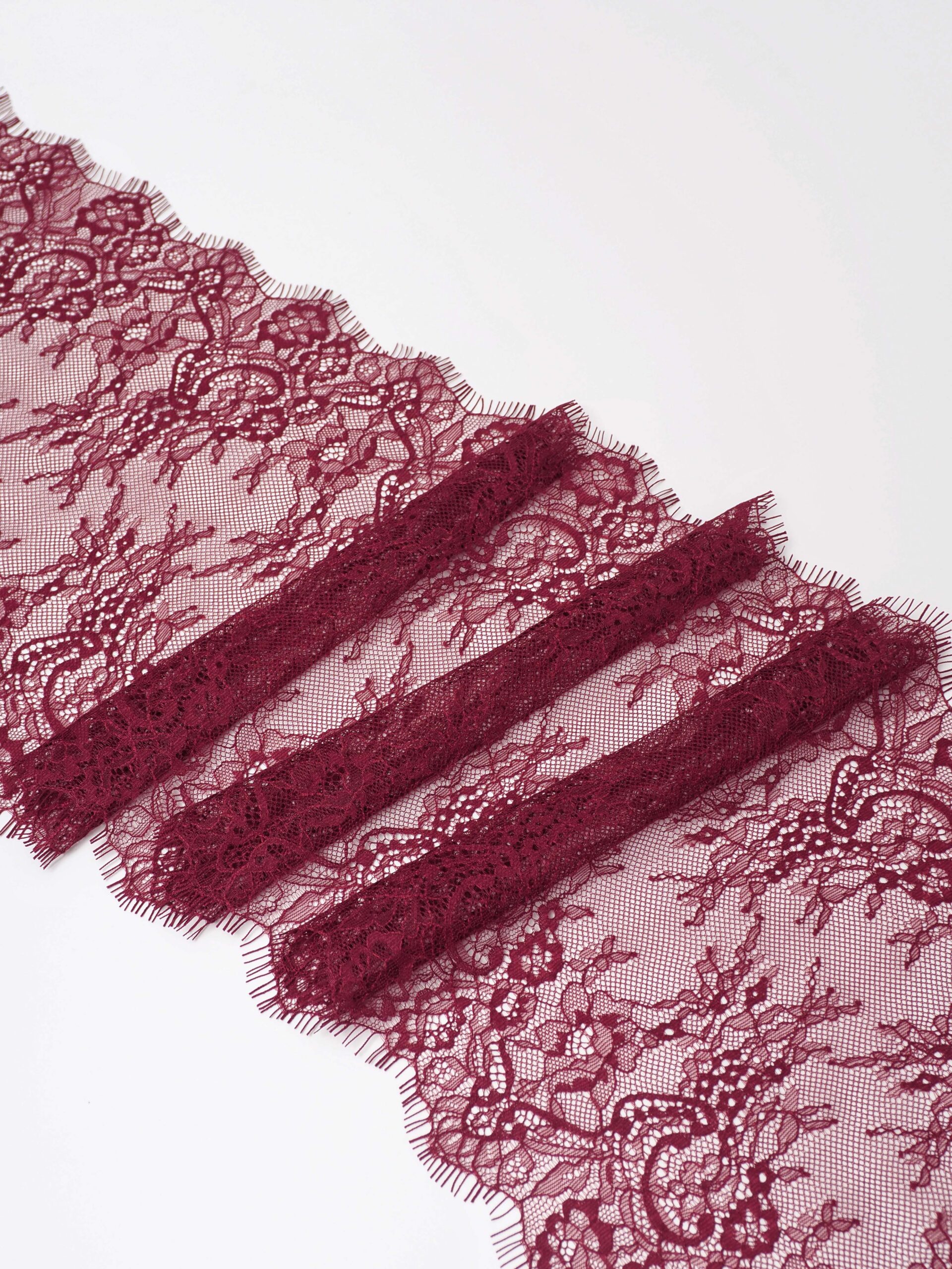Шантильи кружево с ресничками без эластана бордовое. БРАК 1-2 дырочки на купон.