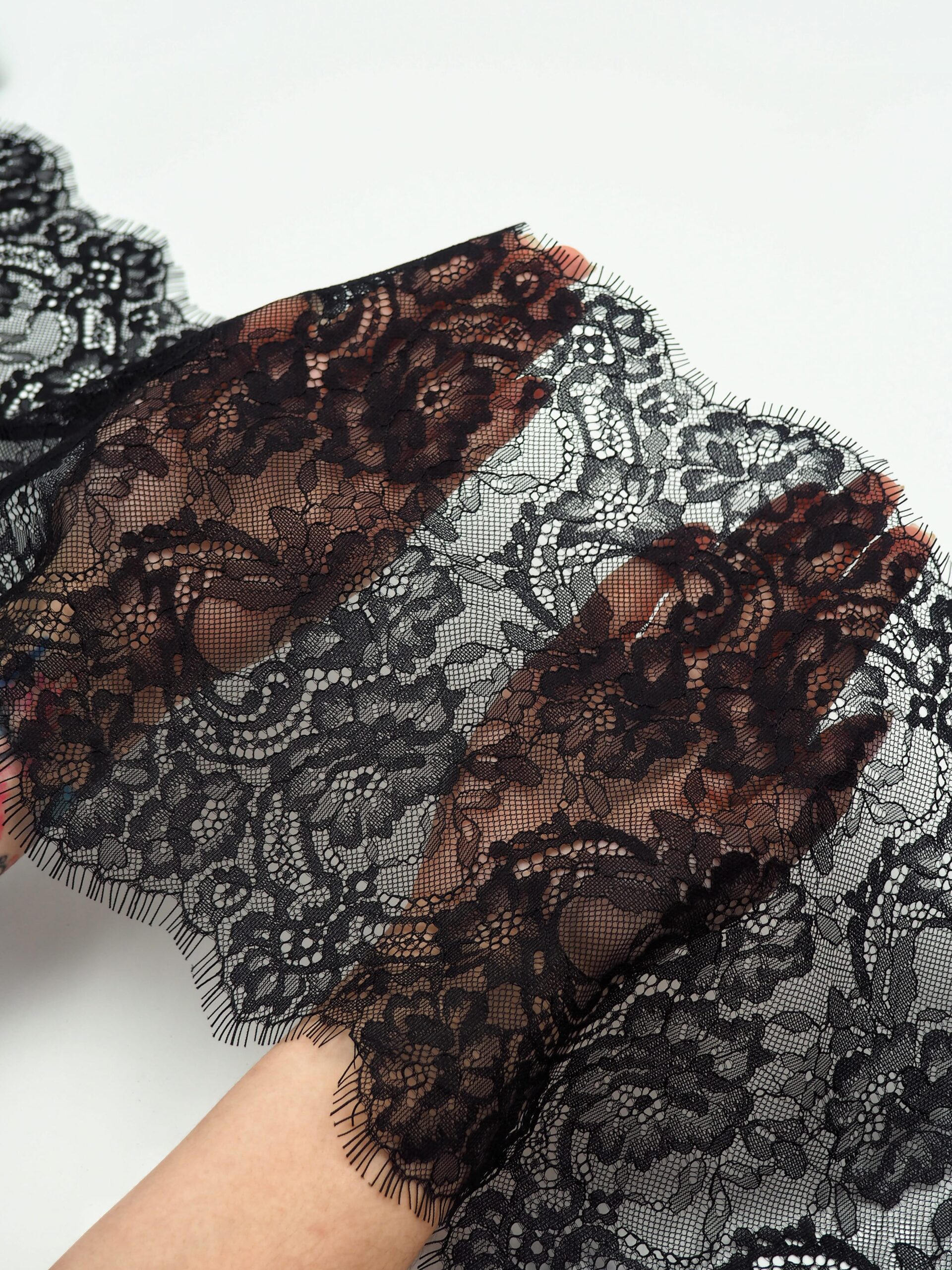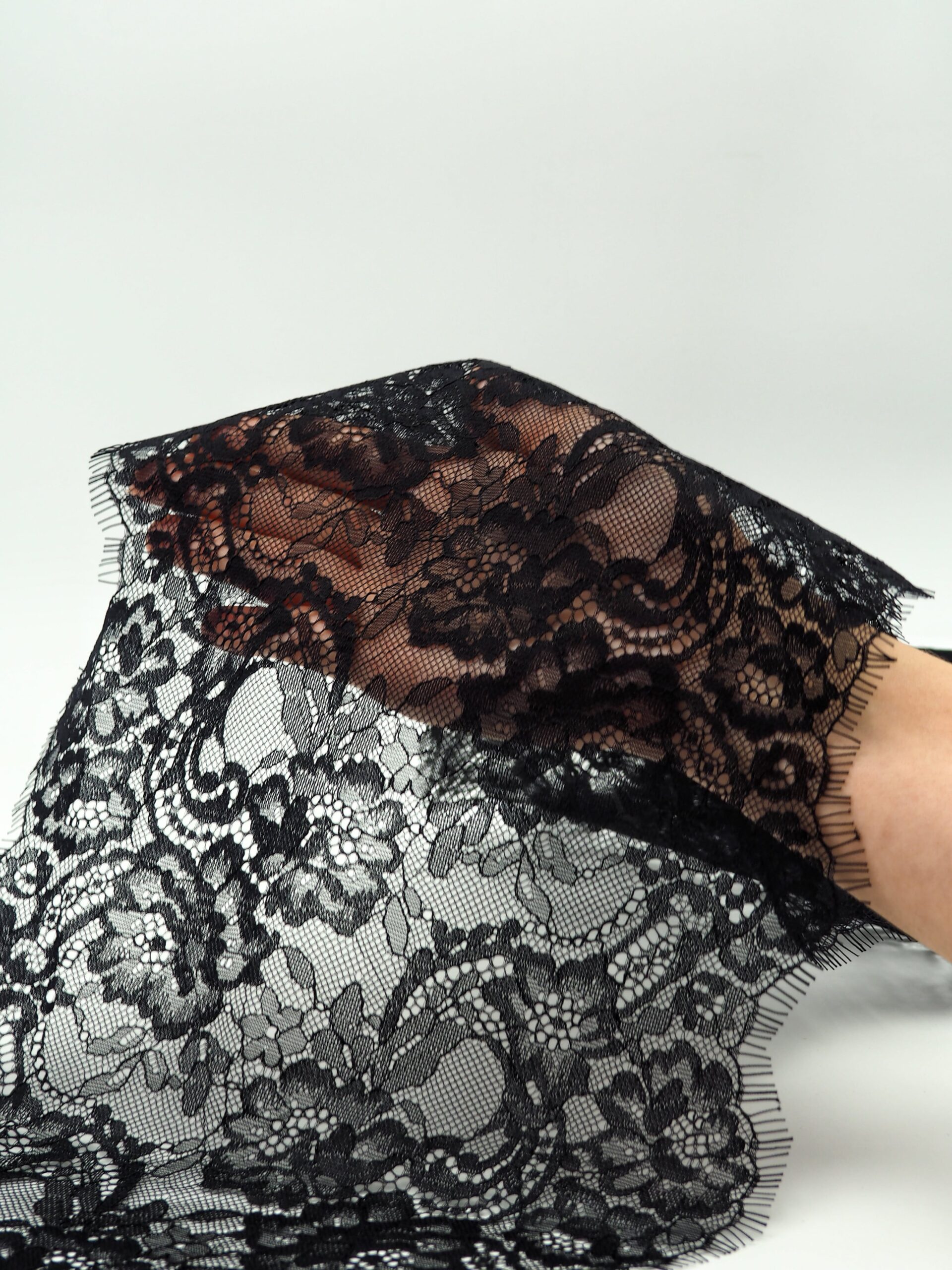 Французское кружево шантильи черное мягкий и тонкий материал. Он хорошо держит форму держит форму, почти не тянется, отличается высокой прочностью, весит очень мало и очень приятное на ощупь. Его используют для пошива и отделки вечерних и коктейльных платьев, свадебных нарядов, нижнего белья. Даже небольшие ажурные вставки придают изделию утонченность. Украсьте французским кружевом блузку, лиф платья, любое изделие из денима, и вы убедитесь, насколько элегантно смотрится такой материал. Шантильи уместно не только на одежде, но и домашнем текстиле. Ажурную ткань применяют для украшения скатертей и салфеток, занавесок.