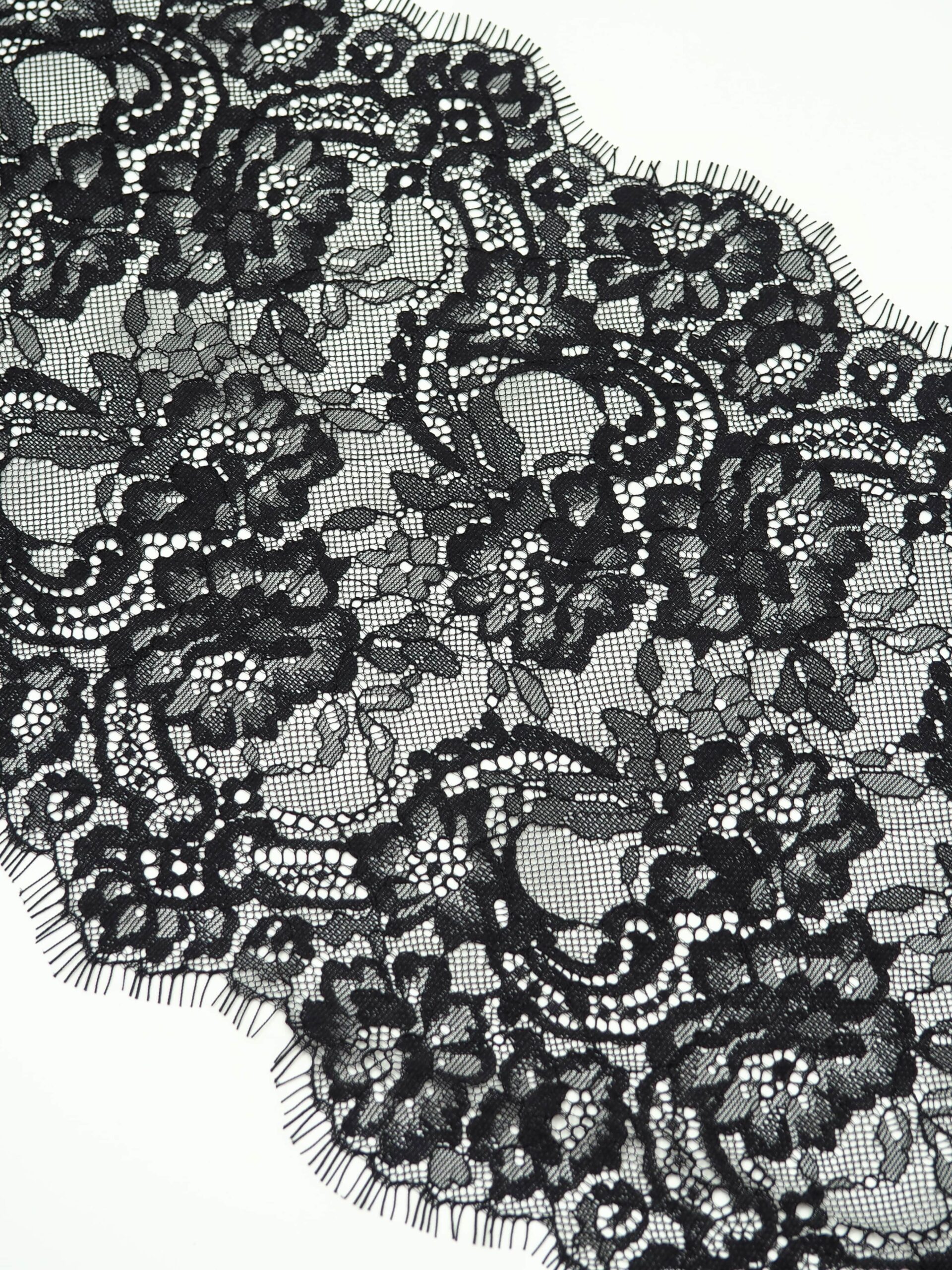 Шантильи кружево с ресничками без эластана с цветочным рисунком черного оттенка.