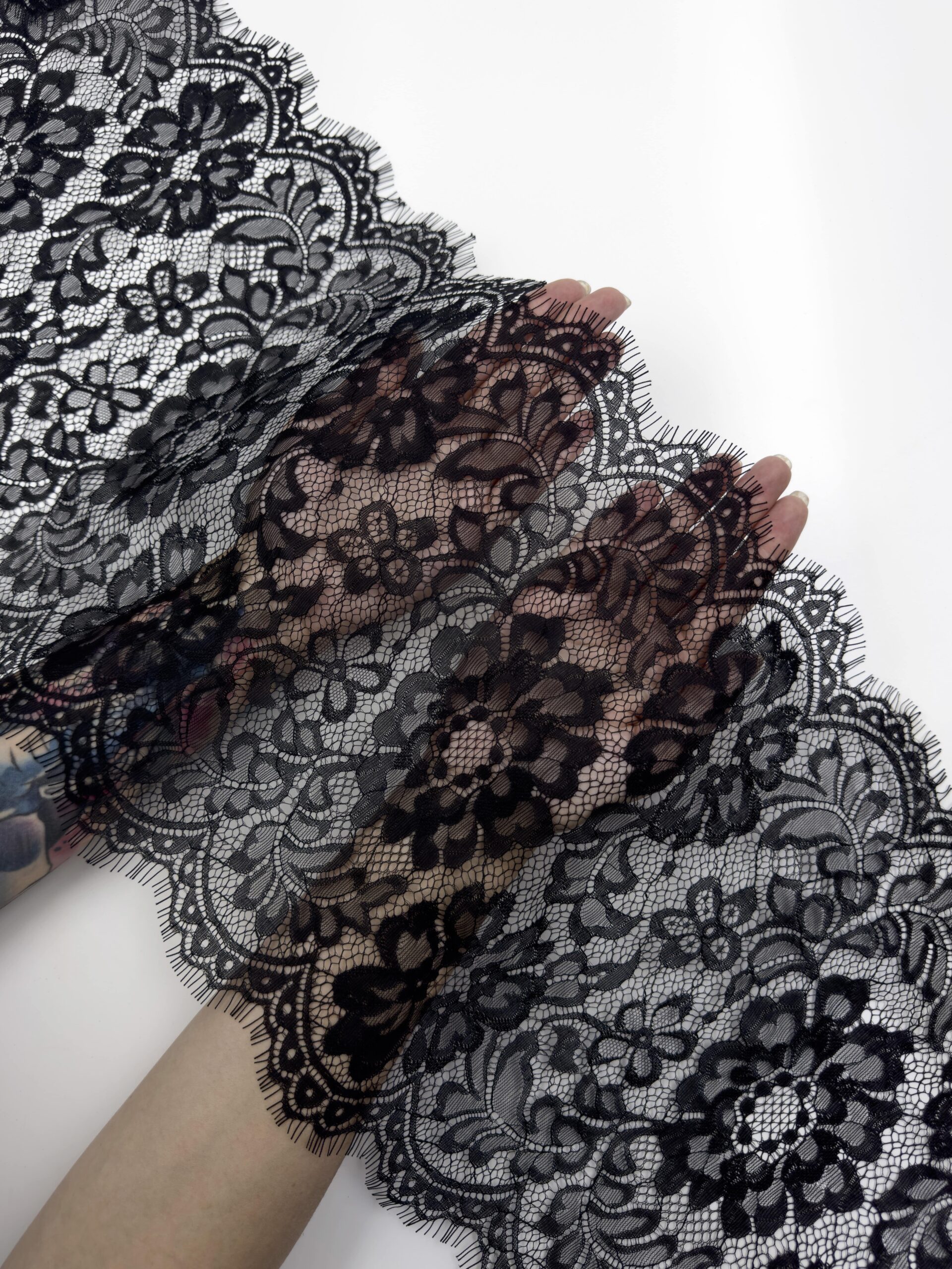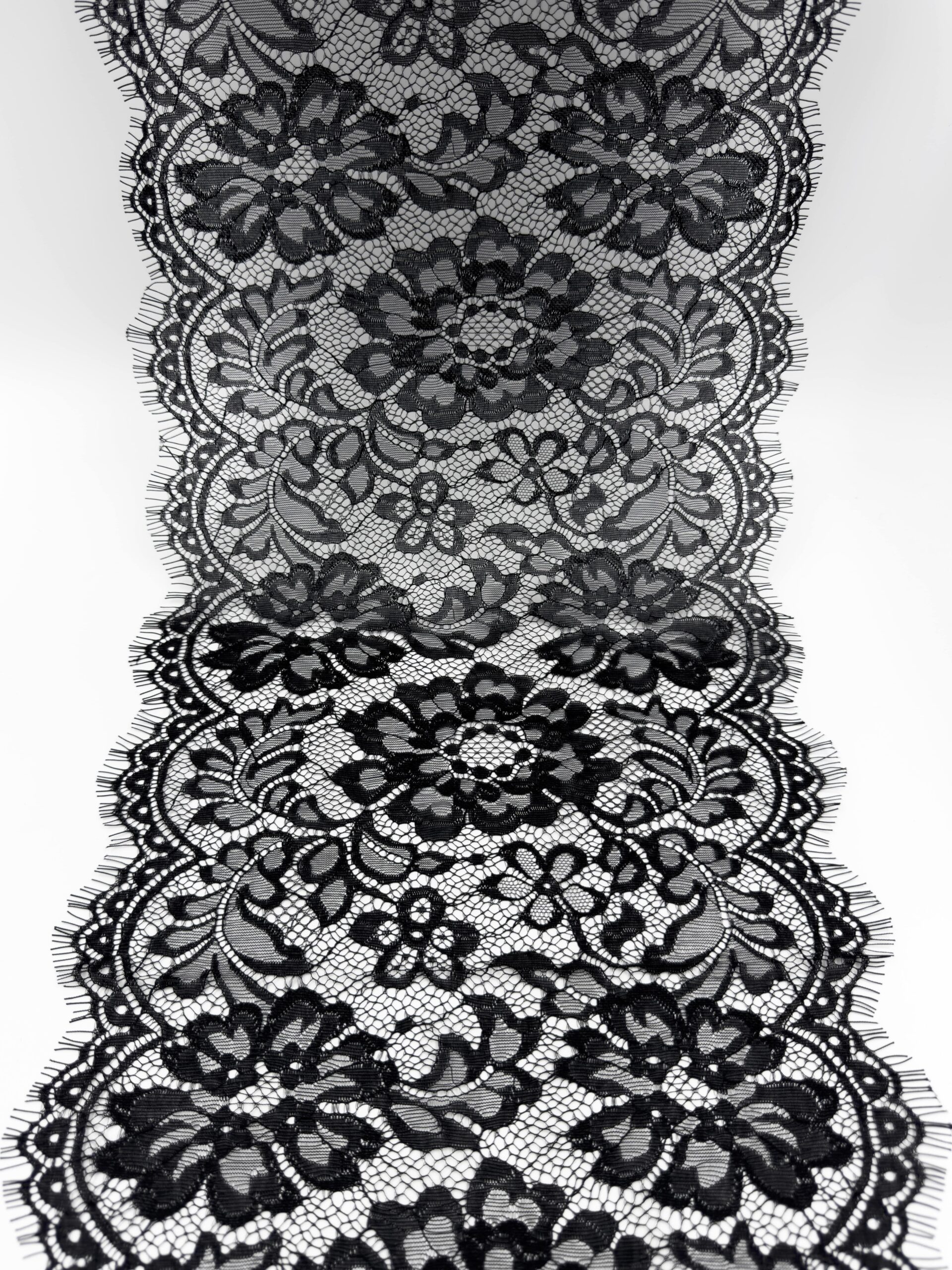 Шантильи кружево черное с ресничками без эластана с цветочным рисунком. БРАК 1-2 дырочки на купон.