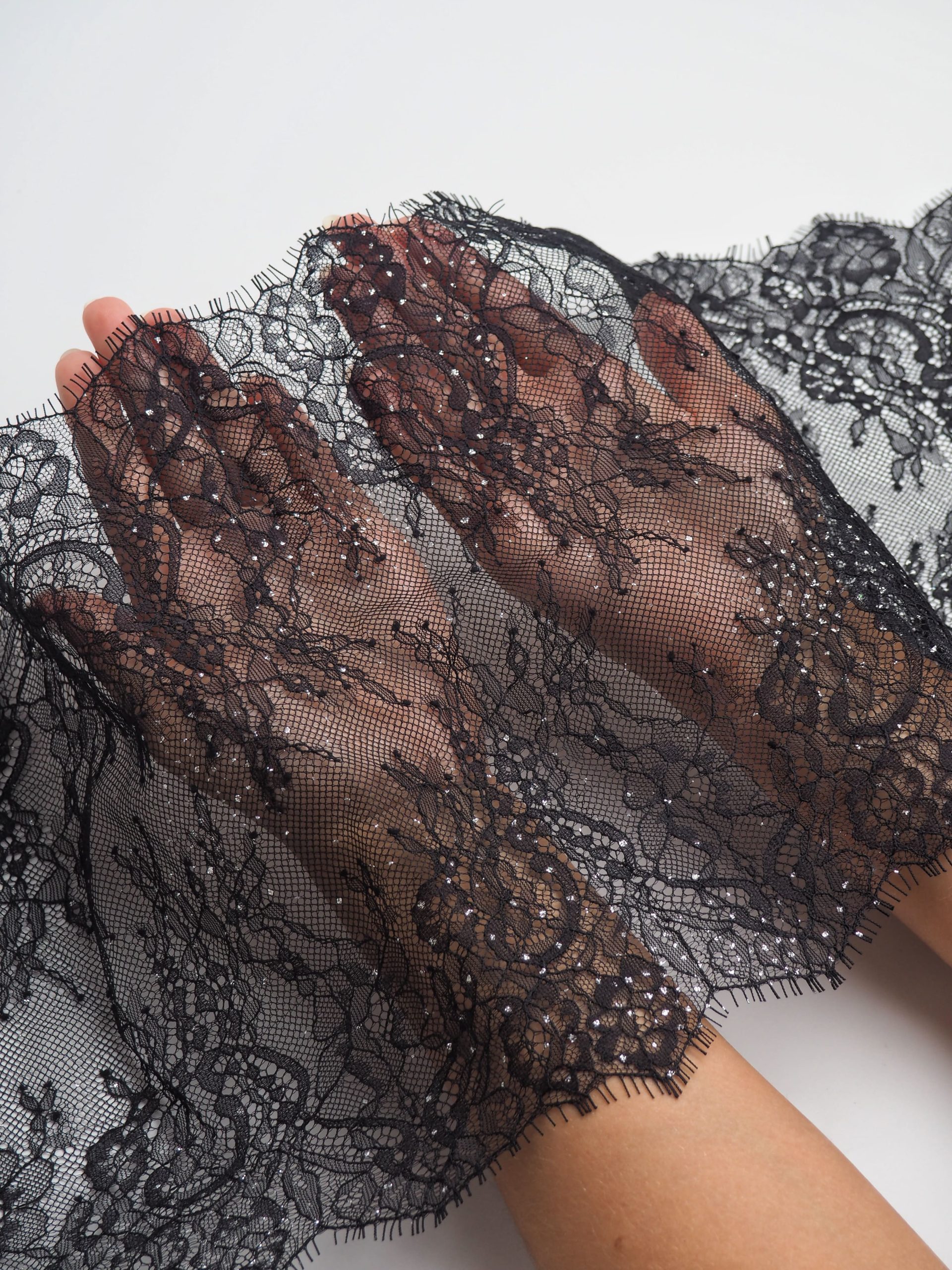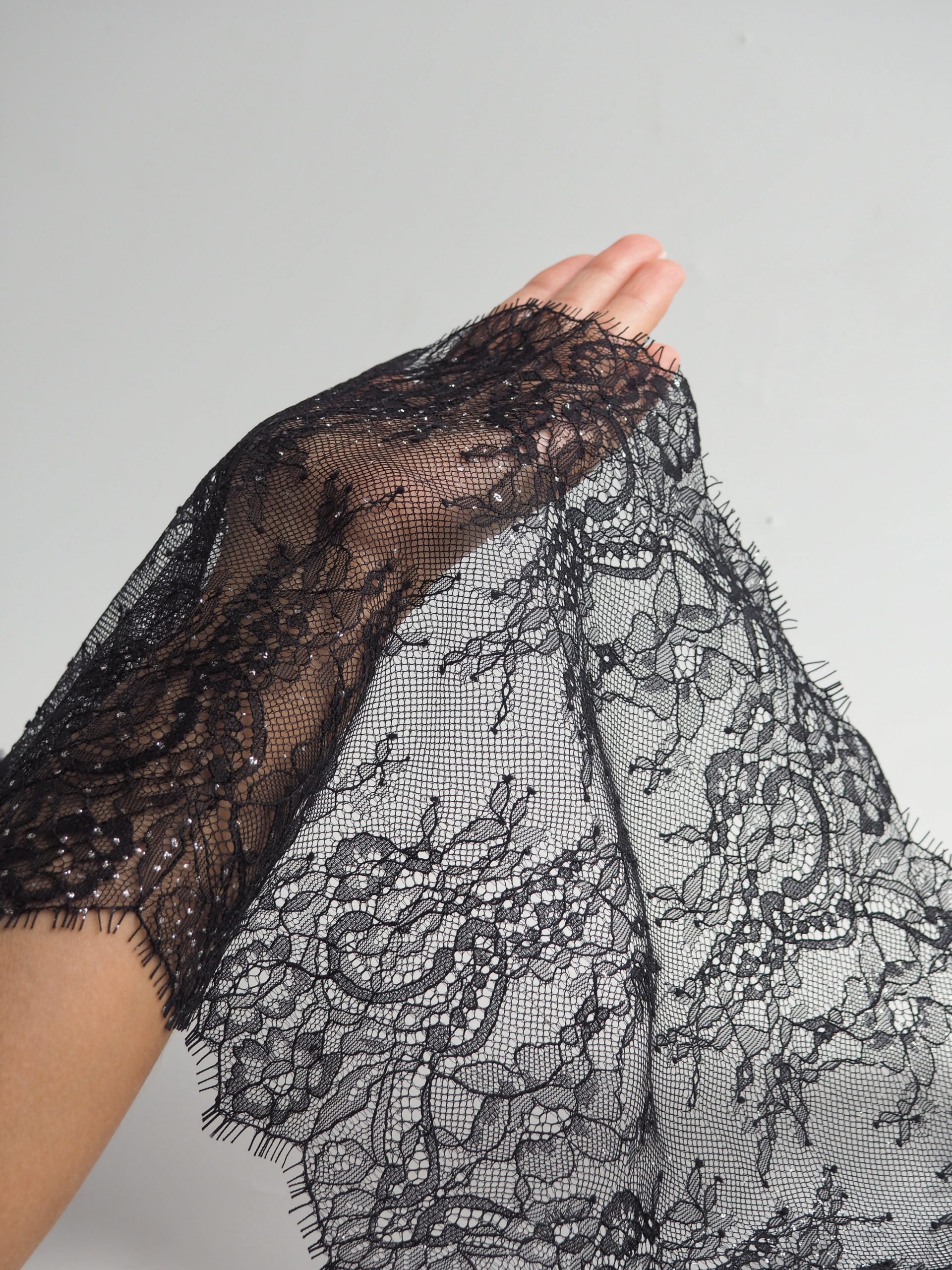 Шантильи кружево без эластана с цветочным рисунком черного оттенка с серебристыми блестками.