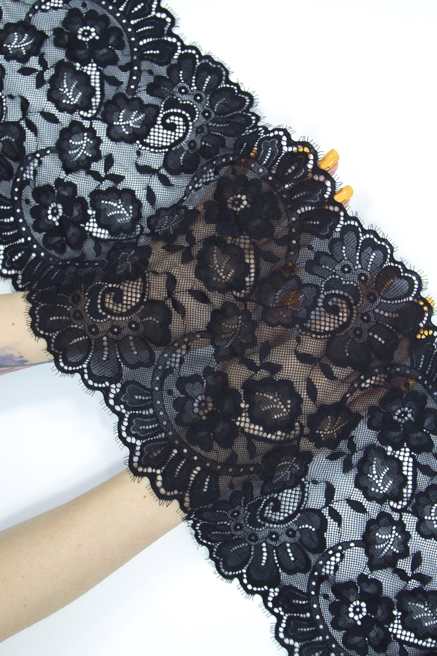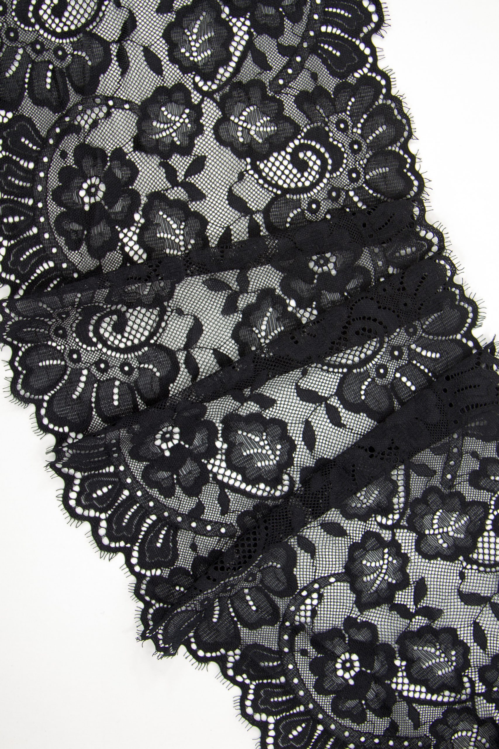 Кружево шантильи чёрное эластичное ширина 22 см ОТРЕЗ 0,93 м