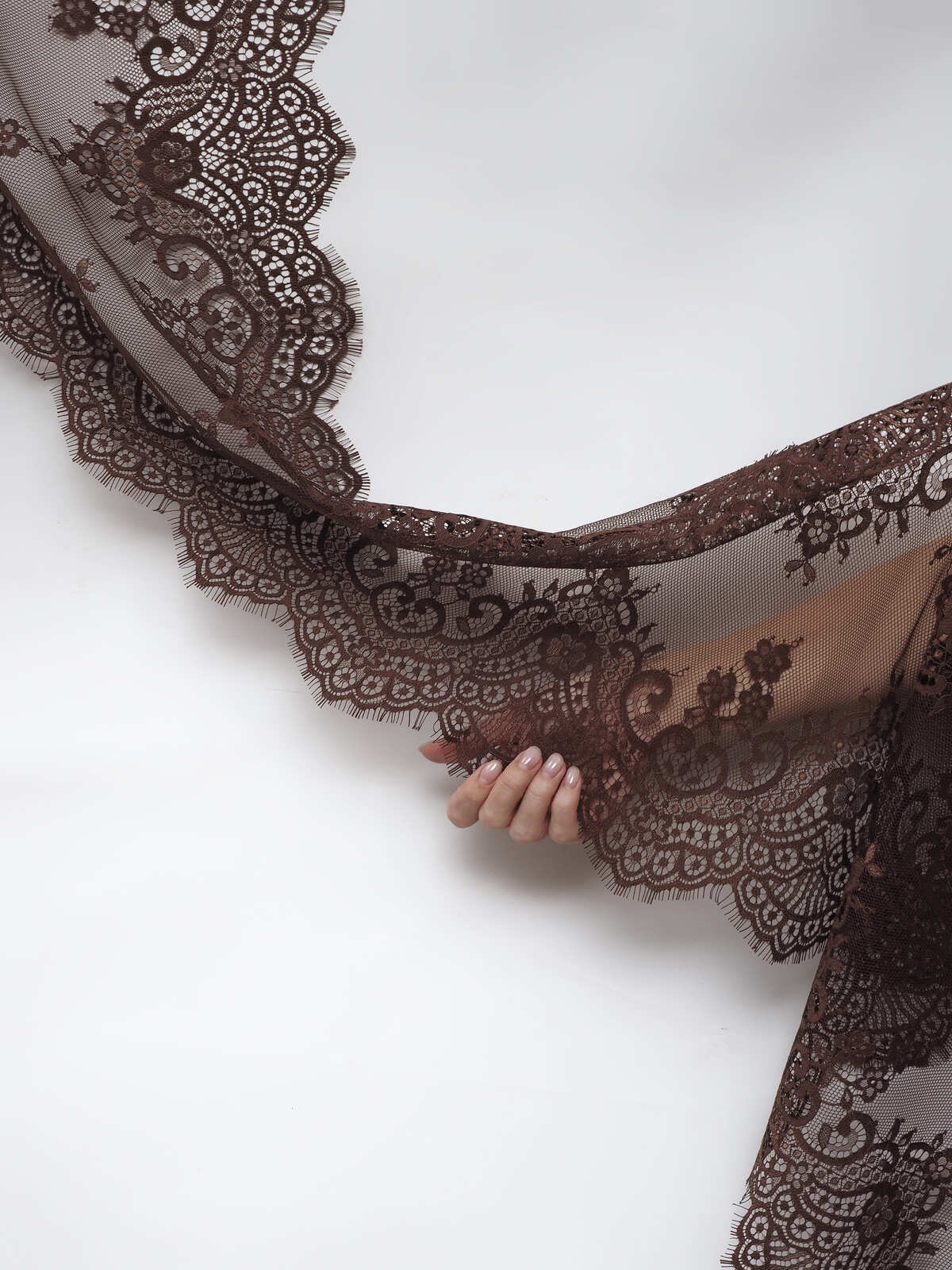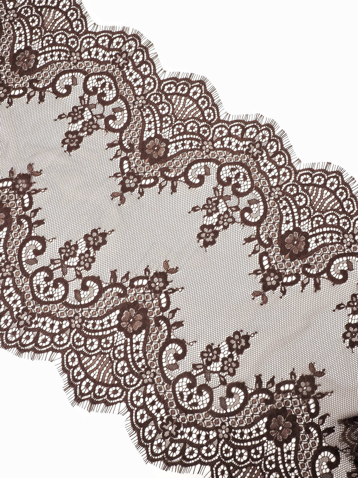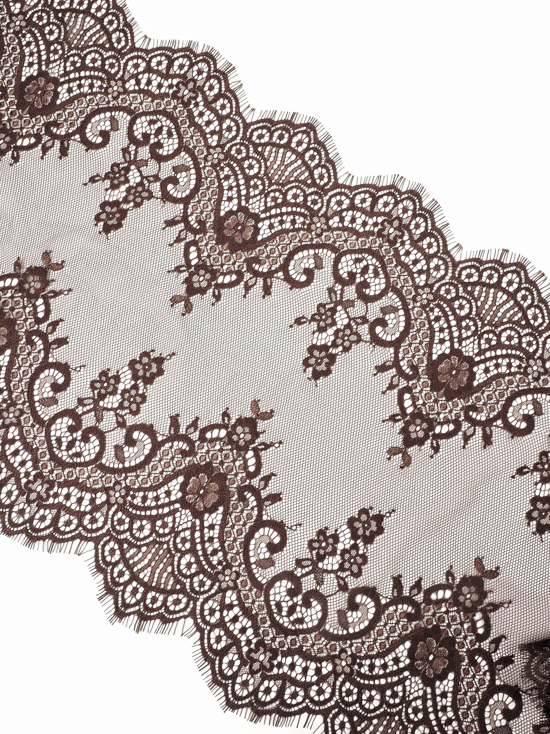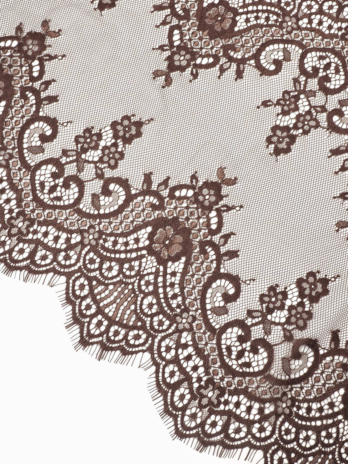 Шантильи кружево с ресничками без эластана с цветочным рисунком коричневого оттенка.