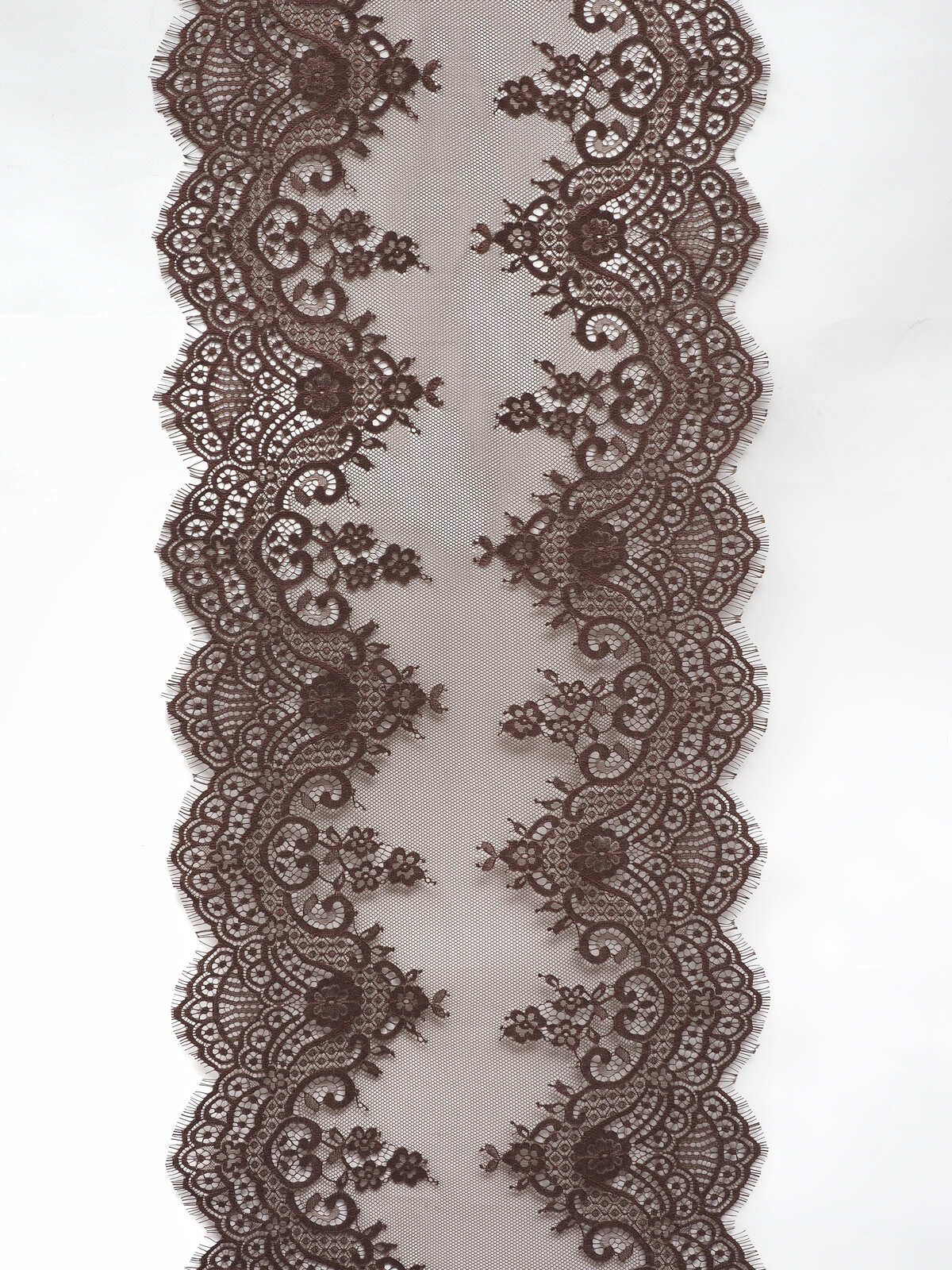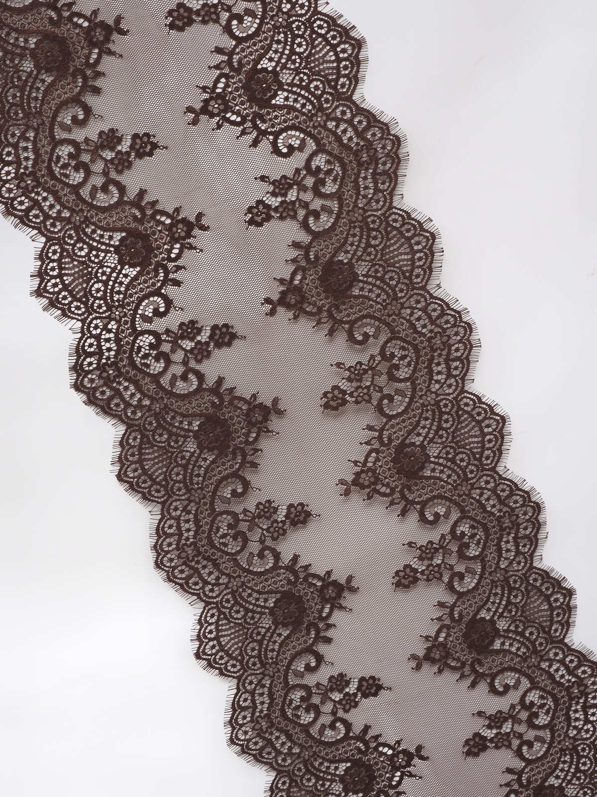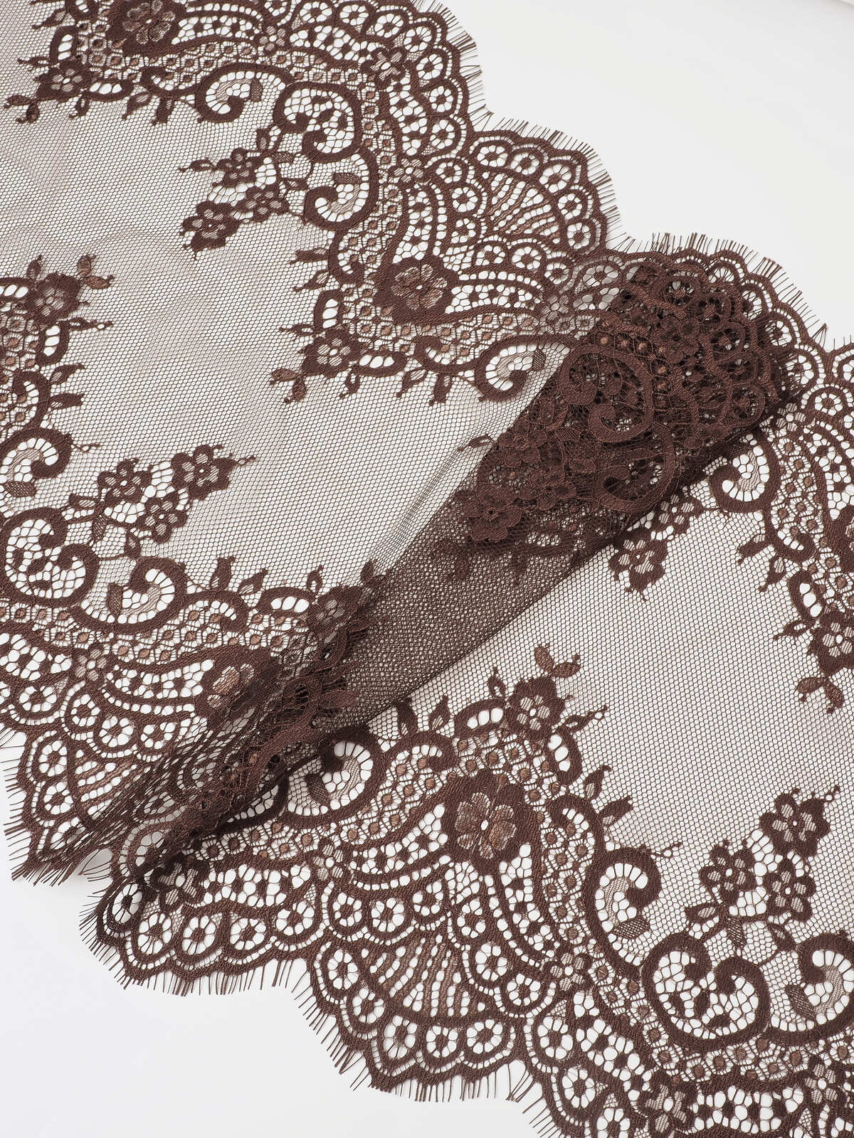 Шантильи кружево с ресничками без эластана с цветочным рисунком коричневого оттенка.