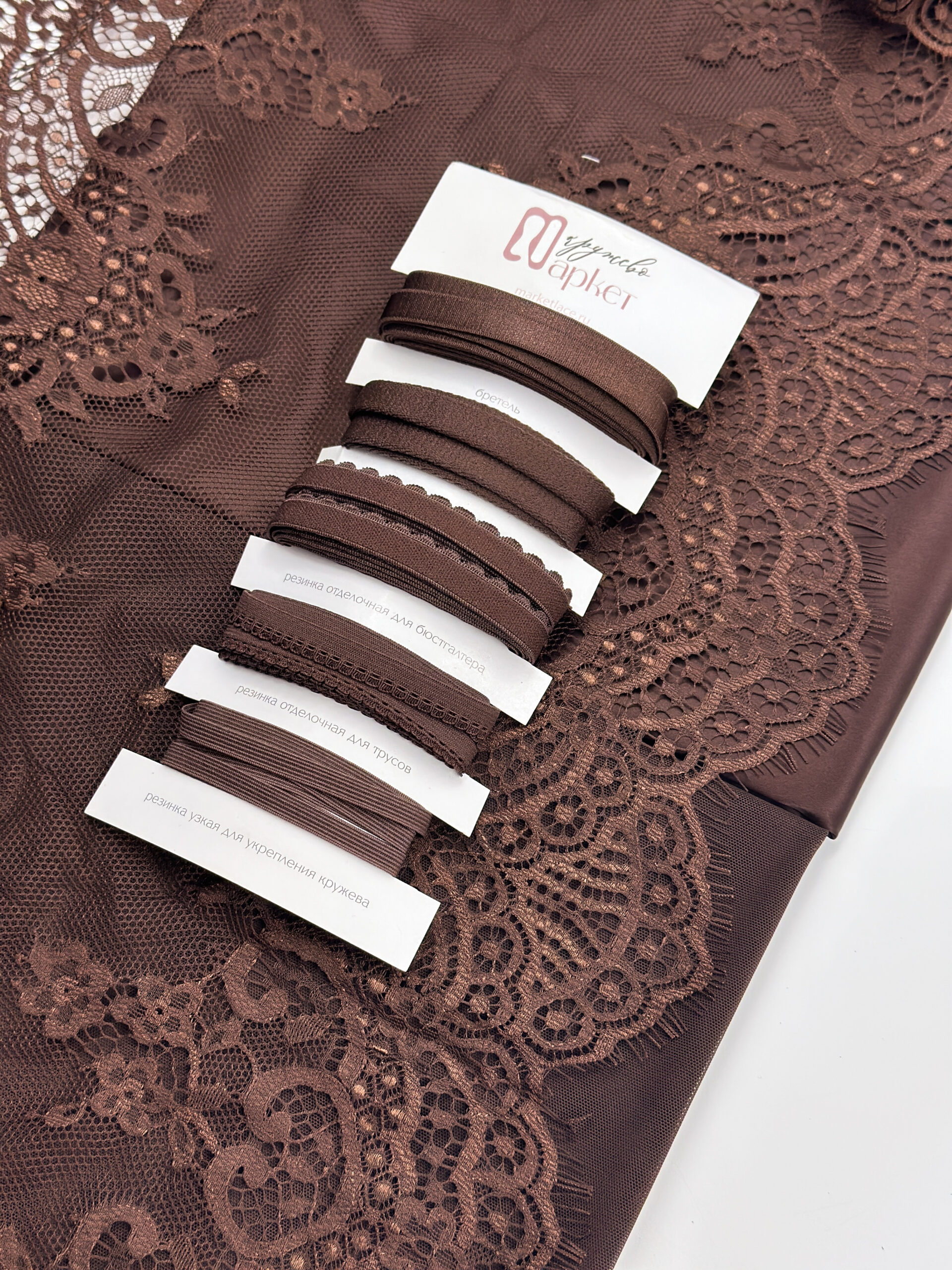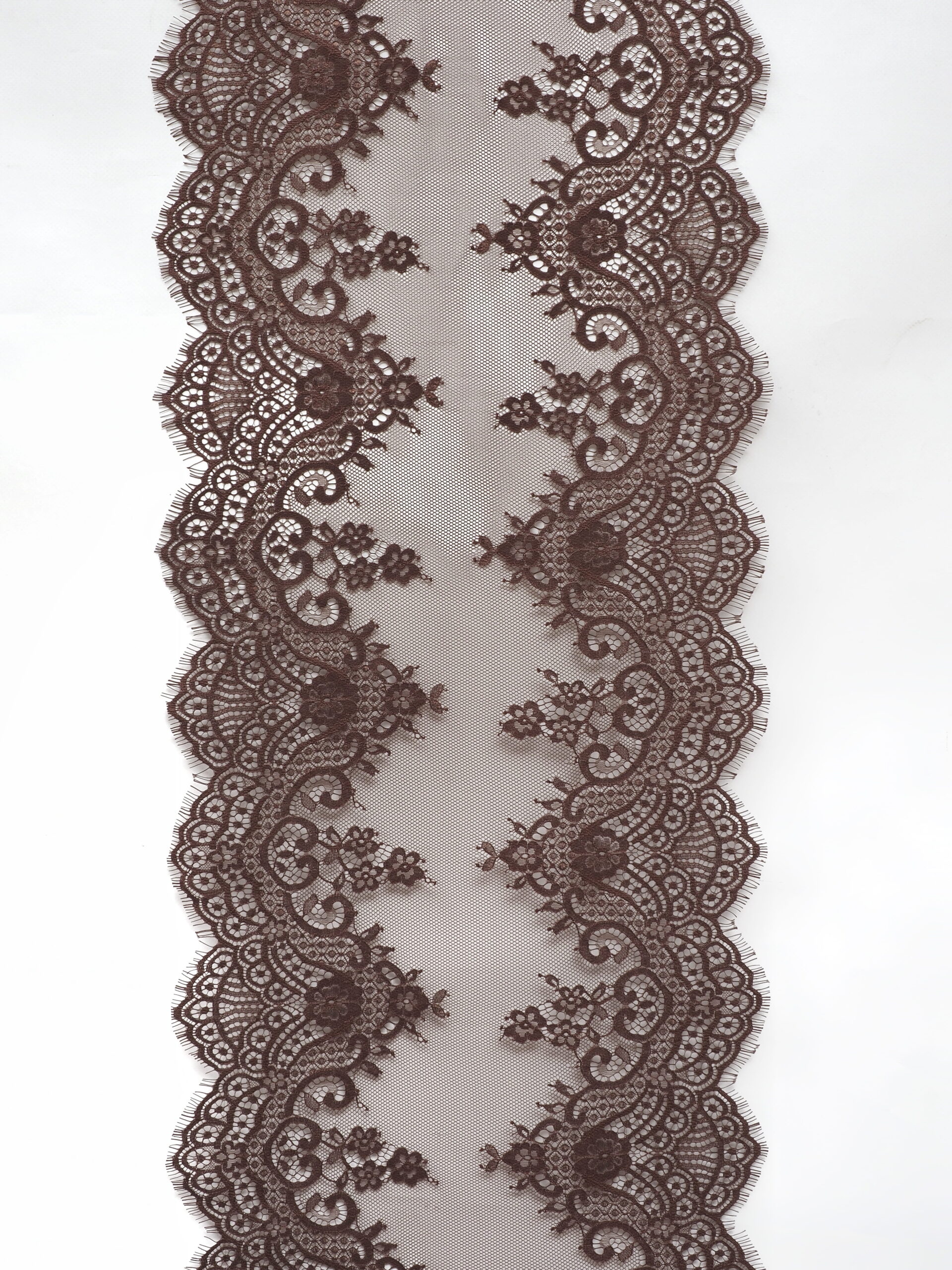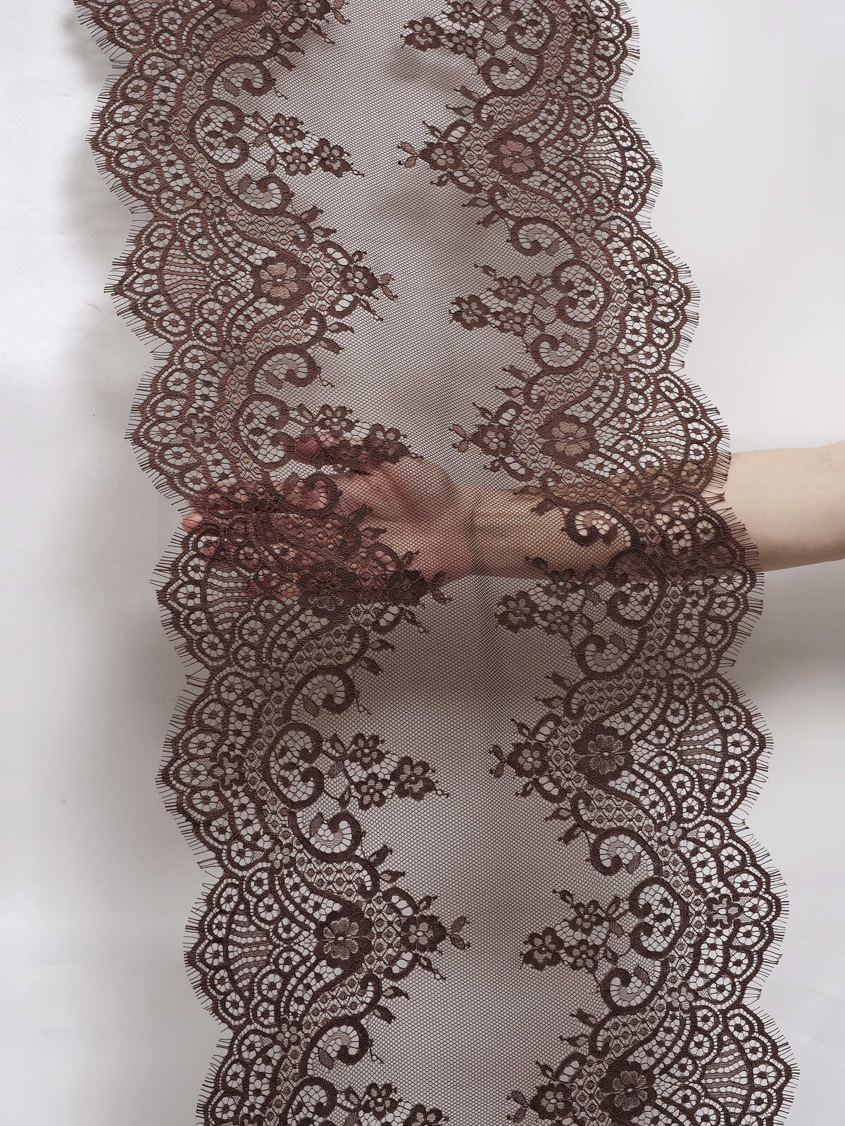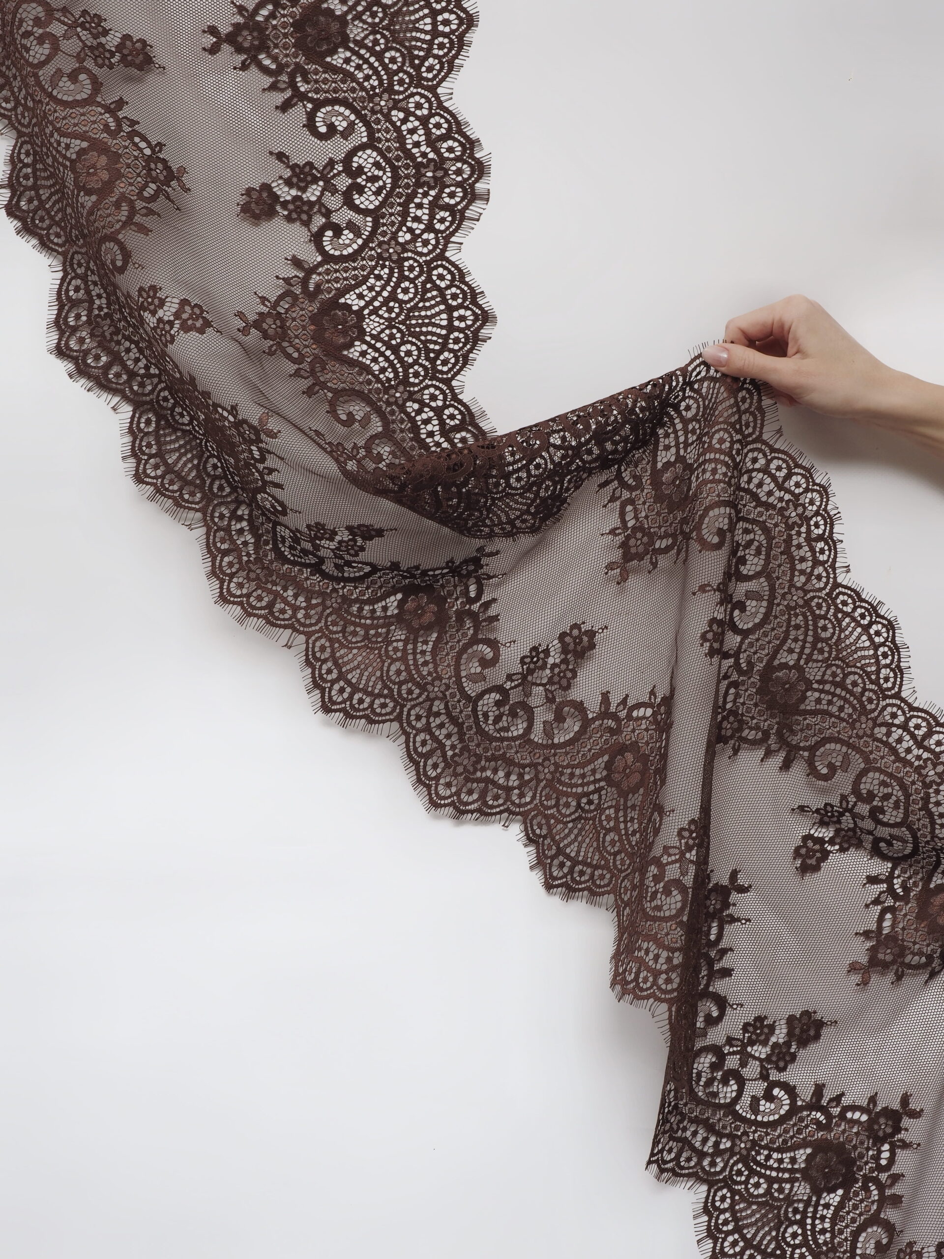 Шантильи кружево с ресничками без эластана с цветочным рисунком коричневого оттенка.