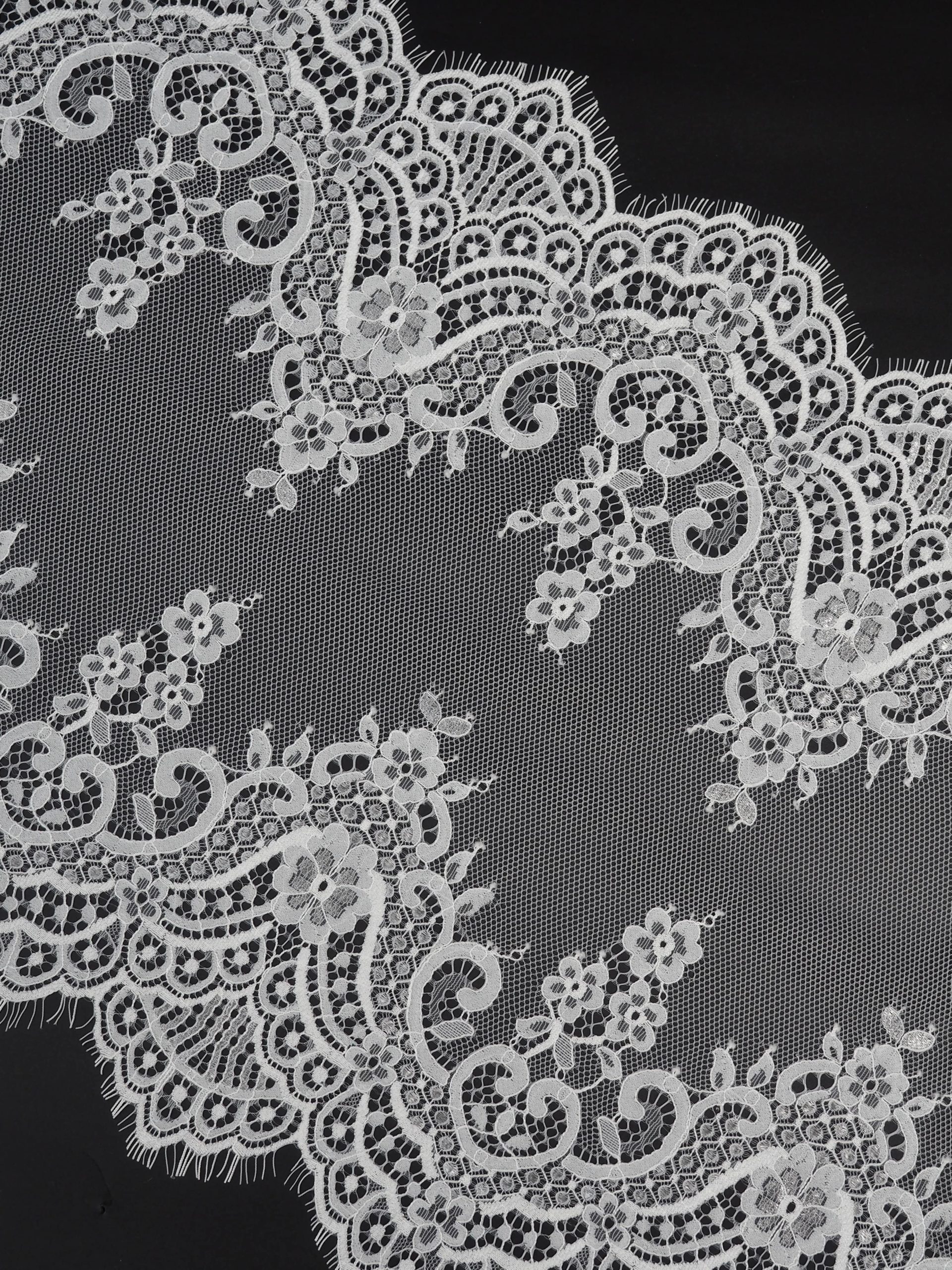 Шантильи кружево с ресничками без эластана с цветочным рисунком белого оттенка.