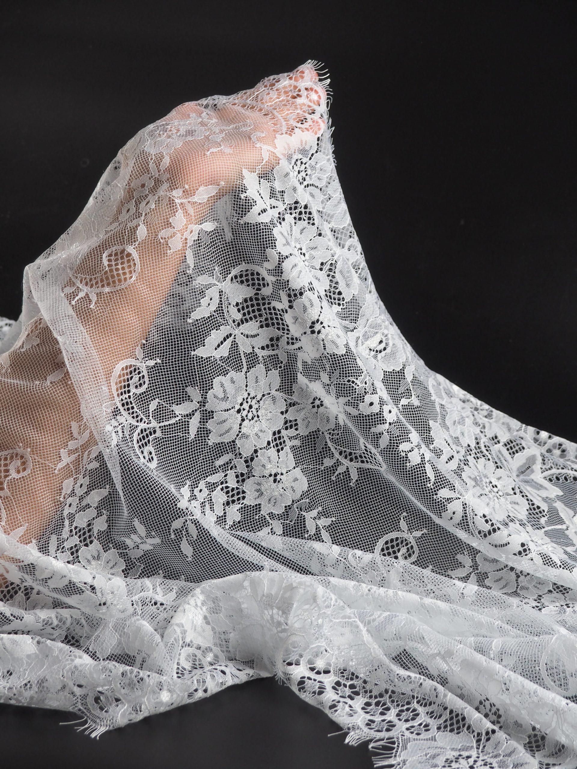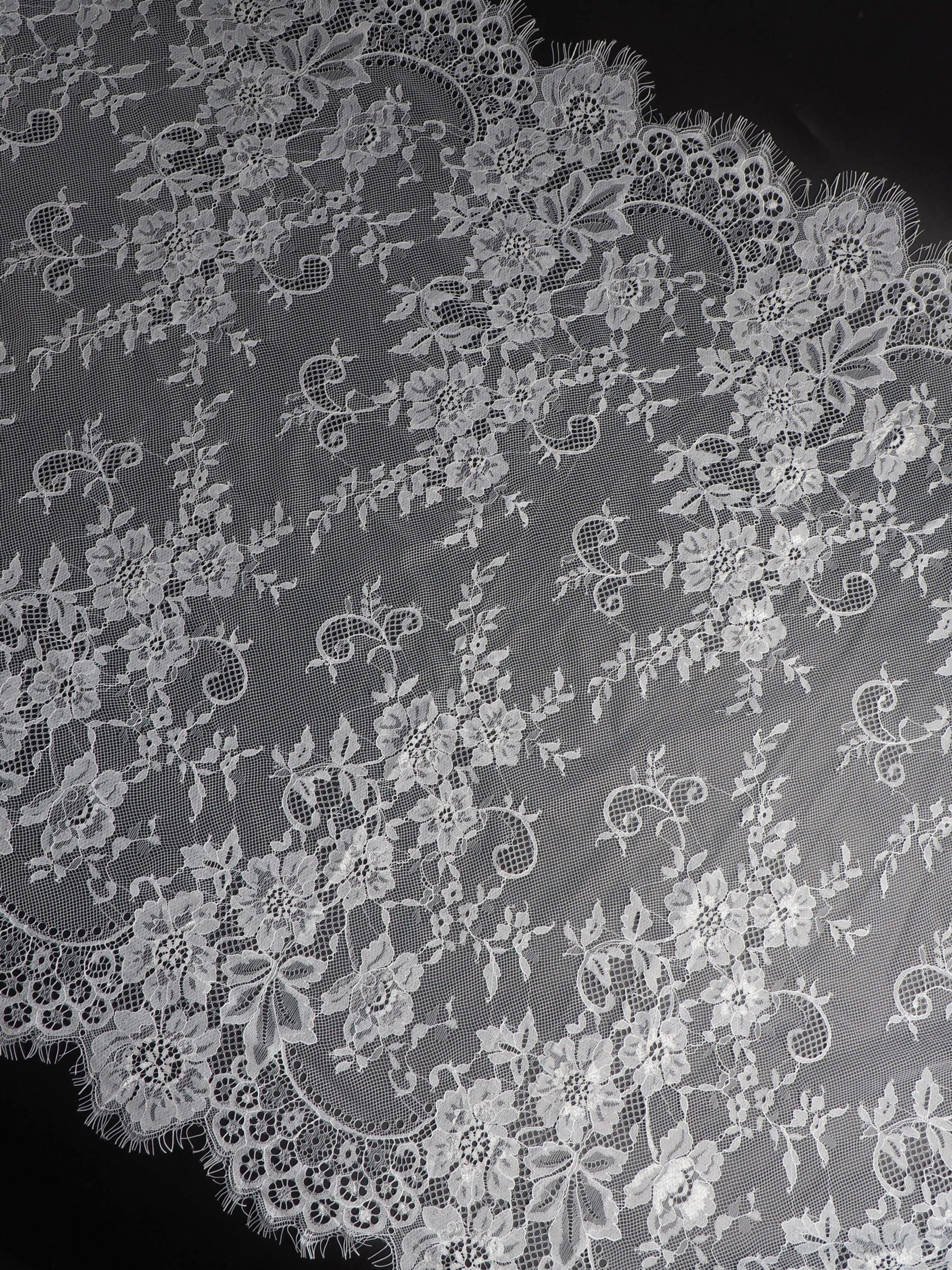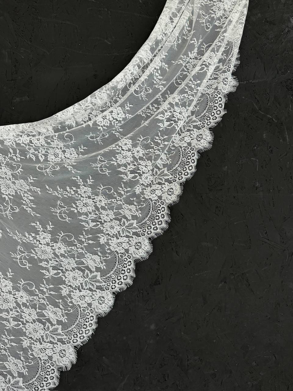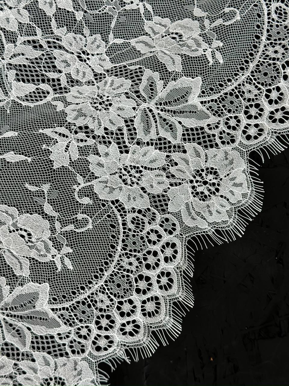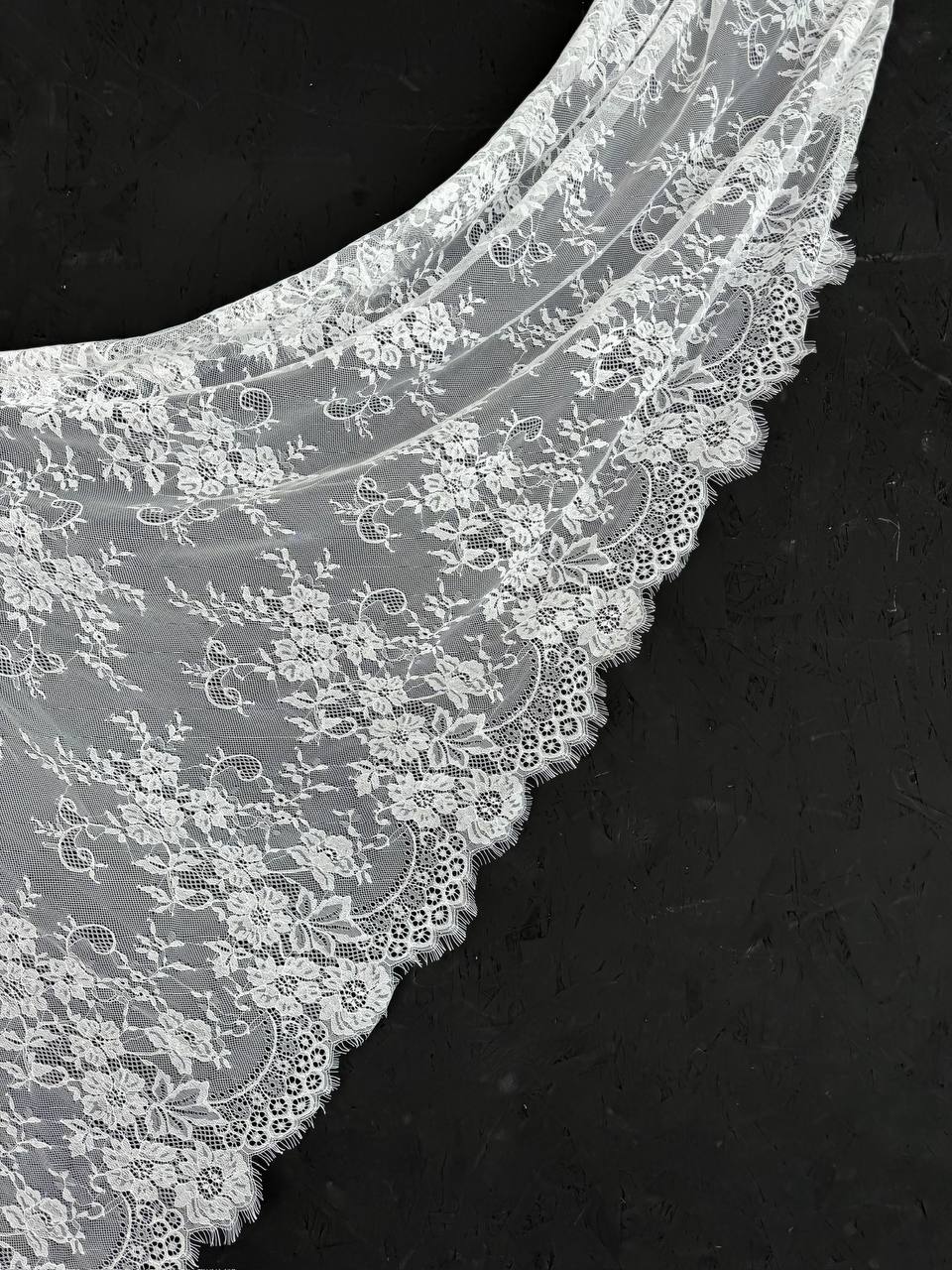 Французское кружево шантильи широкое теплое белое мягкий и тонкий материал. Он хорошо держит форму держит форму, почти не тянется, отличается высокой прочностью, весит очень мало и очень приятное на ощупь. Его используют для пошива и отделки вечерних и коктейльных платьев, свадебных нарядов, нижнего белья. Даже небольшие ажурные вставки придают изделию утонченность. Украсьте французским кружевом блузку, лиф платья, любое изделие из денима, и вы убедитесь, насколько элегантно смотрится такой материал. Шантильи уместно не только на одежде, но и домашнем текстиле. Ажурную ткань применяют для украшения скатертей и салфеток, занавесок.