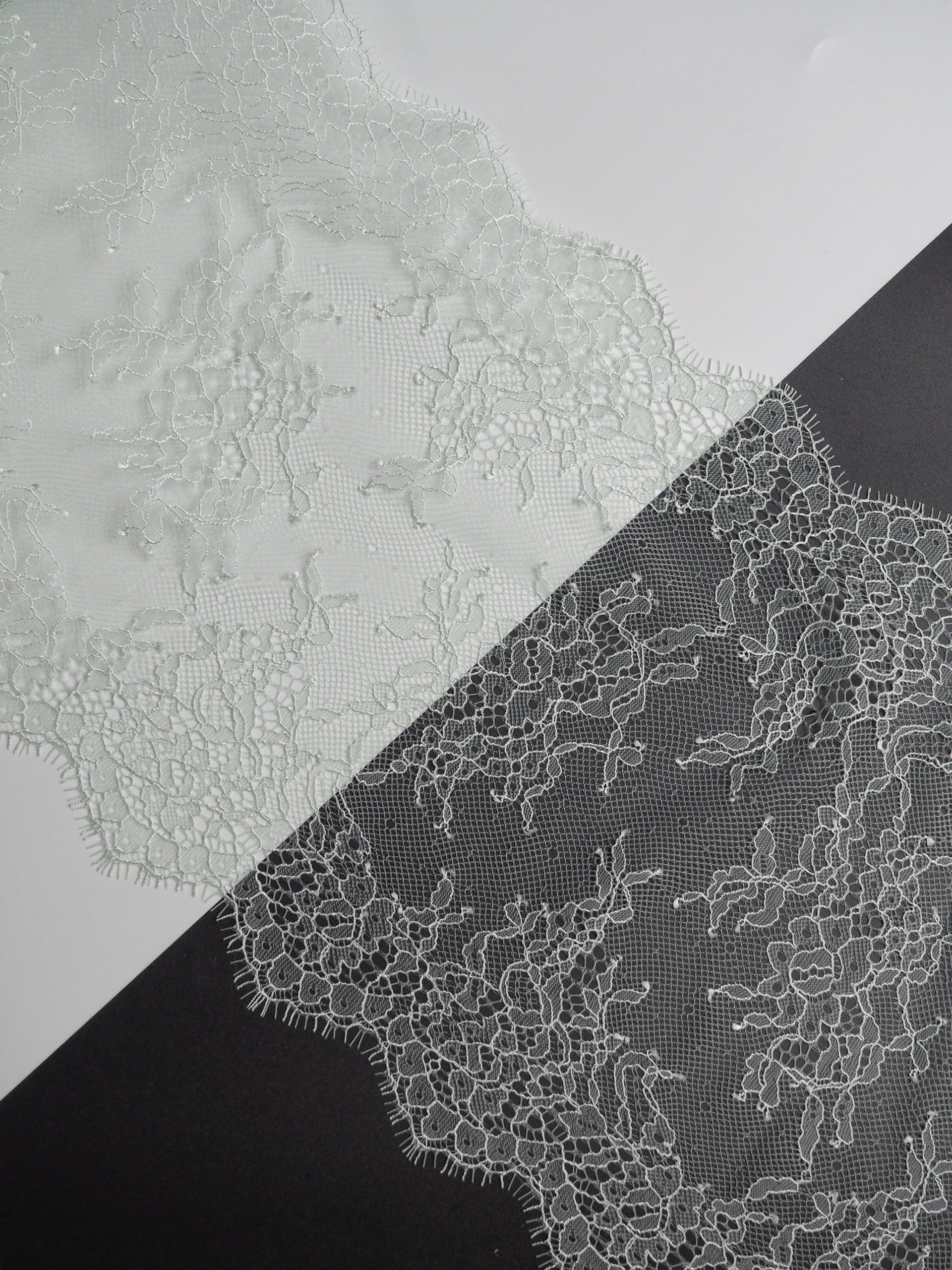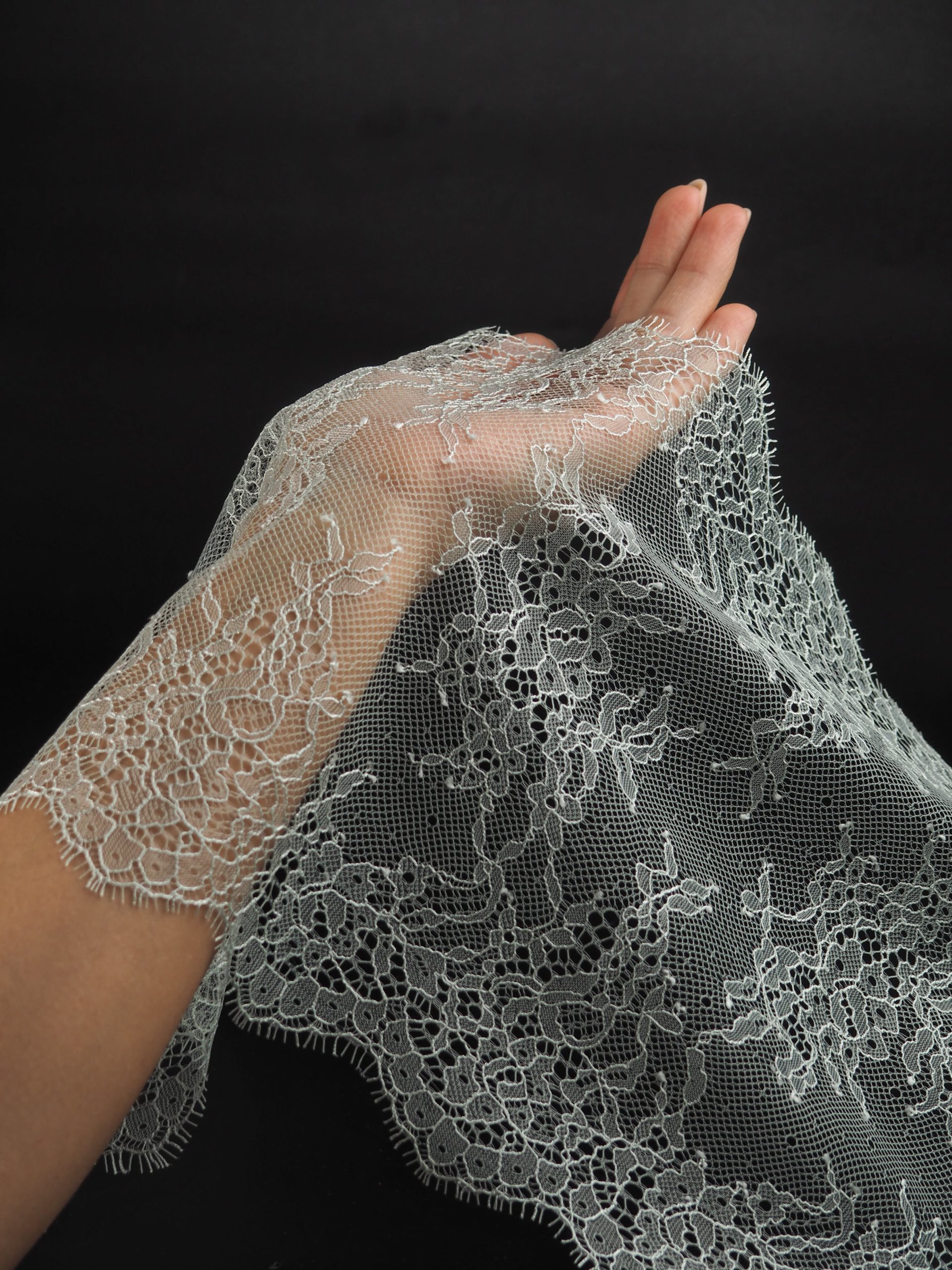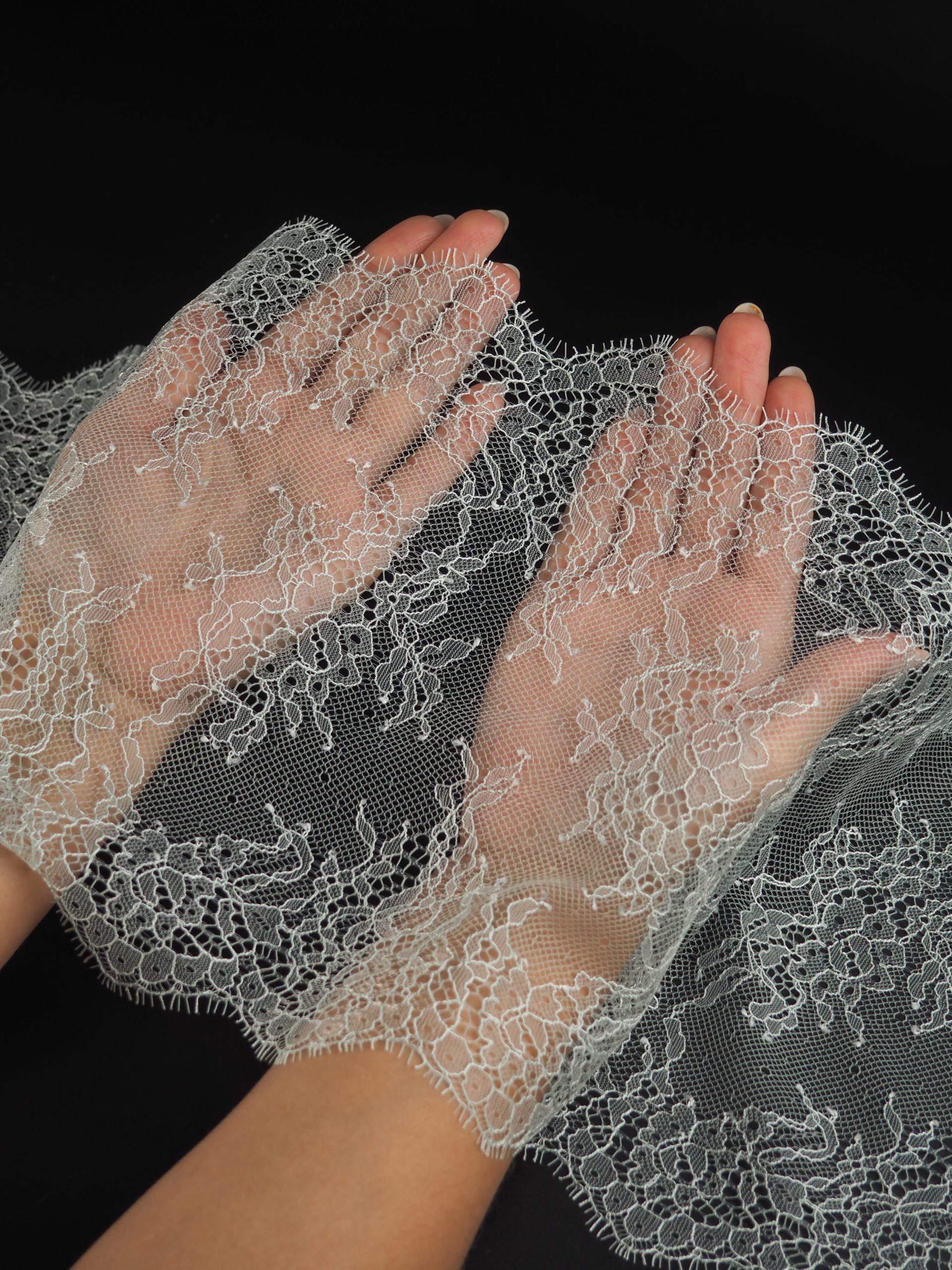 Французское кружево шантильи дымчатый ментол мягкий и тонкий материал. Он хорошо держит форму, почти не тянется, отличается высокой прочностью, весит очень мало и очень приятное на ощупь. Его используют для пошива и отделки вечерних и коктейльных платьев, свадебных нарядов, нижнего белья. Даже небольшие ажурные вставки придают изделию утонченность. Украсьте французским кружевом блузку, лиф платья, любое изделие из денима, и вы убедитесь, насколько элегантно смотрится такой материал. Шантильи уместно не только на одежде, но и домашнем текстиле. Ажурную ткань применяют для украшения скатертей и салфеток, занавесок.