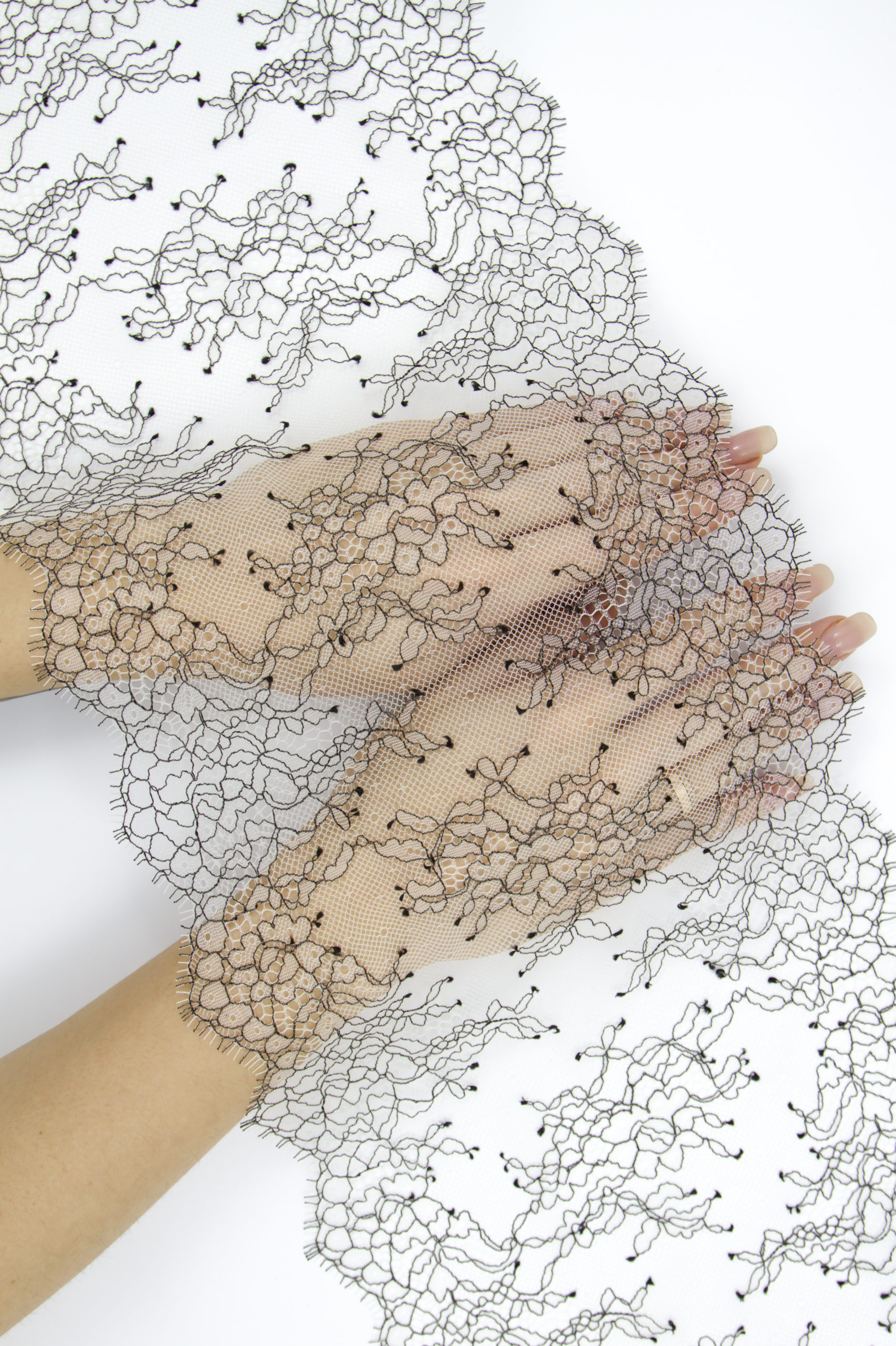 Французское кружево шантильи экрю с черной нитью мягкий и тонкий материал. Он хорошо держит форму держит форму, почти не тянется, отличается высокой прочностью, весит очень мало и очень приятное на ощупь. Его используют для пошива и отделки вечерних и коктейльных платьев, свадебных нарядов, нижнего белья. Даже небольшие ажурные вставки придают изделию утонченность. Украсьте французским кружевом блузку, лиф платья, любое изделие из денима, и вы убедитесь, насколько элегантно смотрится такой материал. Шантильи уместно не только на одежде, но и домашнем текстиле. Ажурную ткань применяют для украшения скатертей и салфеток, занавесок.