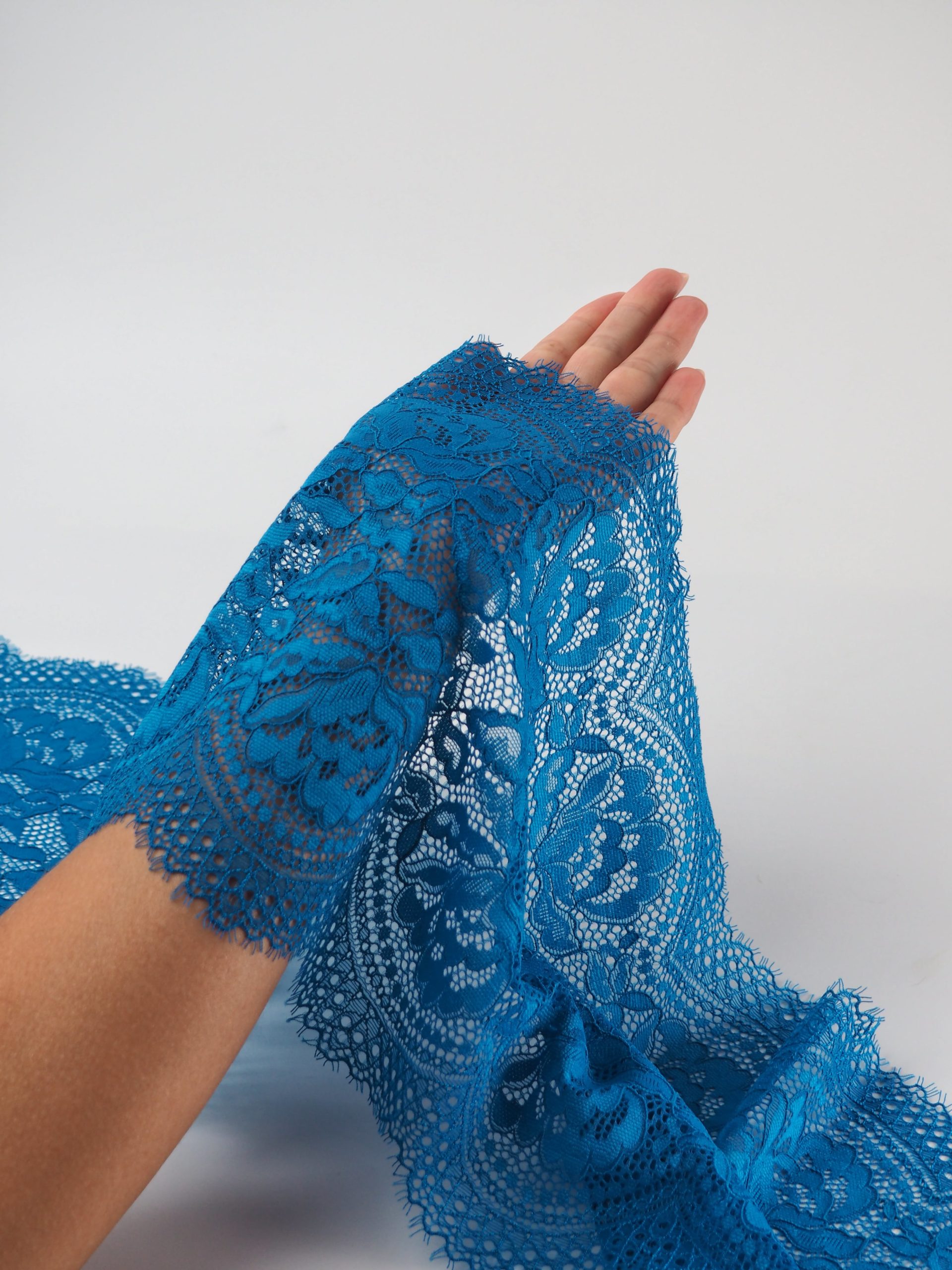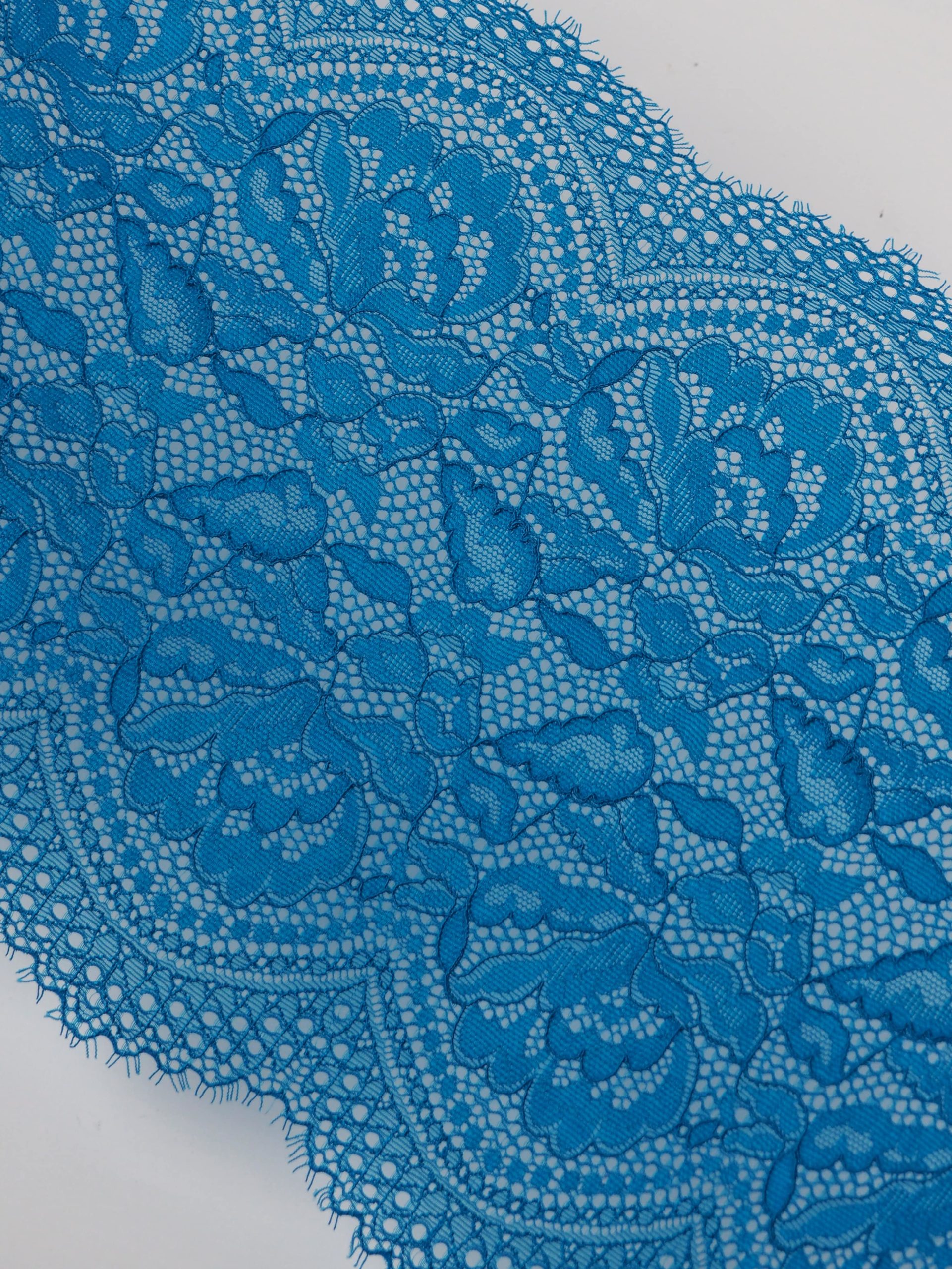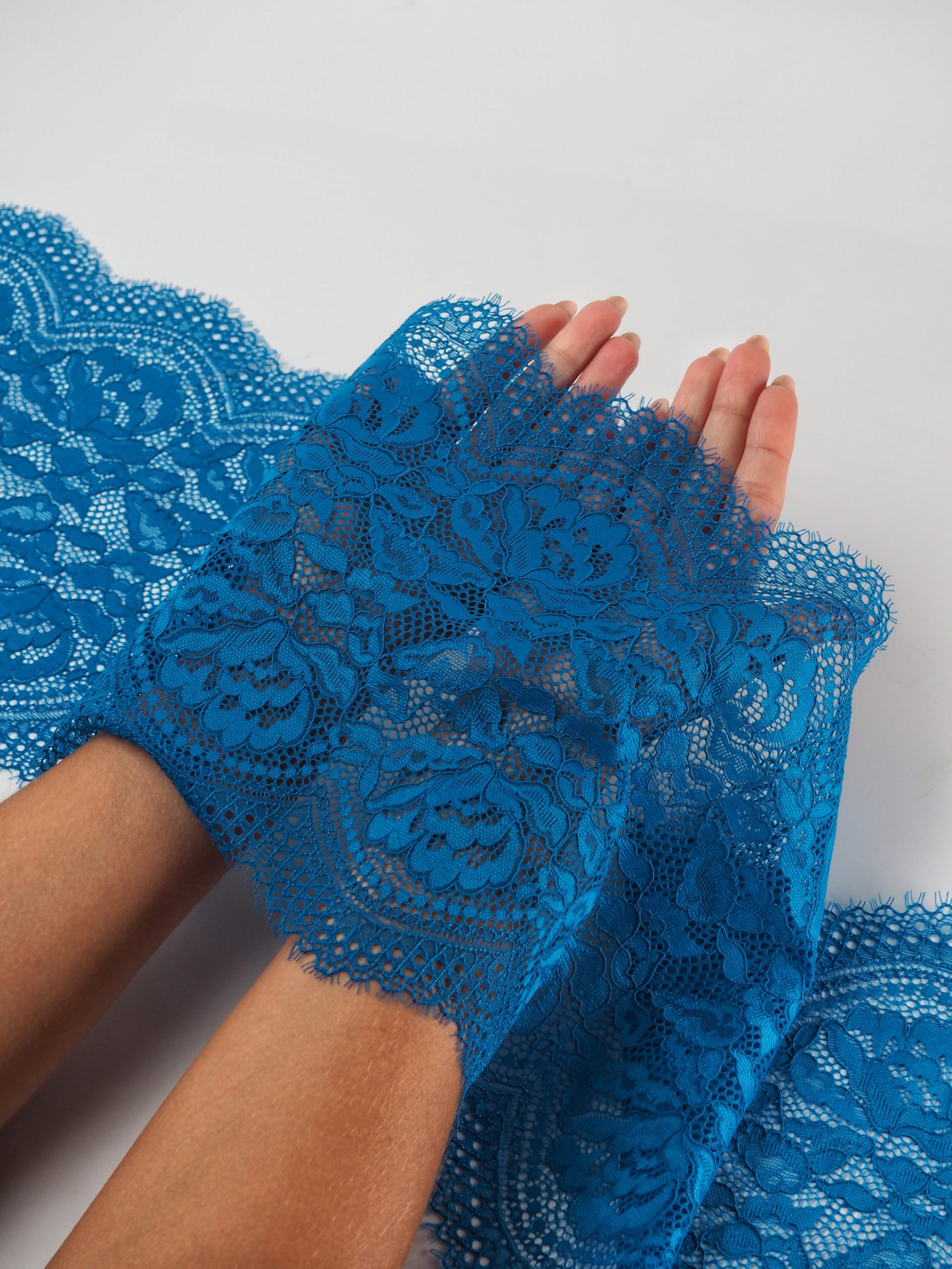 Шантильи стрейч кружево эластичное синего оттенка с цветочным рисунком.