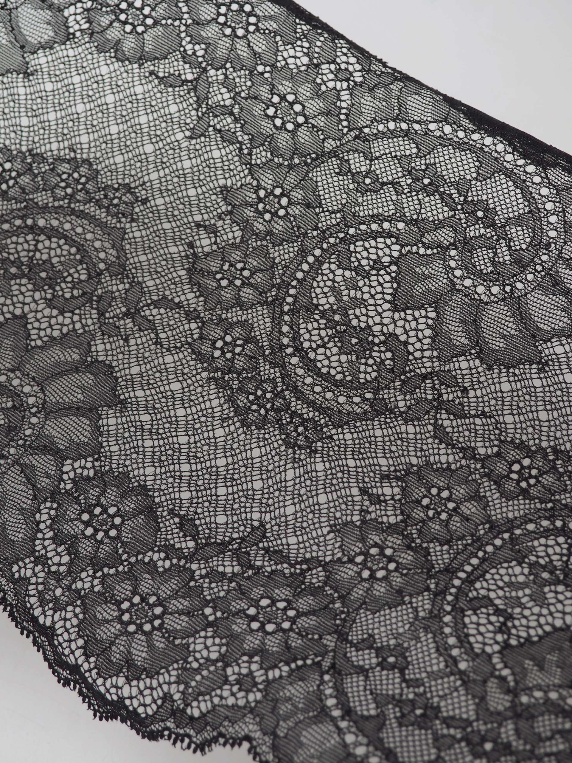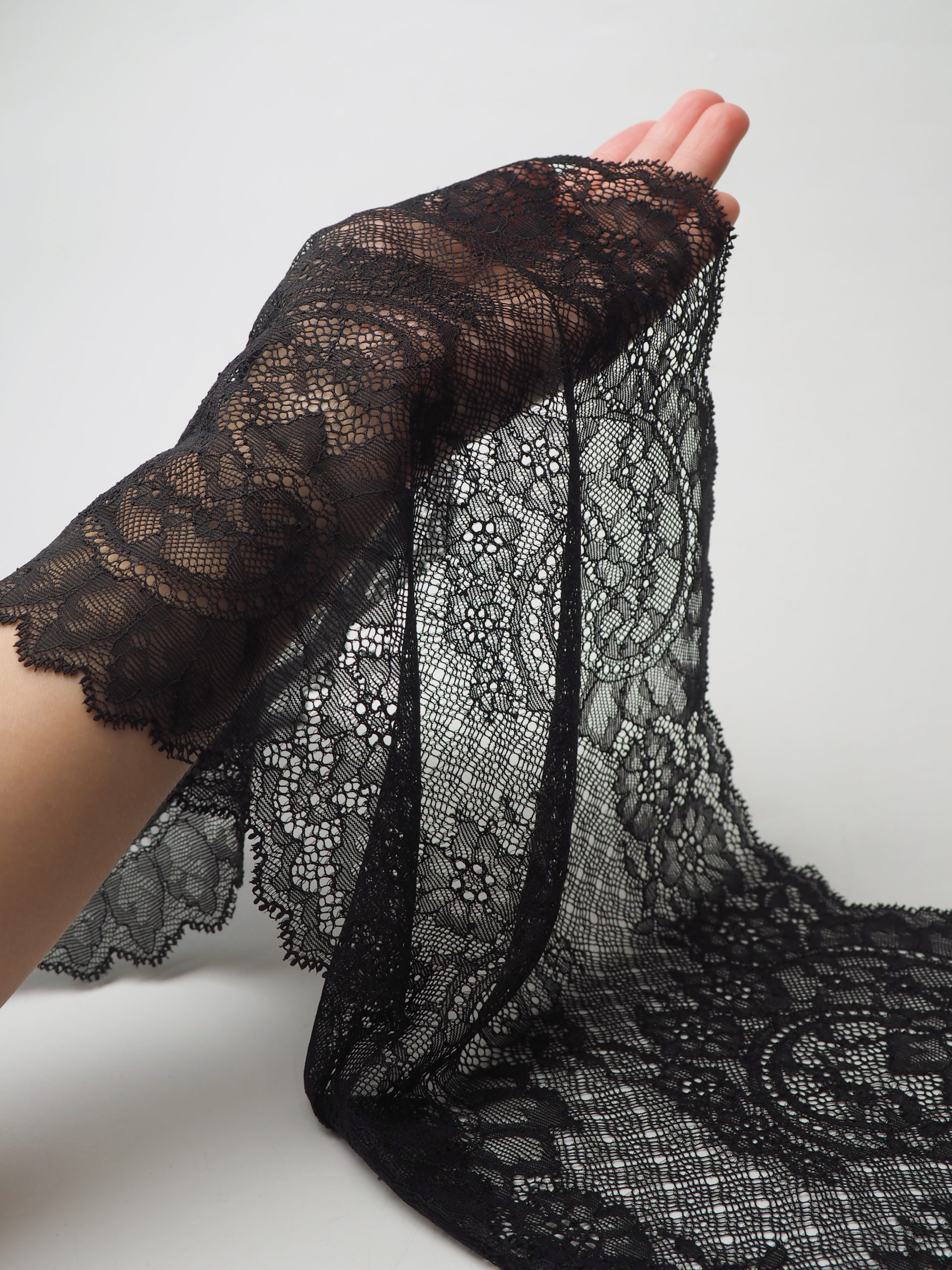 Шантильи кружево эластичное черное с цветочным рисунком.