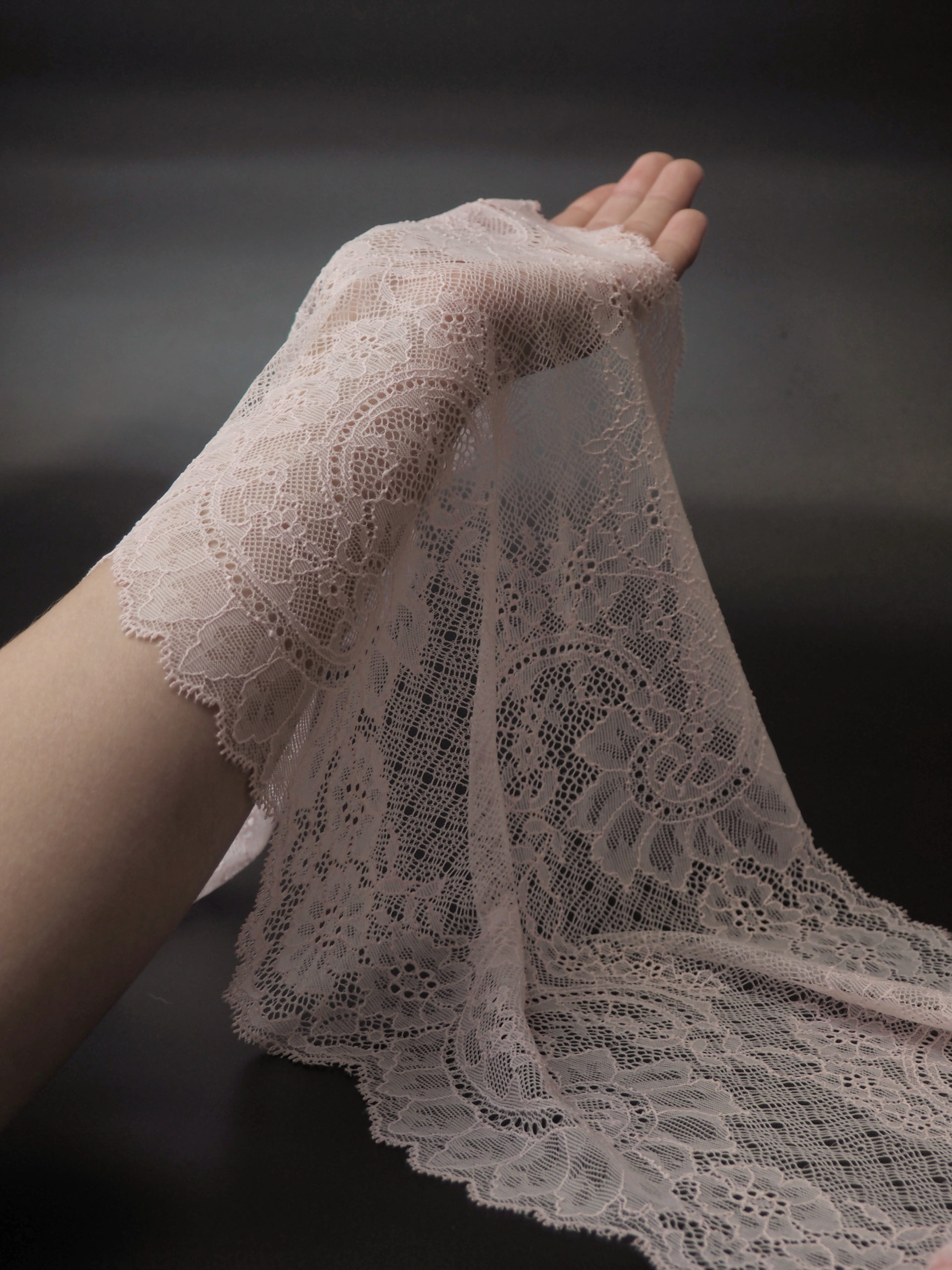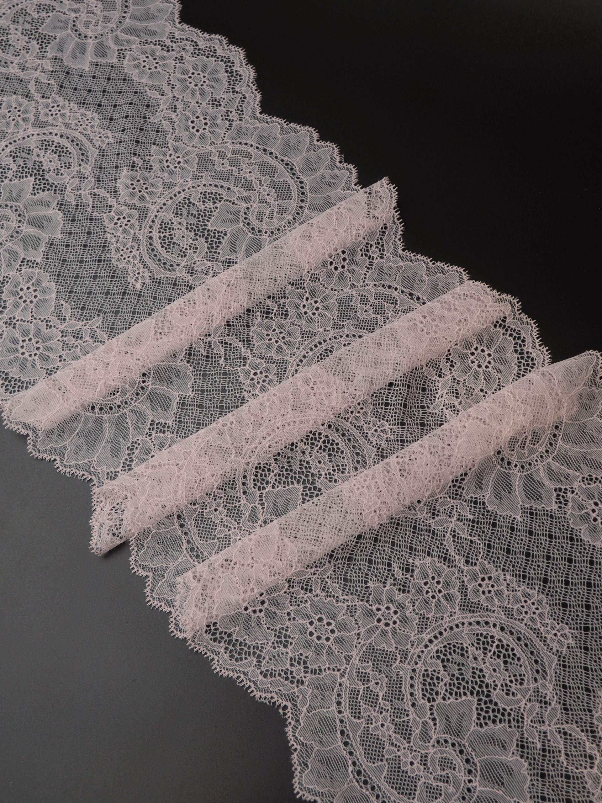 Шантильи кружево эластичное нежно-розовое с цветочным рисунком.