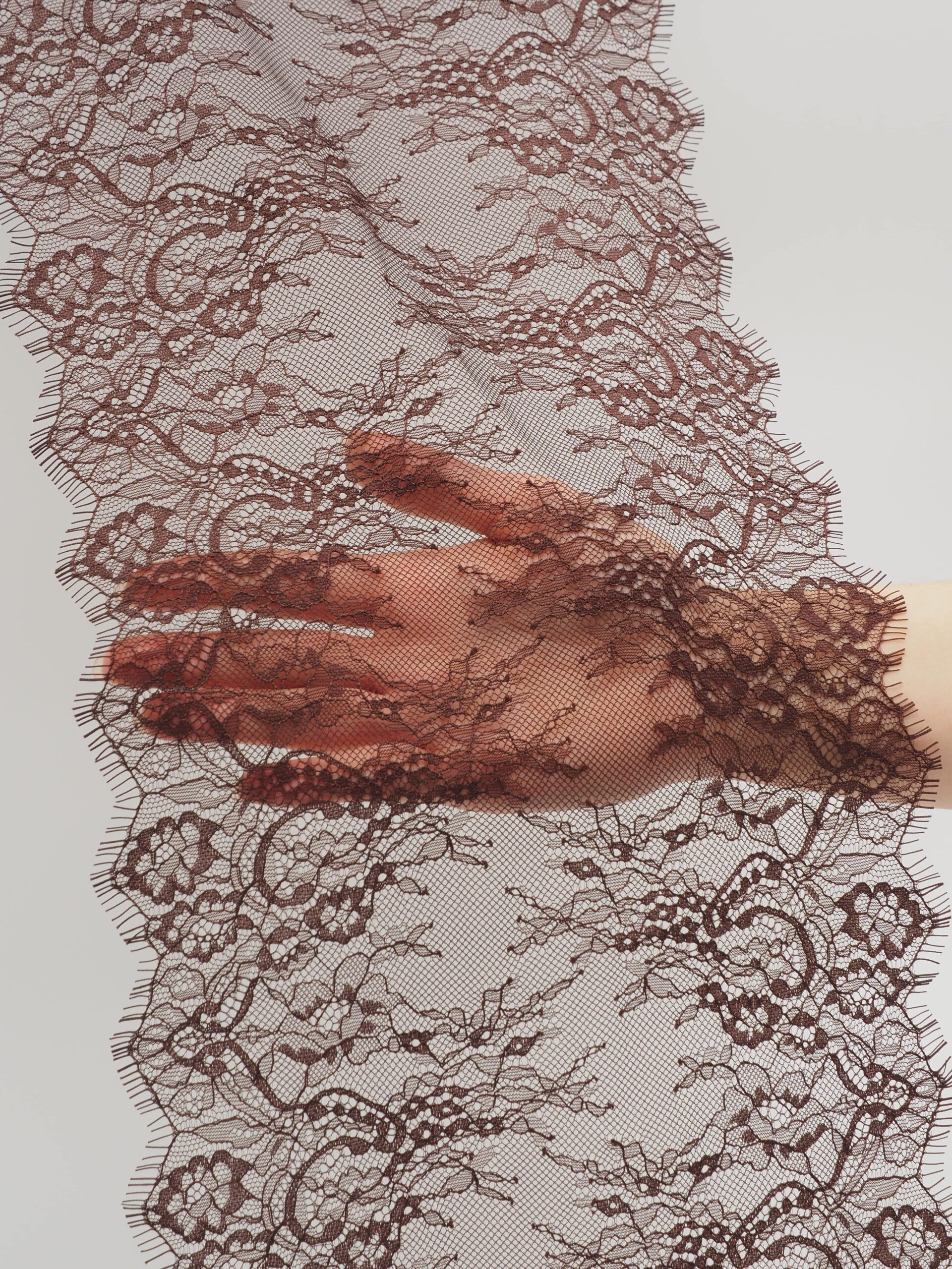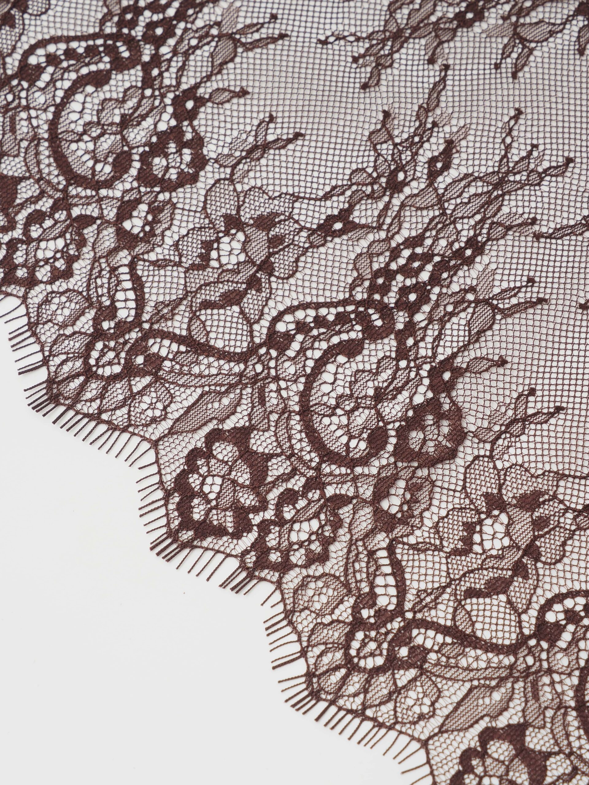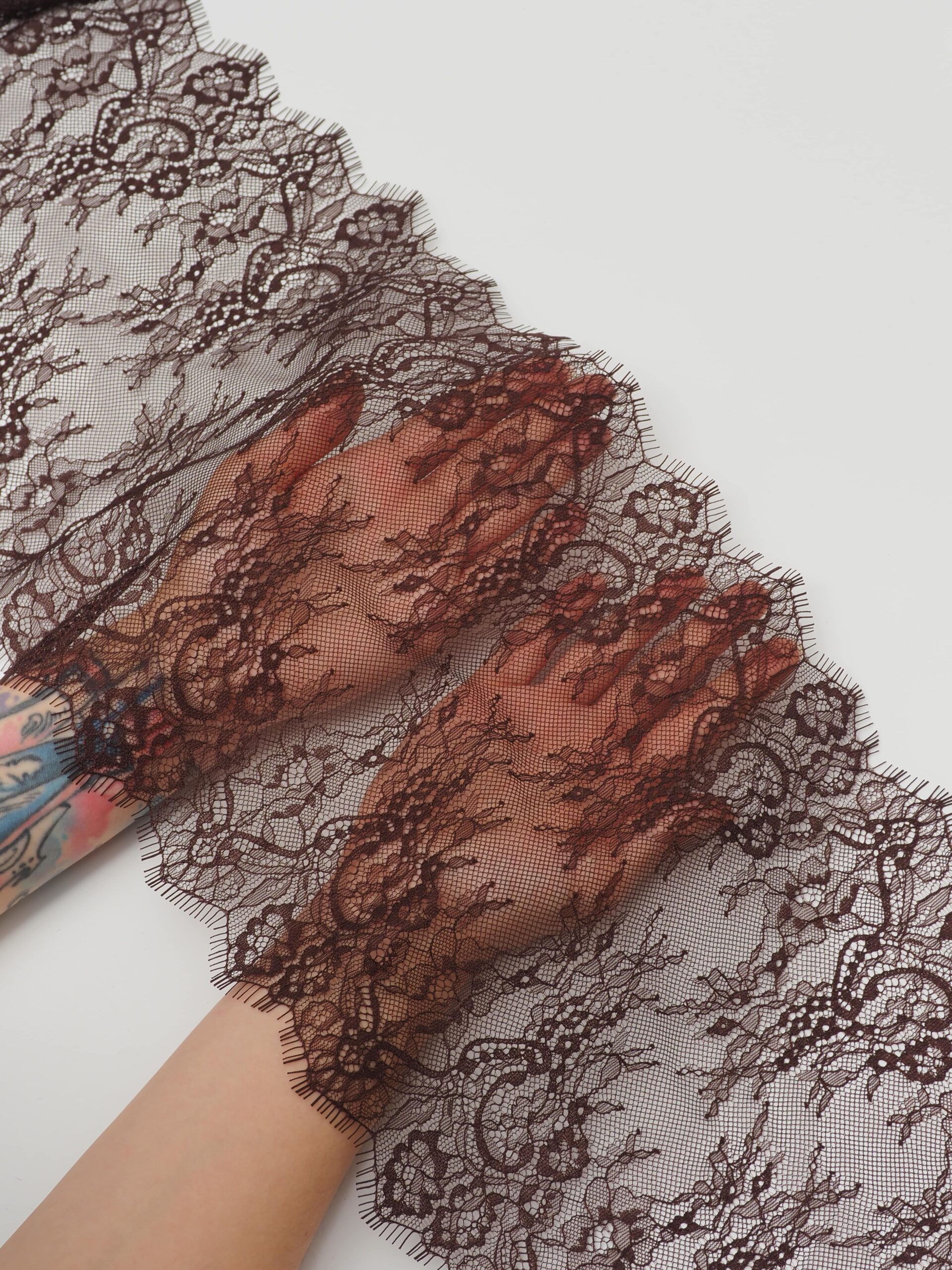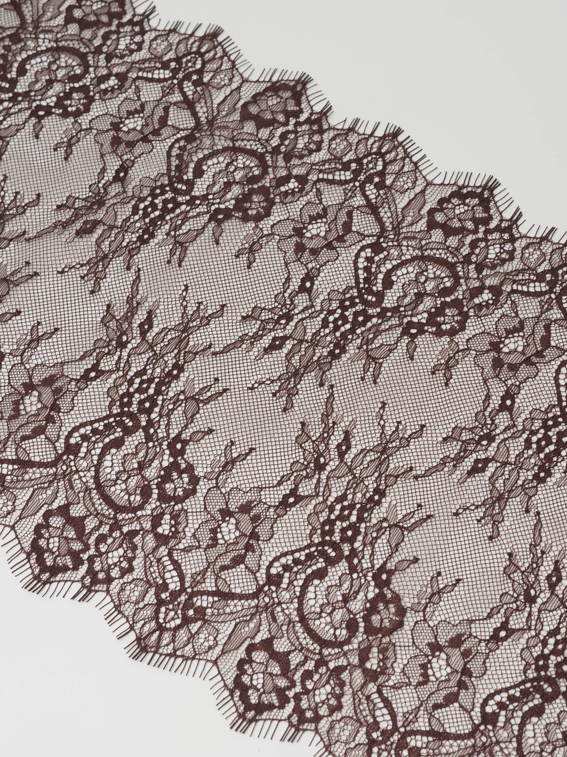 Французское кружево шантильи шоколад мягкий и тонкий материал. Он хорошо держит форму, почти не тянется, отличается высокой прочностью, весит очень мало и очень приятное на ощупь. Его используют для пошива и отделки вечерних и коктейльных платьев, свадебных нарядов, нижнего белья. Даже небольшие ажурные вставки придают изделию утонченность. Украсьте французским кружевом блузку, лиф платья, любое изделие из денима, и вы убедитесь, насколько элегантно смотрится такой материал. Шантильи уместно не только на одежде, но и домашнем текстиле. Ажурную ткань применяют для украшения скатертей и салфеток, занавесок.