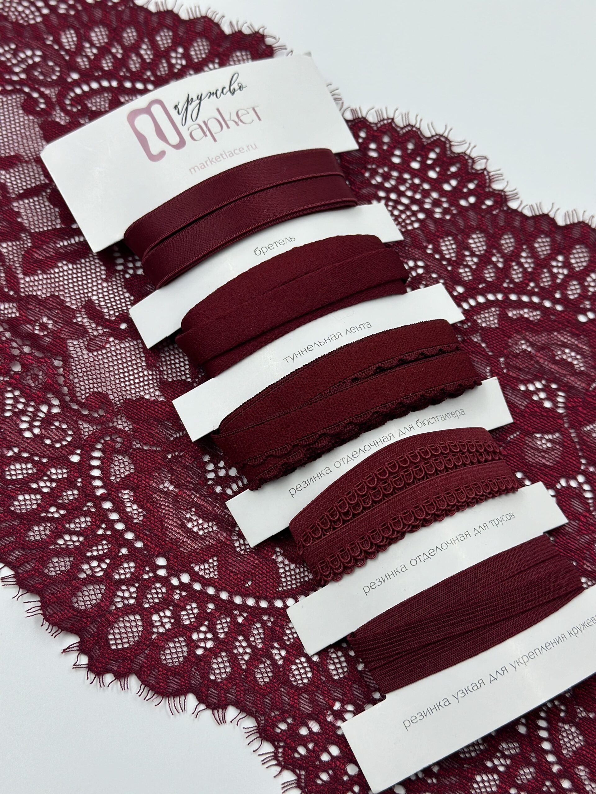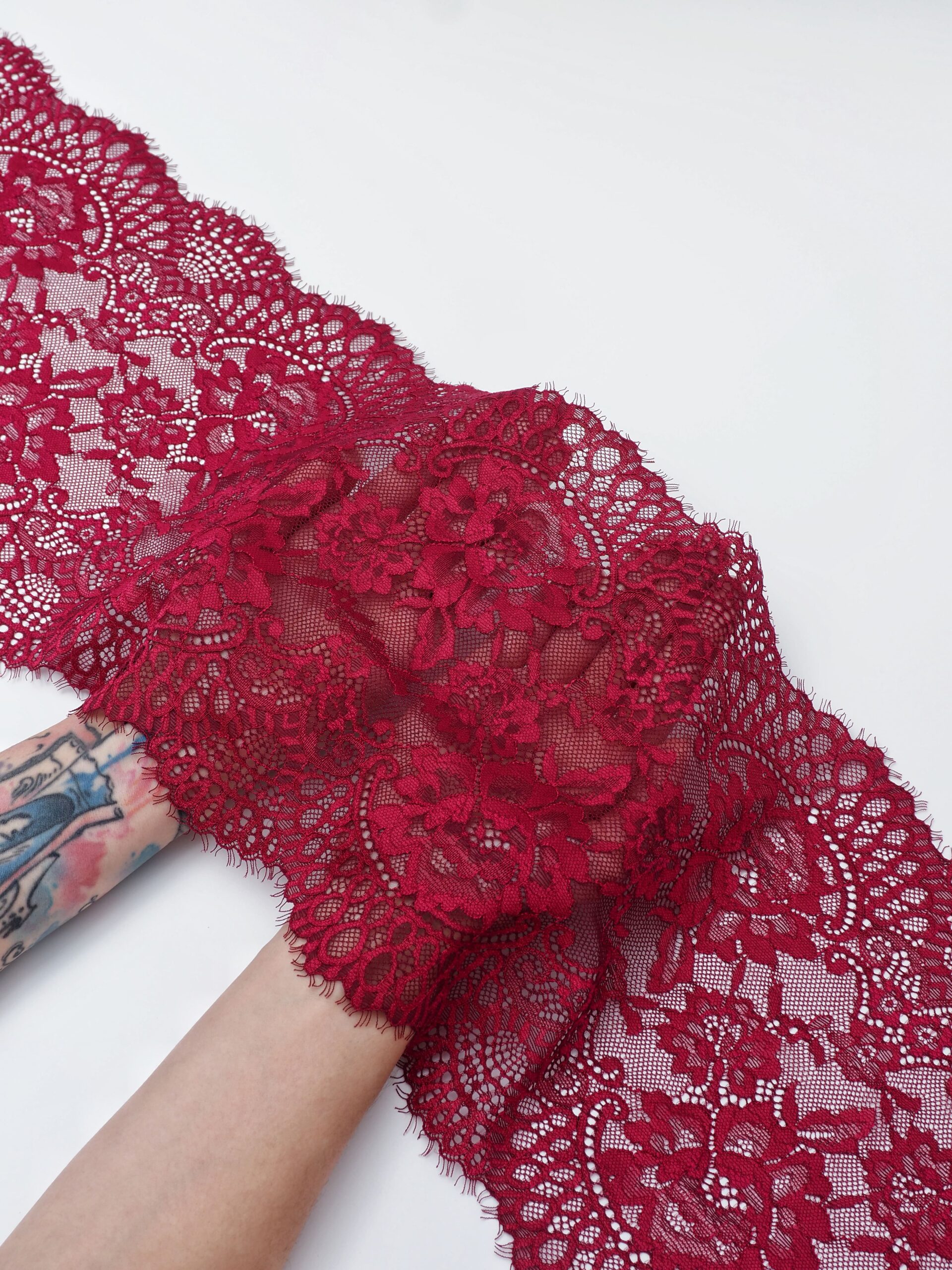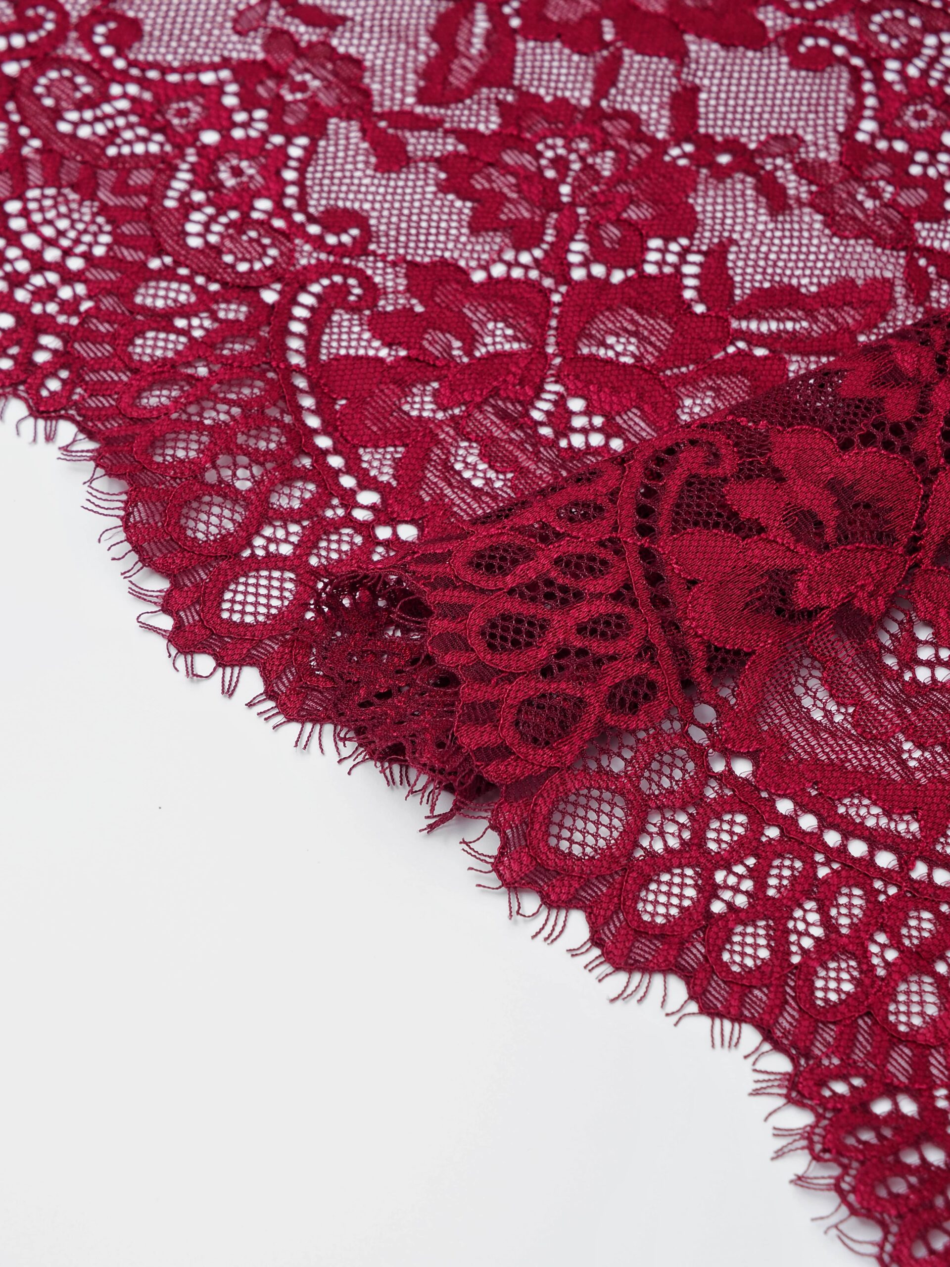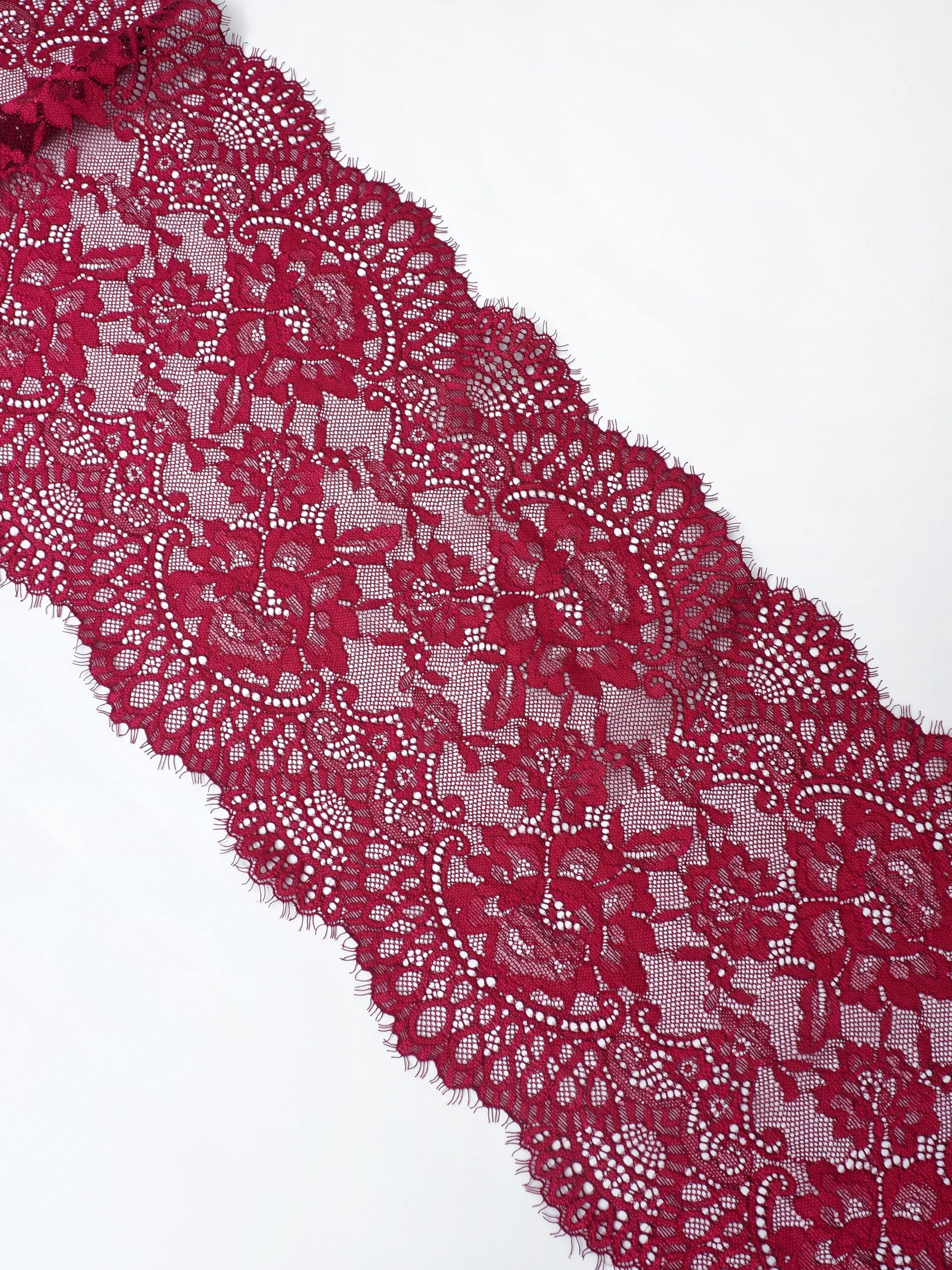 Кружево стрейч бордового оттенка с цветочным рисунком. Шантильи эластичное гранатового цвета блестящее.