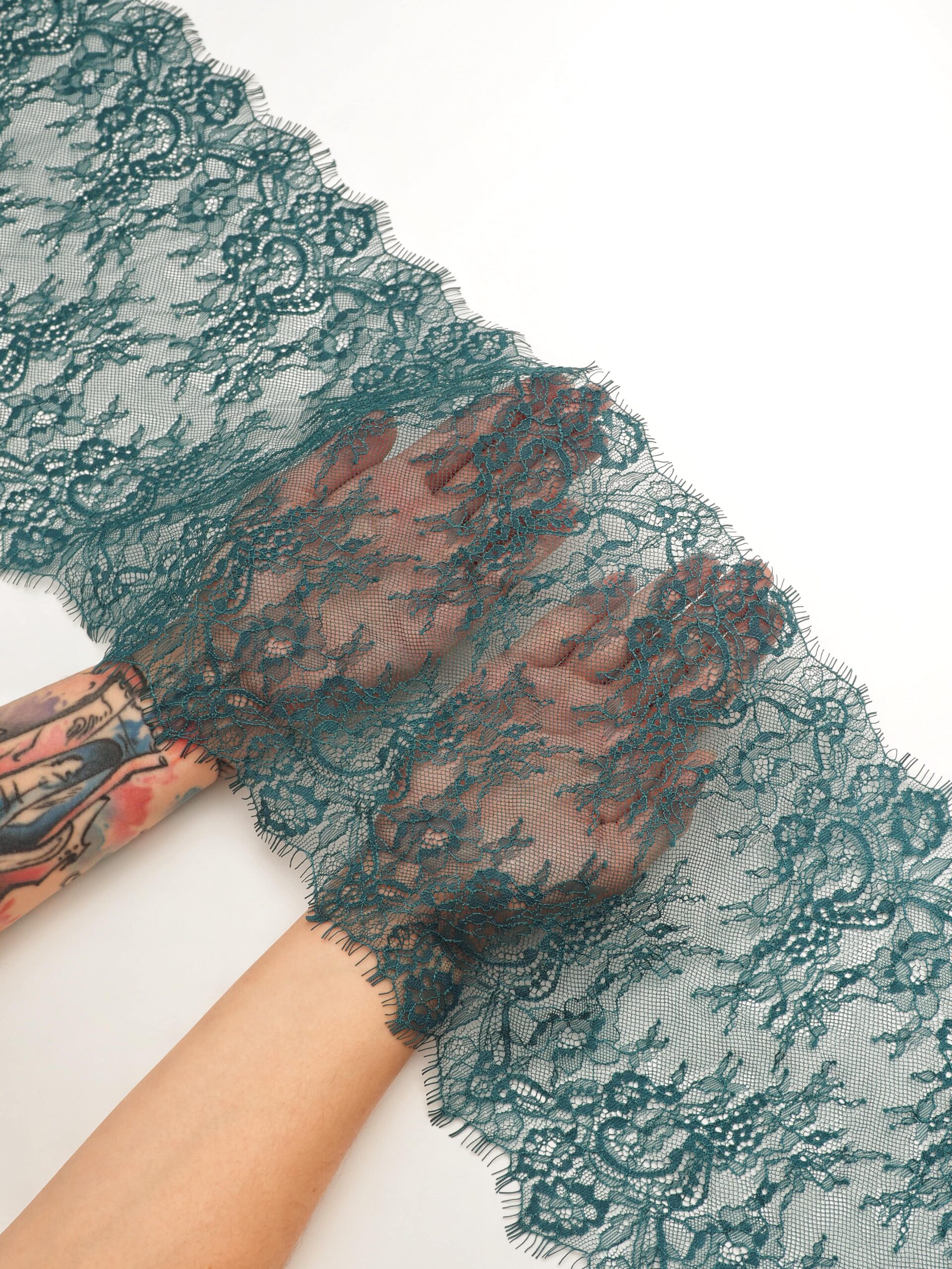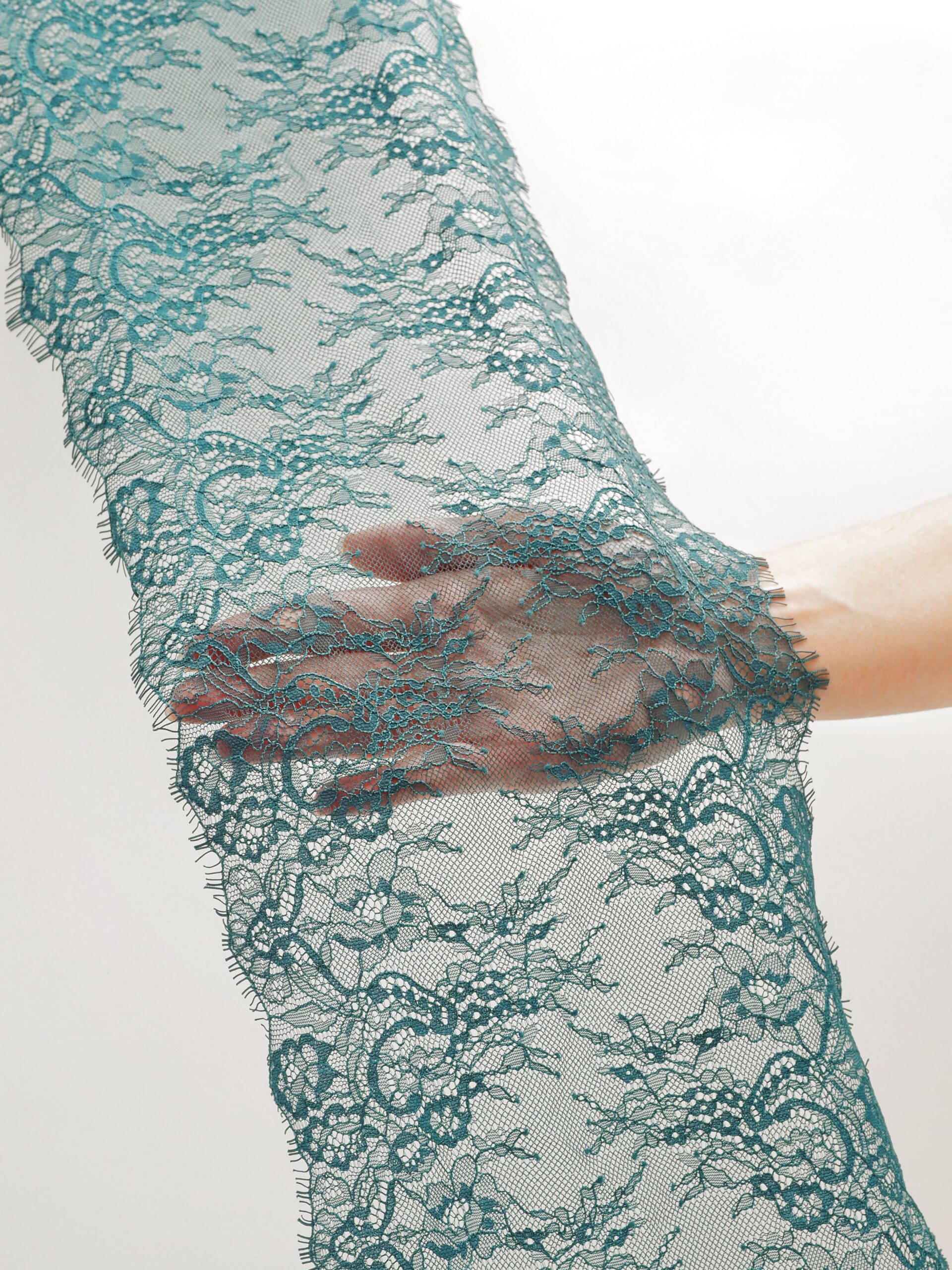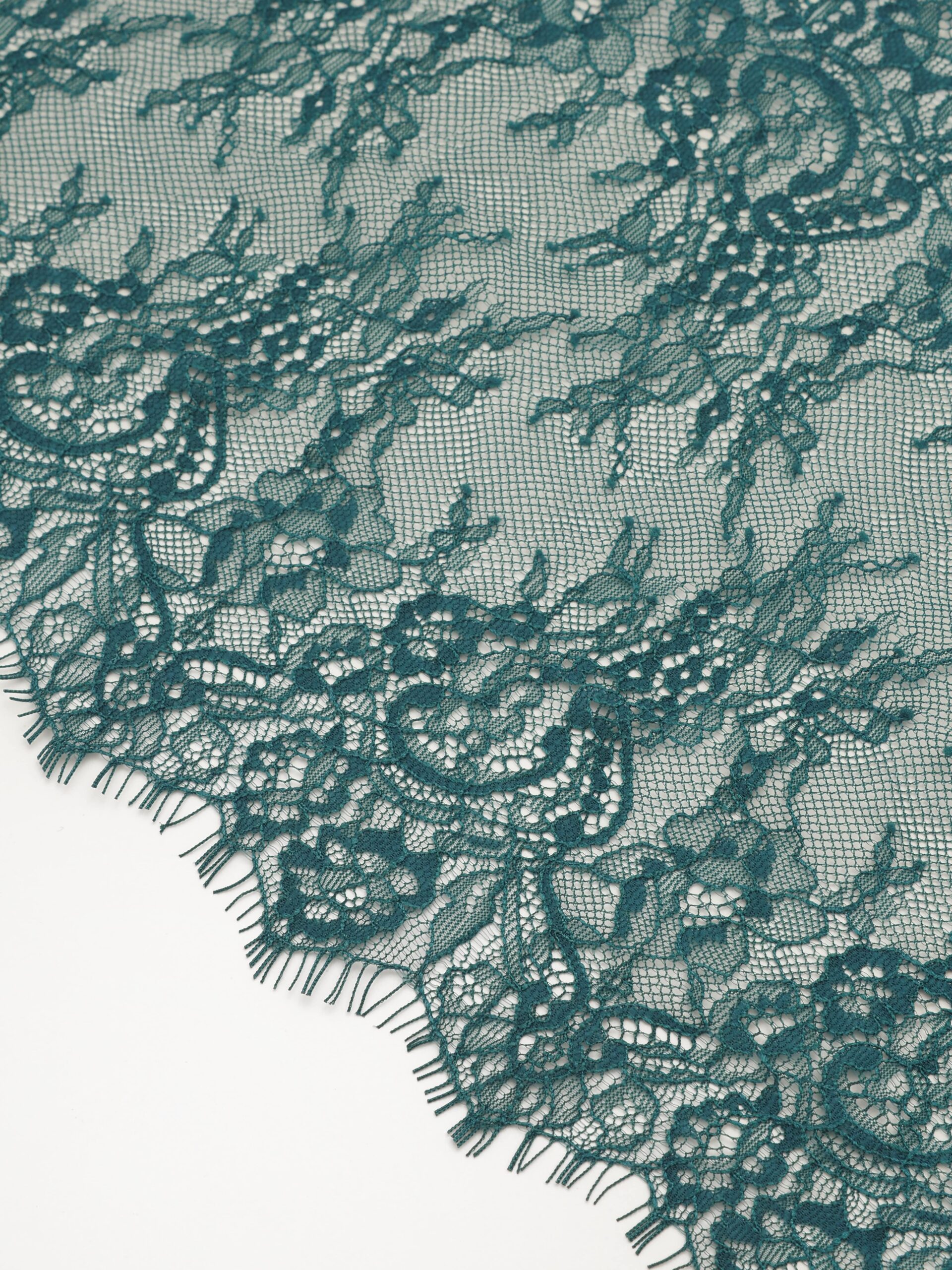 Французское кружево шантильи изумруд мягкий и тонкий материал. Он хорошо держит форму держит форму, почти не тянется, отличается высокой прочностью, весит очень мало и очень приятное на ощупь. Его используют для пошива и отделки вечерних и коктейльных платьев, свадебных нарядов, нижнего белья. Даже небольшие ажурные вставки придают изделию утонченность. Украсьте французским кружевом блузку, лиф платья, любое изделие из денима, и вы убедитесь, насколько элегантно смотрится такой материал. Шантильи уместно не только на одежде, но и домашнем текстиле. Ажурную ткань применяют для украшения скатертей и салфеток, занавесок.