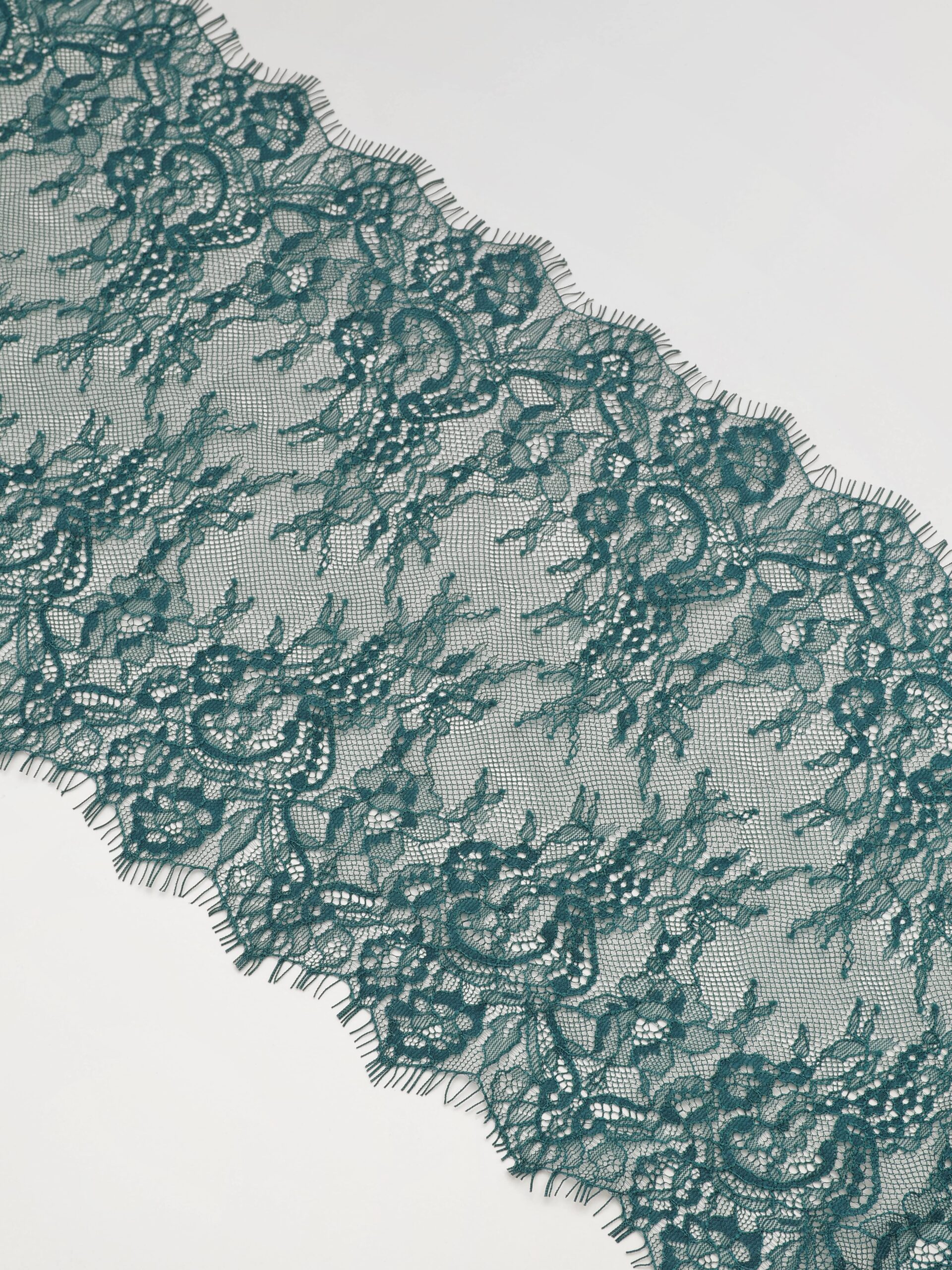 Шантильи кружево с ресничками без эластана с цветочным рисунком зеленого оттенка.
