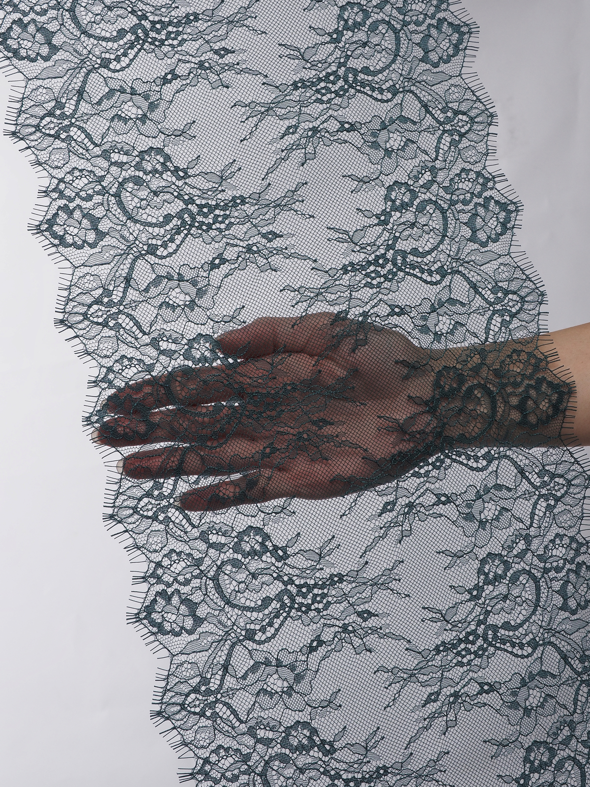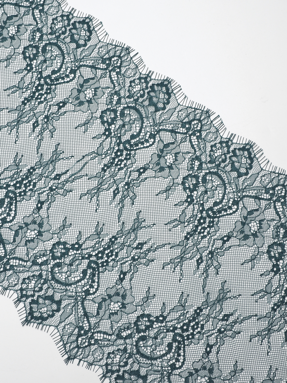 Шантильи кружево с ресничками без эластана с цветочным рисунком зеленого оттенка.