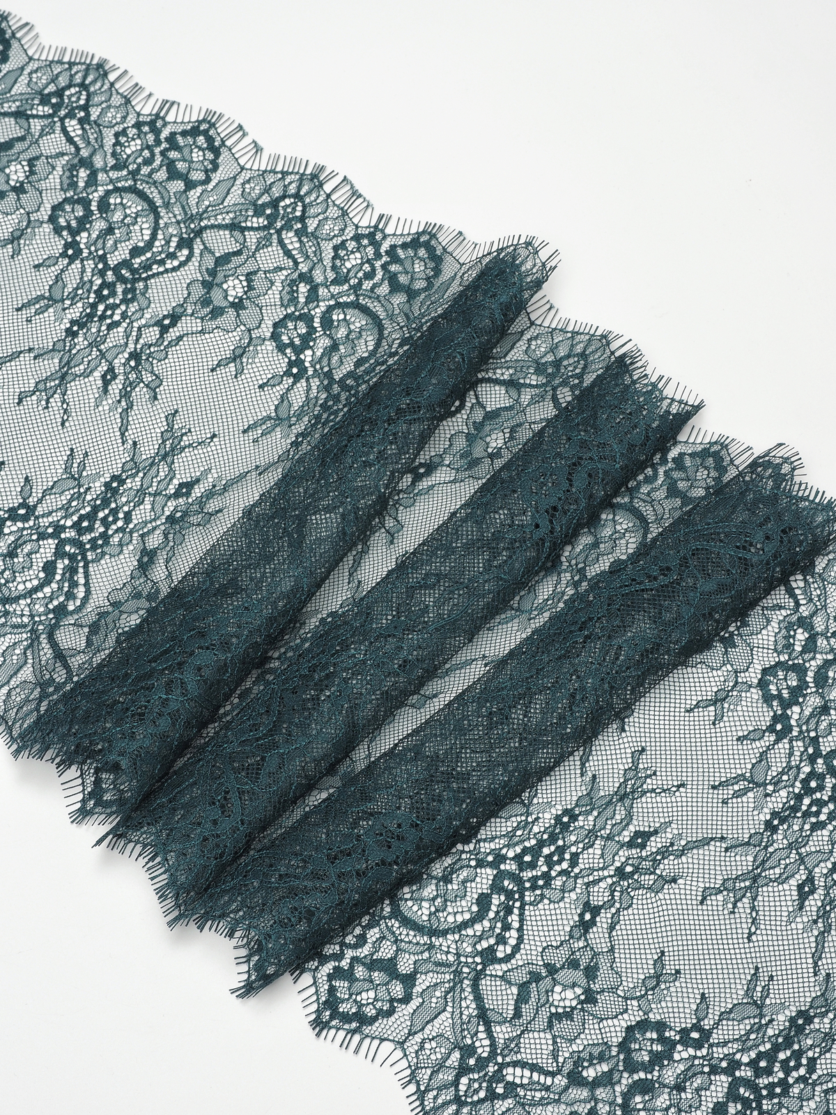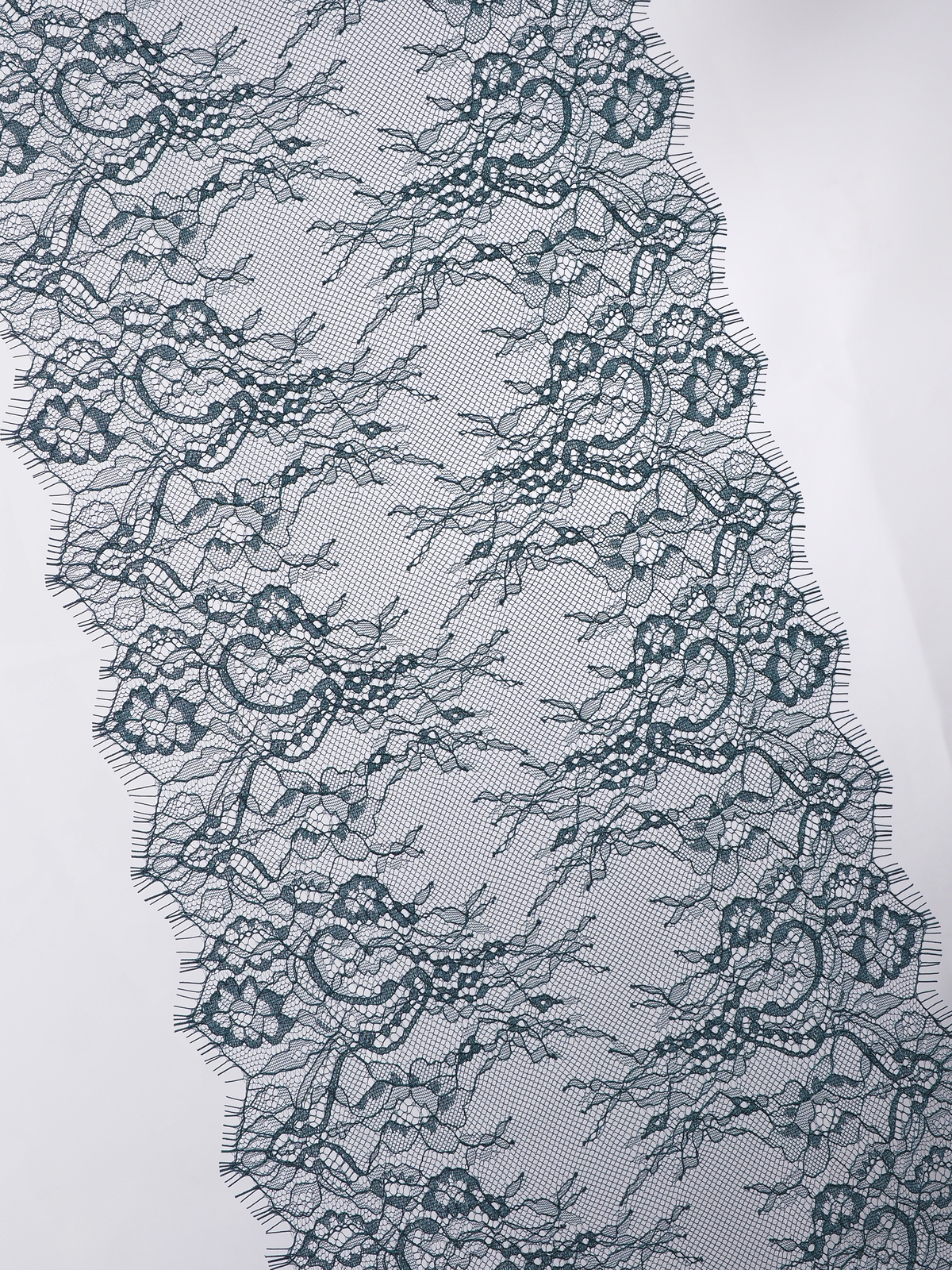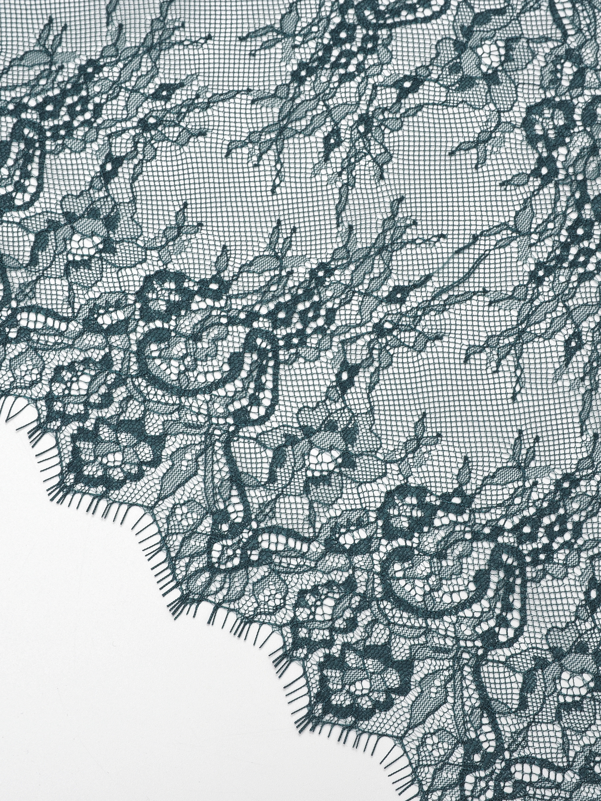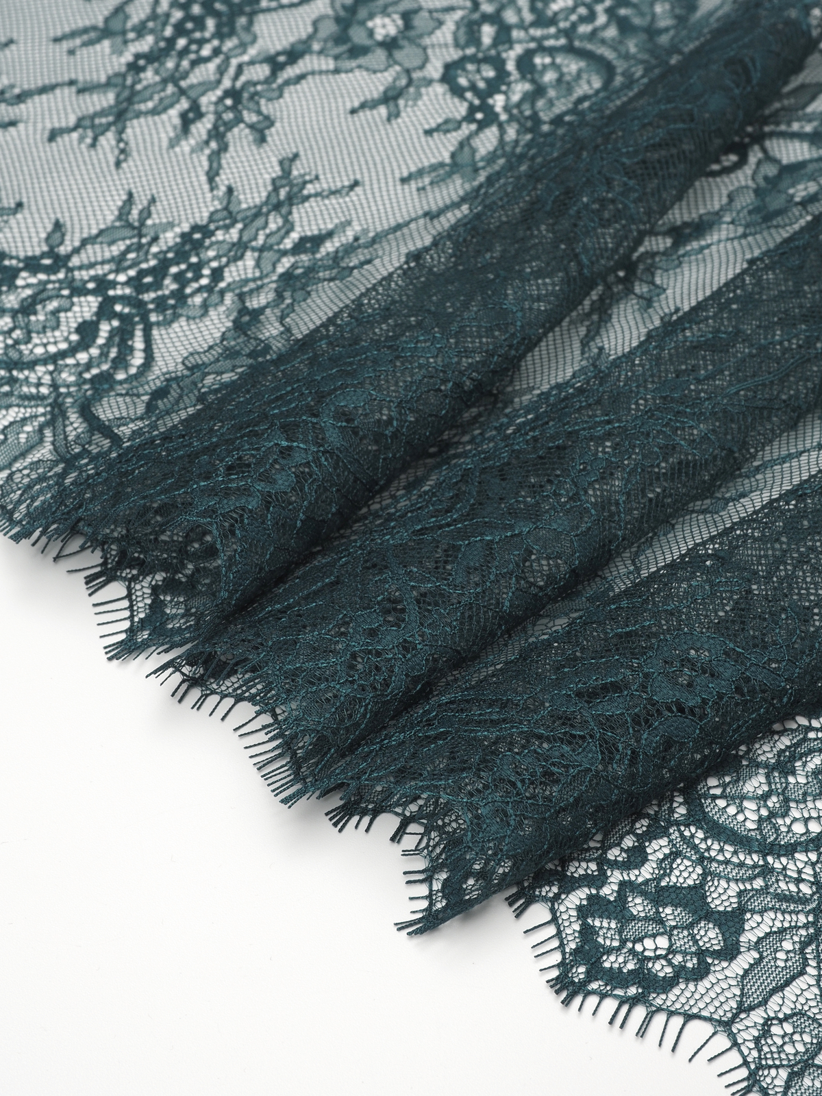 Французское кружево шантильи изумруд мягкий и тонкий материал. Он хорошо держит форму держит форму, почти не тянется, отличается высокой прочностью, весит очень мало и очень приятное на ощупь. Его используют для пошива и отделки вечерних и коктейльных платьев, свадебных нарядов, нижнего белья. Даже небольшие ажурные вставки придают изделию утонченность. Украсьте французским кружевом блузку, лиф платья, любое изделие из денима, и вы убедитесь, насколько элегантно смотрится такой материал. Шантильи уместно не только на одежде, но и домашнем текстиле. Ажурную ткань применяют для украшения скатертей и салфеток, занавесок.
