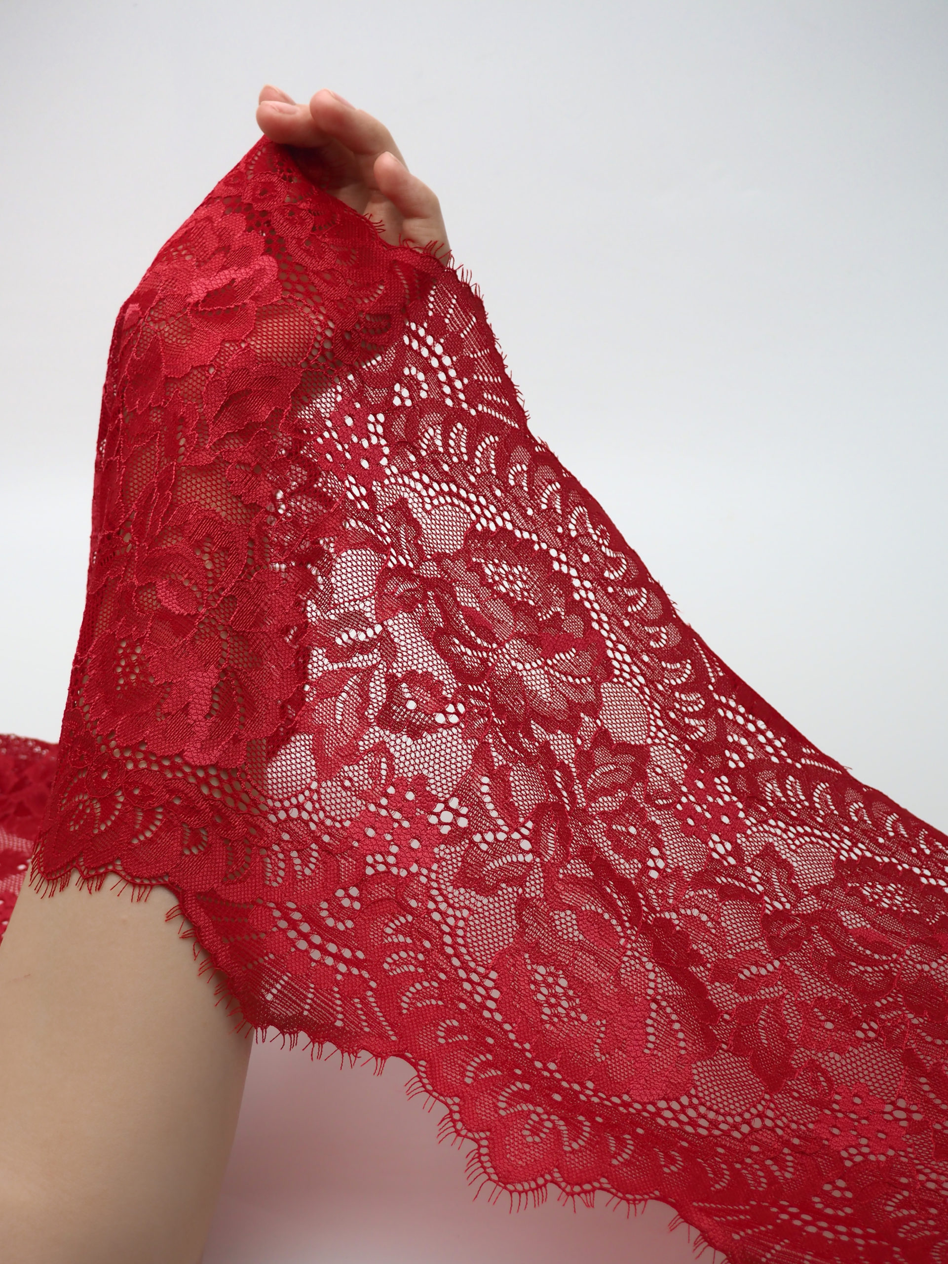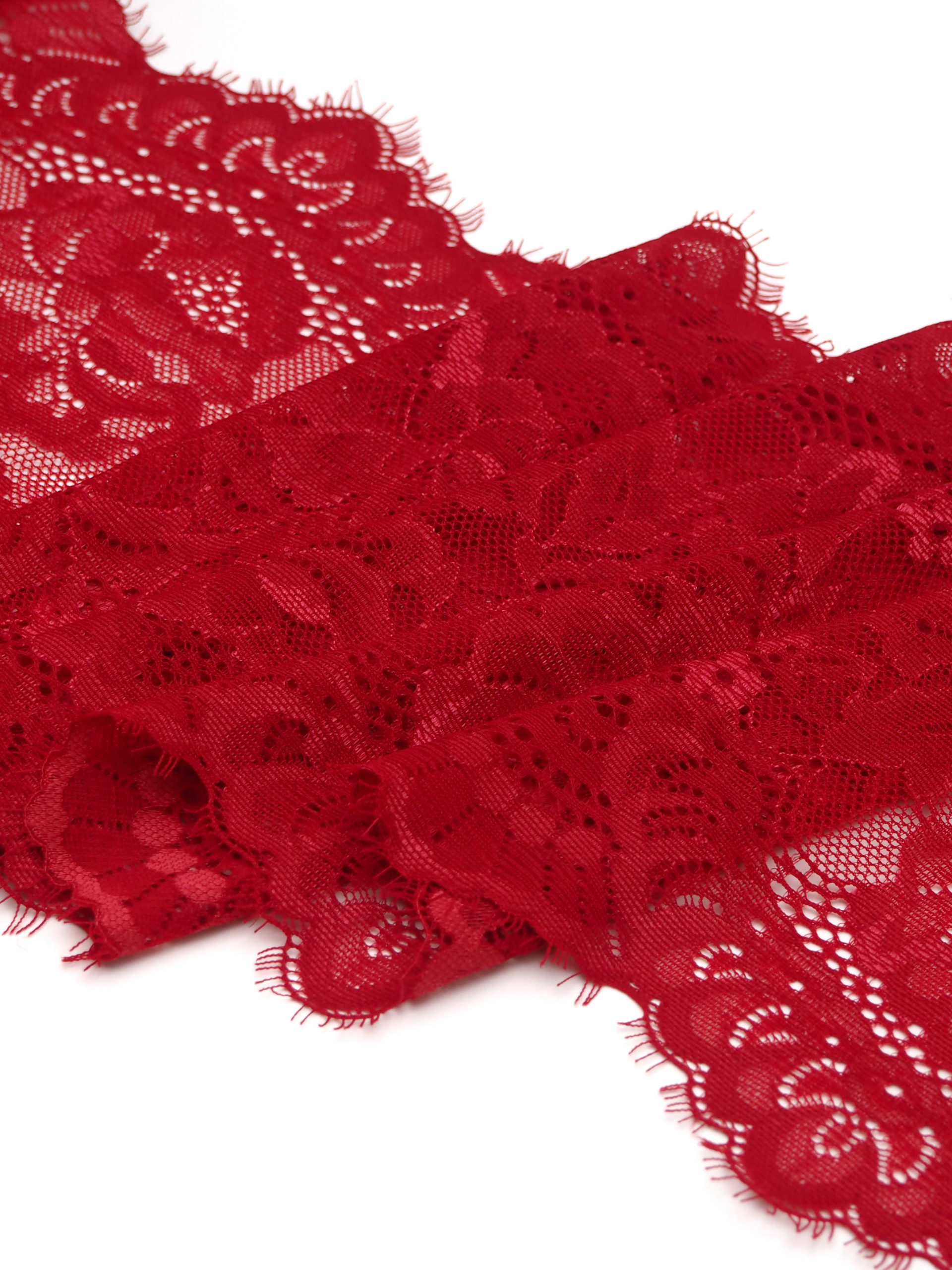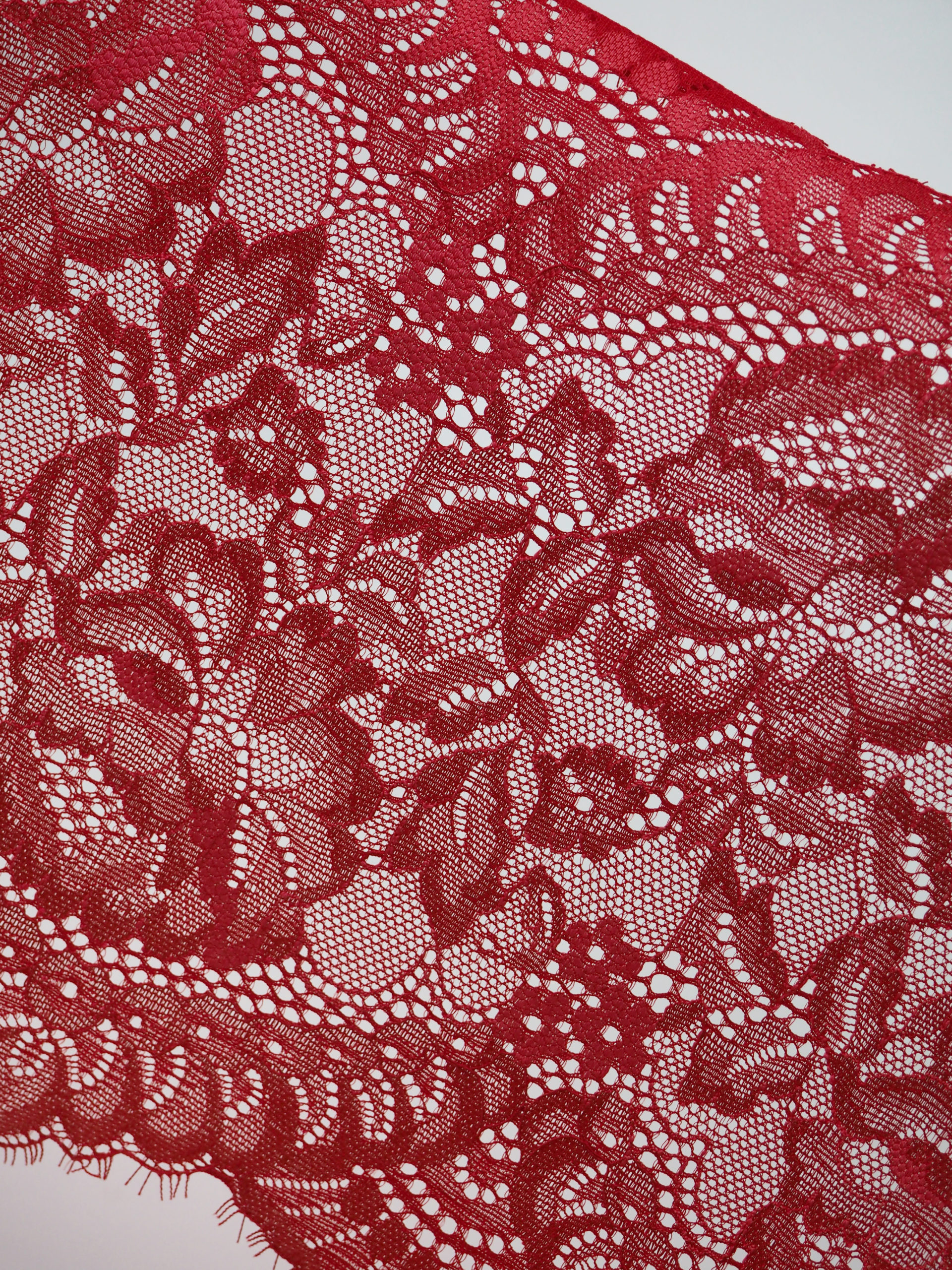 Кружево шантильи эластичное стрейч с ресничками кораллово-красного цвета.