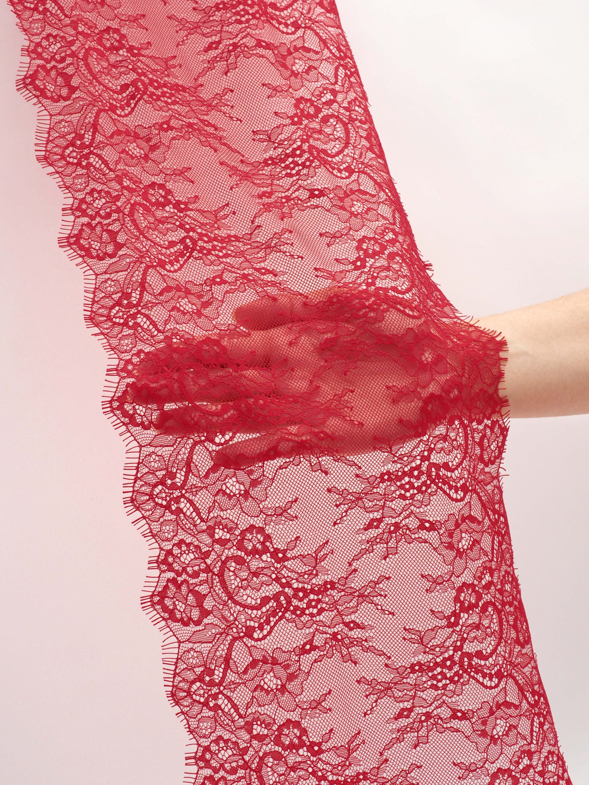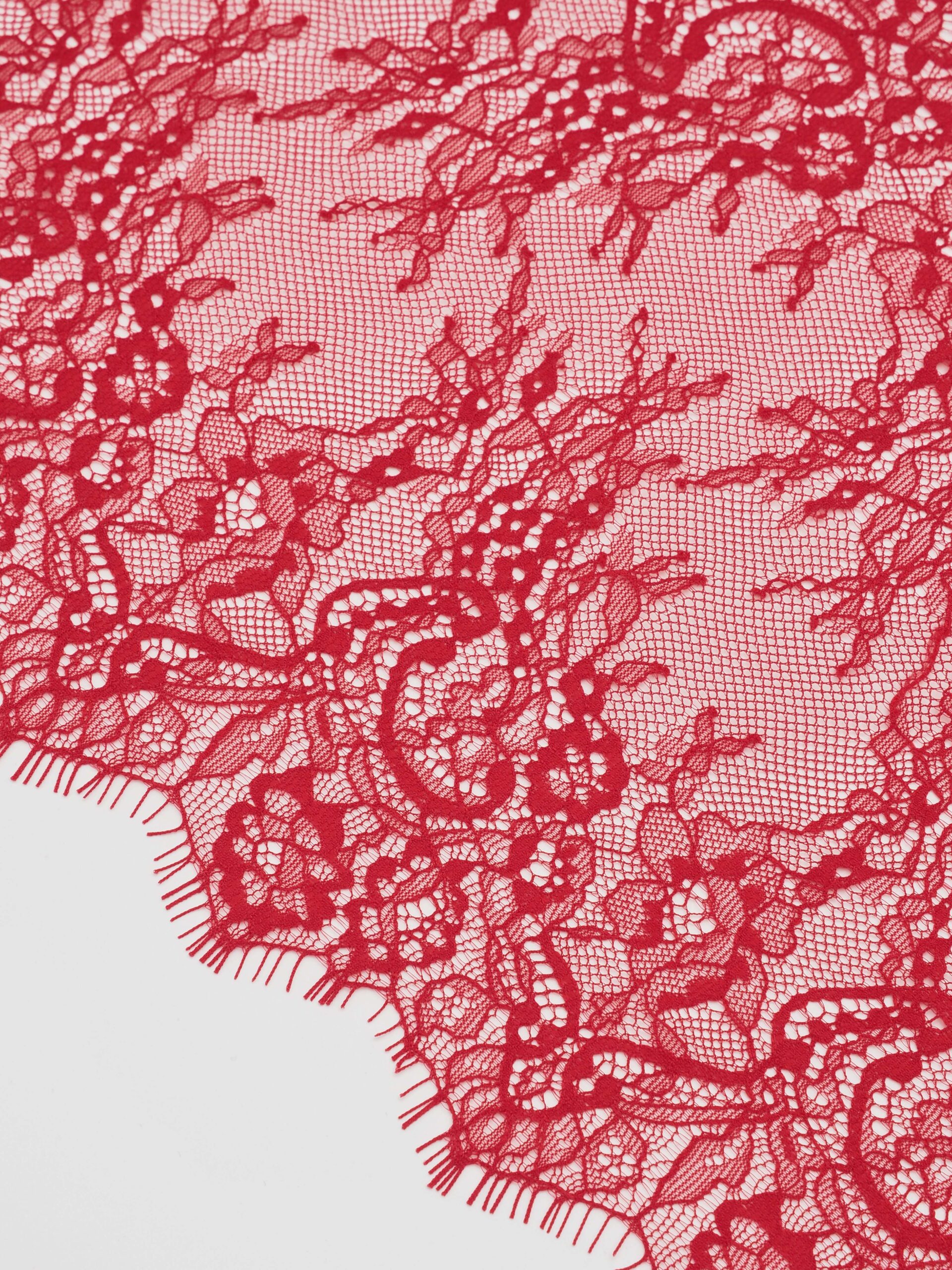 Шантильи кружево с ресничками без эластана с цветочным рисунком красного оттенка.