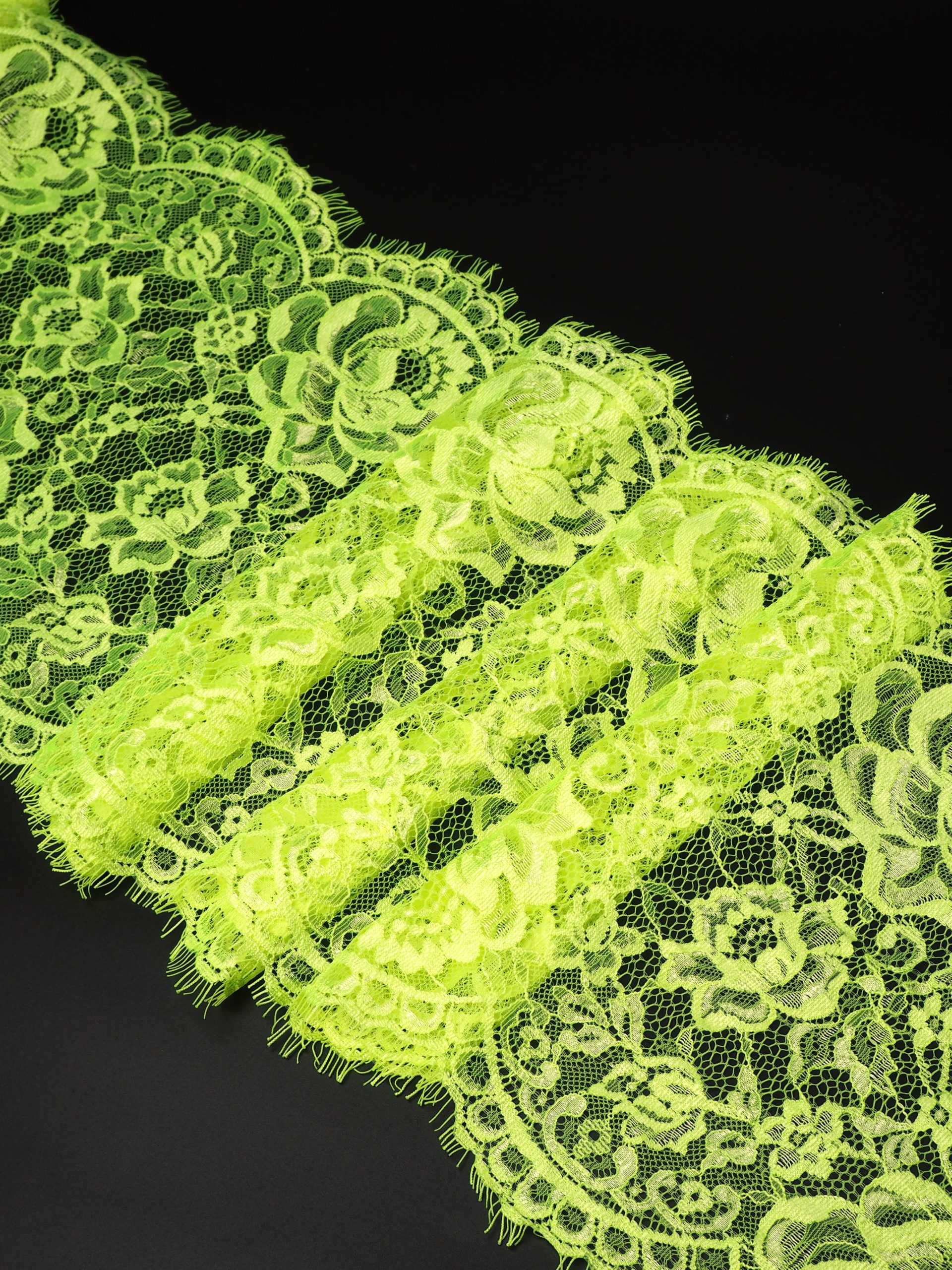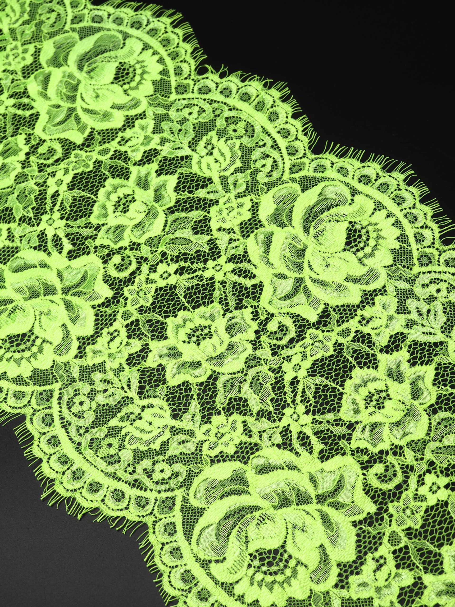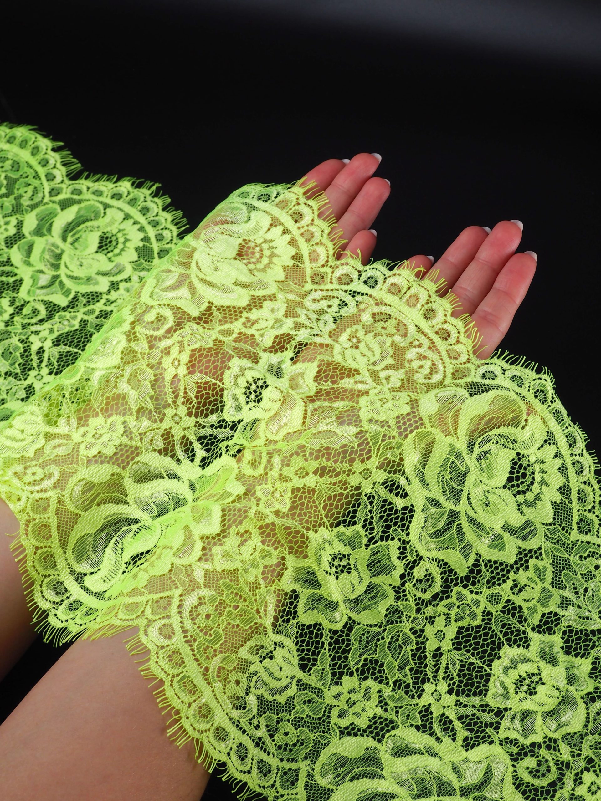Французское кружево шантильи лимон-лайм неоновое мягкий и тонкий материал. Он хорошо держит форму держит форму, почти не тянется, отличается высокой прочностью, весит очень мало и очень приятное на ощупь. Его используют для пошива и отделки вечерних и коктейльных платьев, свадебных нарядов, нижнего белья. Даже небольшие ажурные вставки придают изделию утонченность. Украсьте французским кружевом блузку, лиф платья, любое изделие из денима, и вы убедитесь, насколько элегантно смотрится такой материал. Шантильи уместно не только на одежде, но и домашнем текстиле. Ажурную ткань применяют для украшения скатертей и салфеток, занавесок.