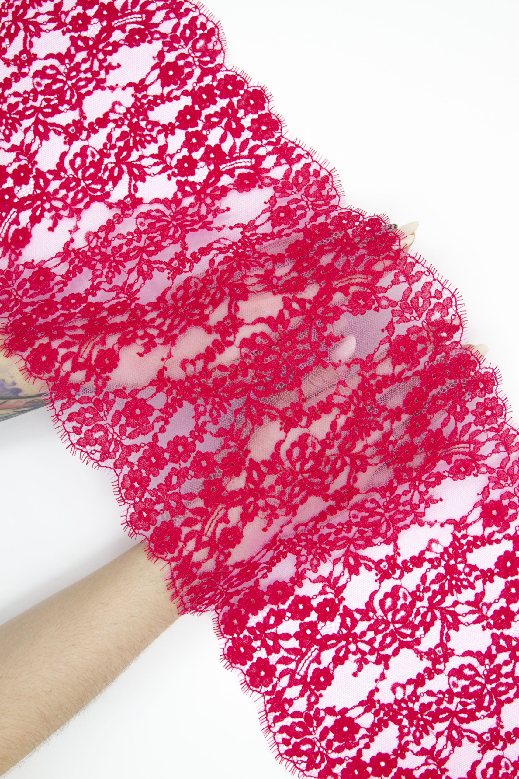 Французское кружево шантильи малиновое со светло-розовым мягкий и тонкий материал. Он хорошо держит форму держит форму, почти не тянется, отличается высокой прочностью, весит очень мало и очень приятное на ощупь. Его используют для пошива и отделки вечерних и коктейльных платьев, свадебных нарядов, нижнего белья. Даже небольшие ажурные вставки придают изделию утонченность. Украсьте французским кружевом блузку, лиф платья, любое изделие из денима, и вы убедитесь, насколько элегантно смотрится такой материал. Шантильи уместно не только на одежде, но и домашнем текстиле. Ажурную ткань применяют для украшения скатертей и салфеток, занавесок.