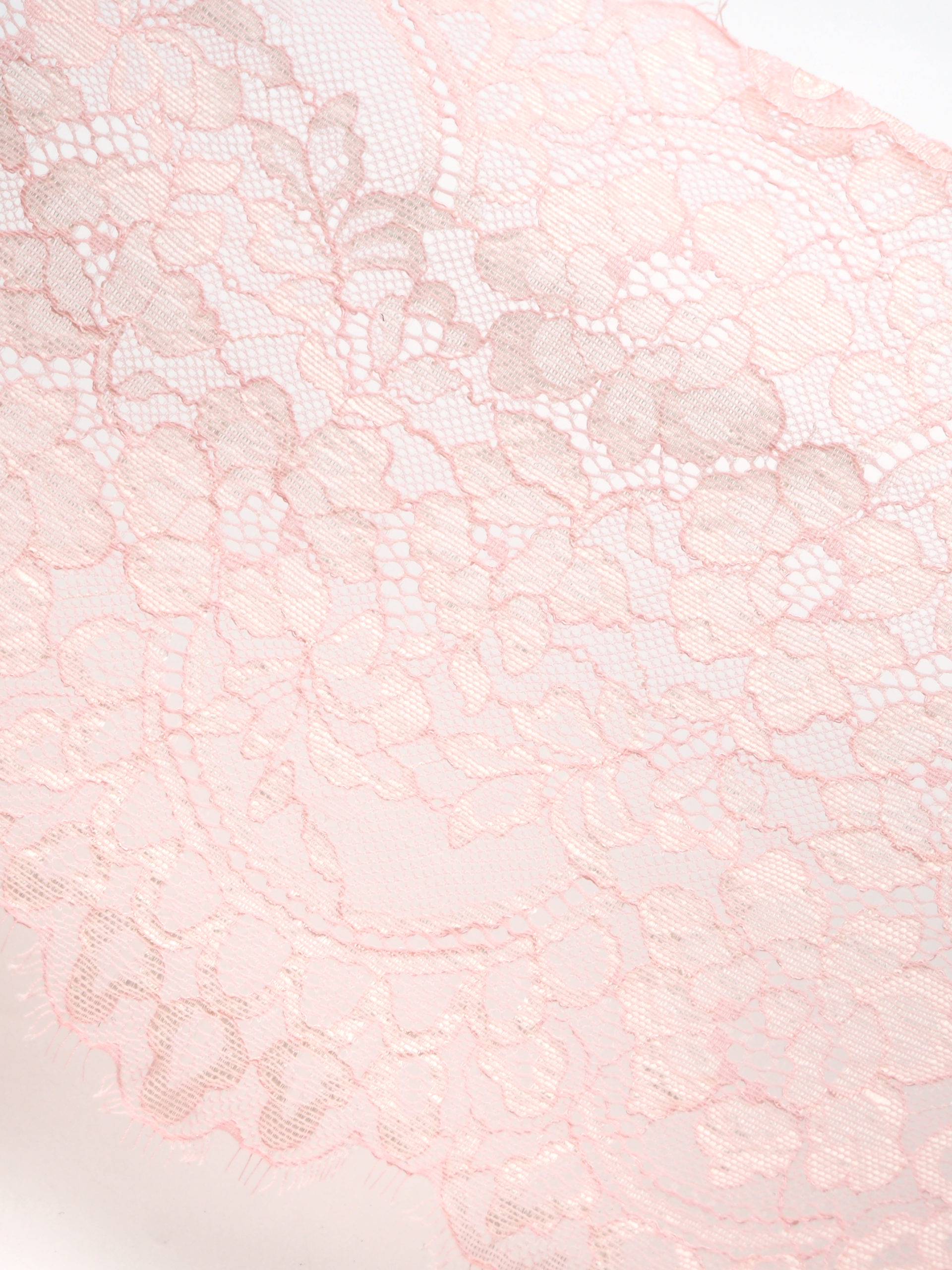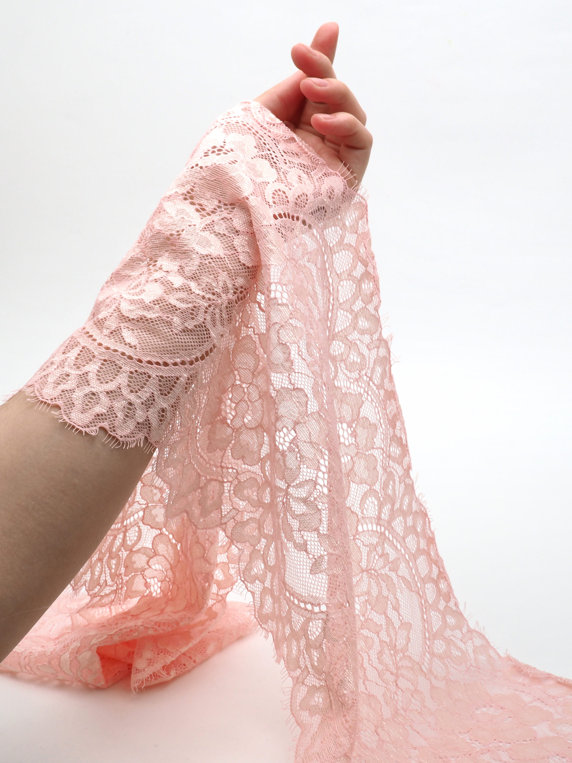 Кружево шантильи эластичное стрейч с ресничками персиково-розового цвета.