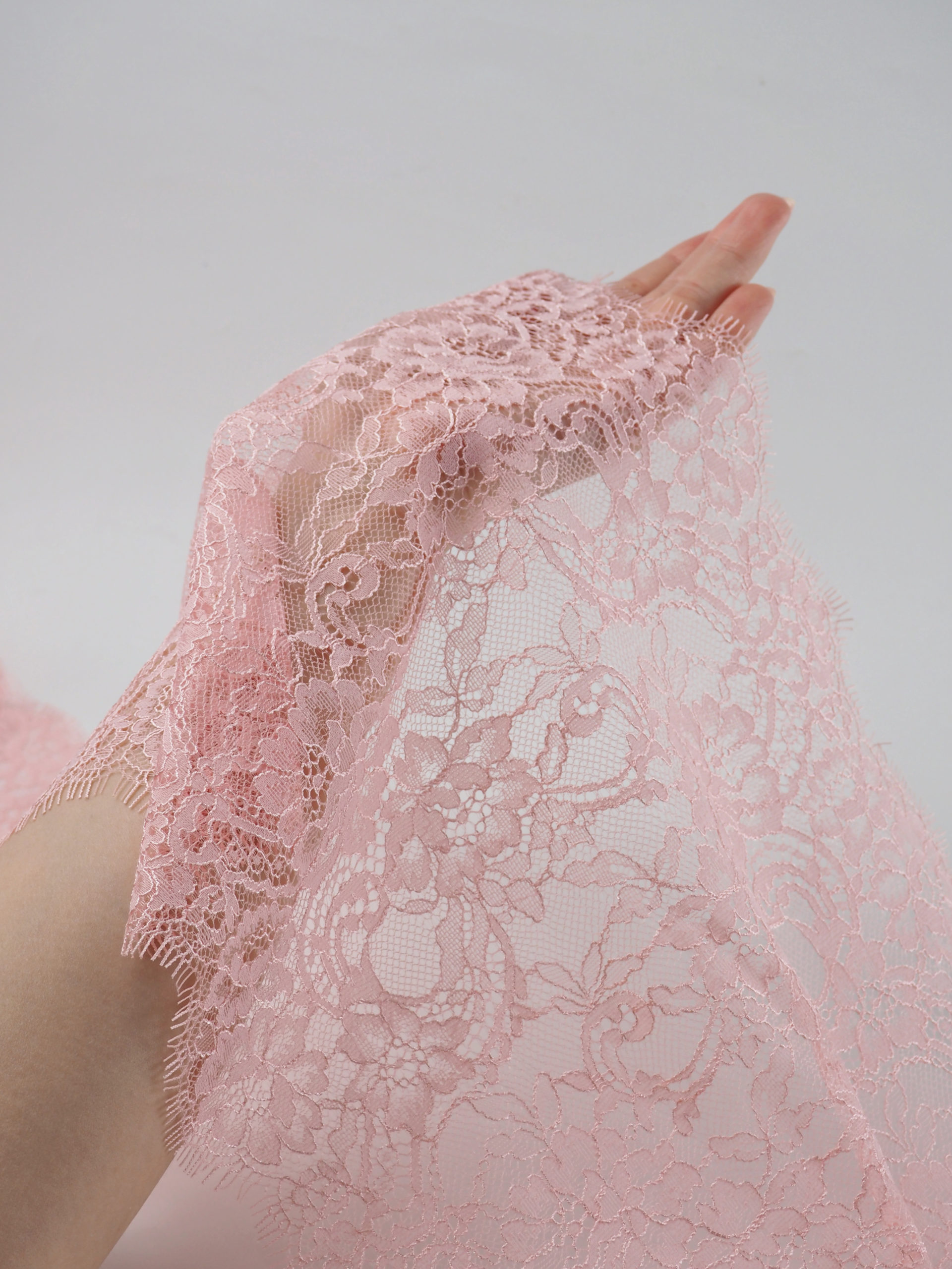 Французское кружево шантильи персиково- розовое мягкий и тонкий материал. Он хорошо держит форму держит форму, почти не тянется, отличается высокой прочностью, весит очень мало и очень приятное на ощупь. Его используют для пошива и отделки вечерних и коктейльных платьев, свадебных нарядов, нижнего белья. Даже небольшие ажурные вставки придают изделию утонченность. Украсьте французским кружевом блузку, лиф платья, любое изделие из денима, и вы убедитесь, насколько элегантно смотрится такой материал. Шантильи уместно не только на одежде, но и домашнем текстиле. Ажурную ткань применяют для украшения скатертей и салфеток, занавесок.