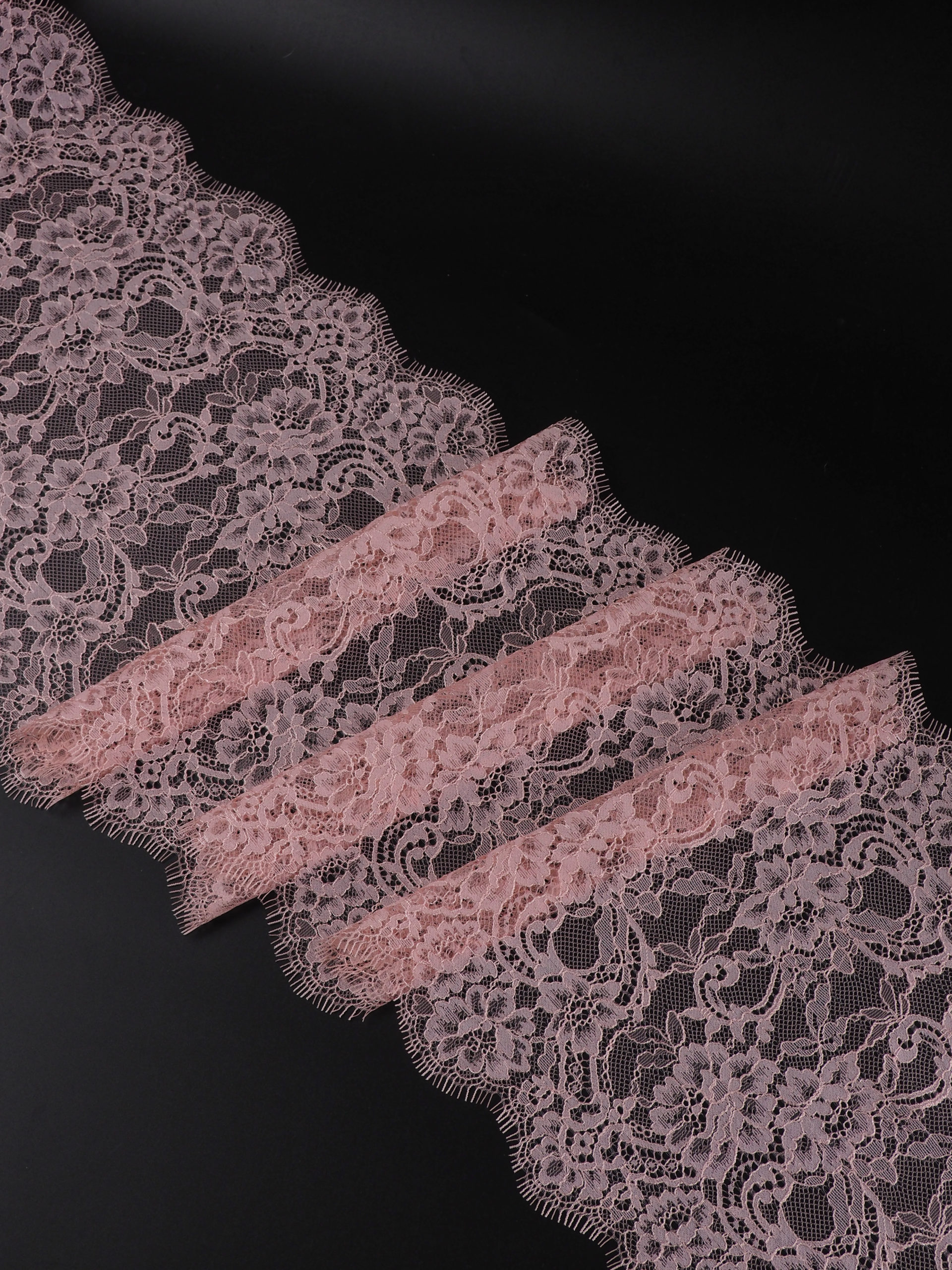 Кружево шантильи персиково-розовое неэластичное ширина 24 см ОТРЕЗ 1 м