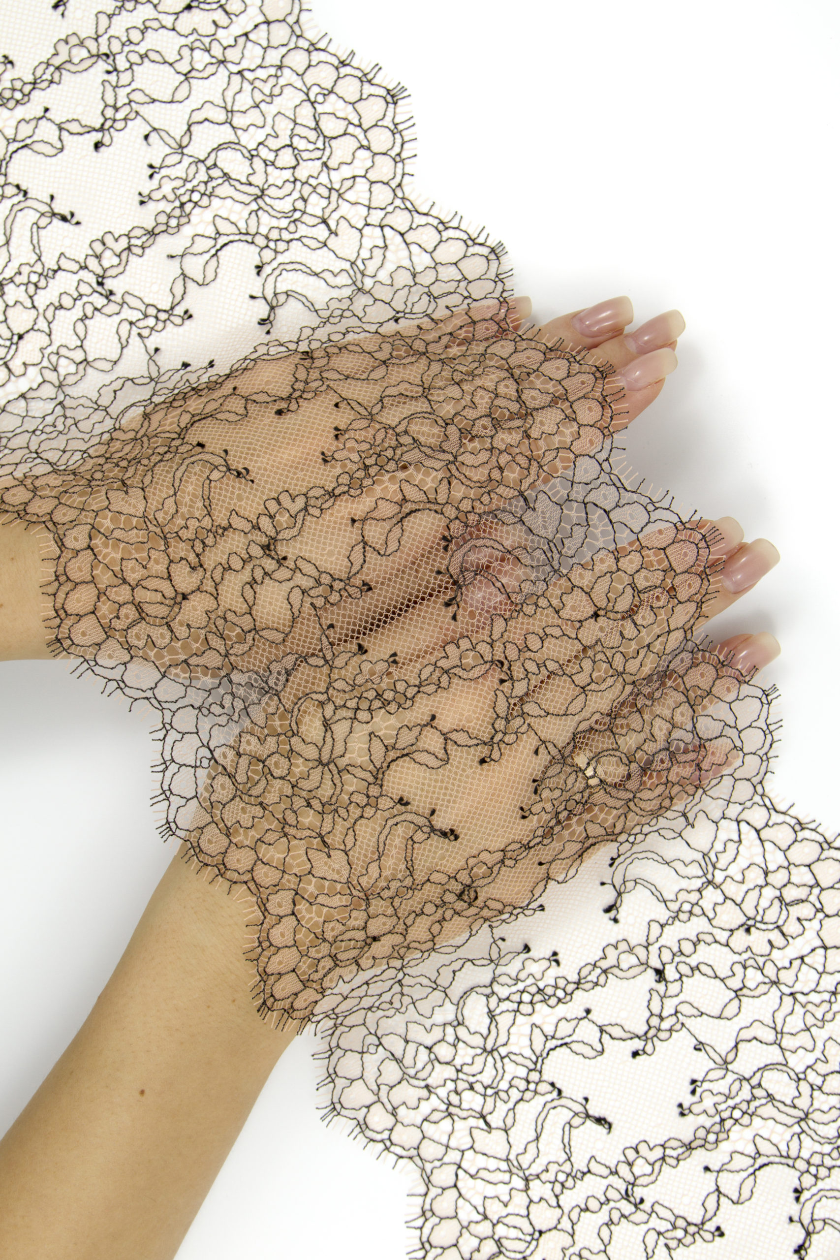 Французское кружево шантильи персиковое с черной нитью мягкий и тонкий материал. Он хорошо держит форму, почти не тянется, отличается высокой прочностью, весит очень мало и очень приятное на ощупь. Его используют для пошива и отделки вечерних и коктейльных платьев, свадебных нарядов, нижнего белья. Даже небольшие ажурные вставки придают изделию утонченность. Украсьте французским кружевом блузку, лиф платья, любое изделие из денима, и вы убедитесь, насколько элегантно смотрится такой материал. Шантильи уместно не только на одежде, но и домашнем текстиле. Ажурную ткань применяют для украшения скатертей и салфеток, занавесок.