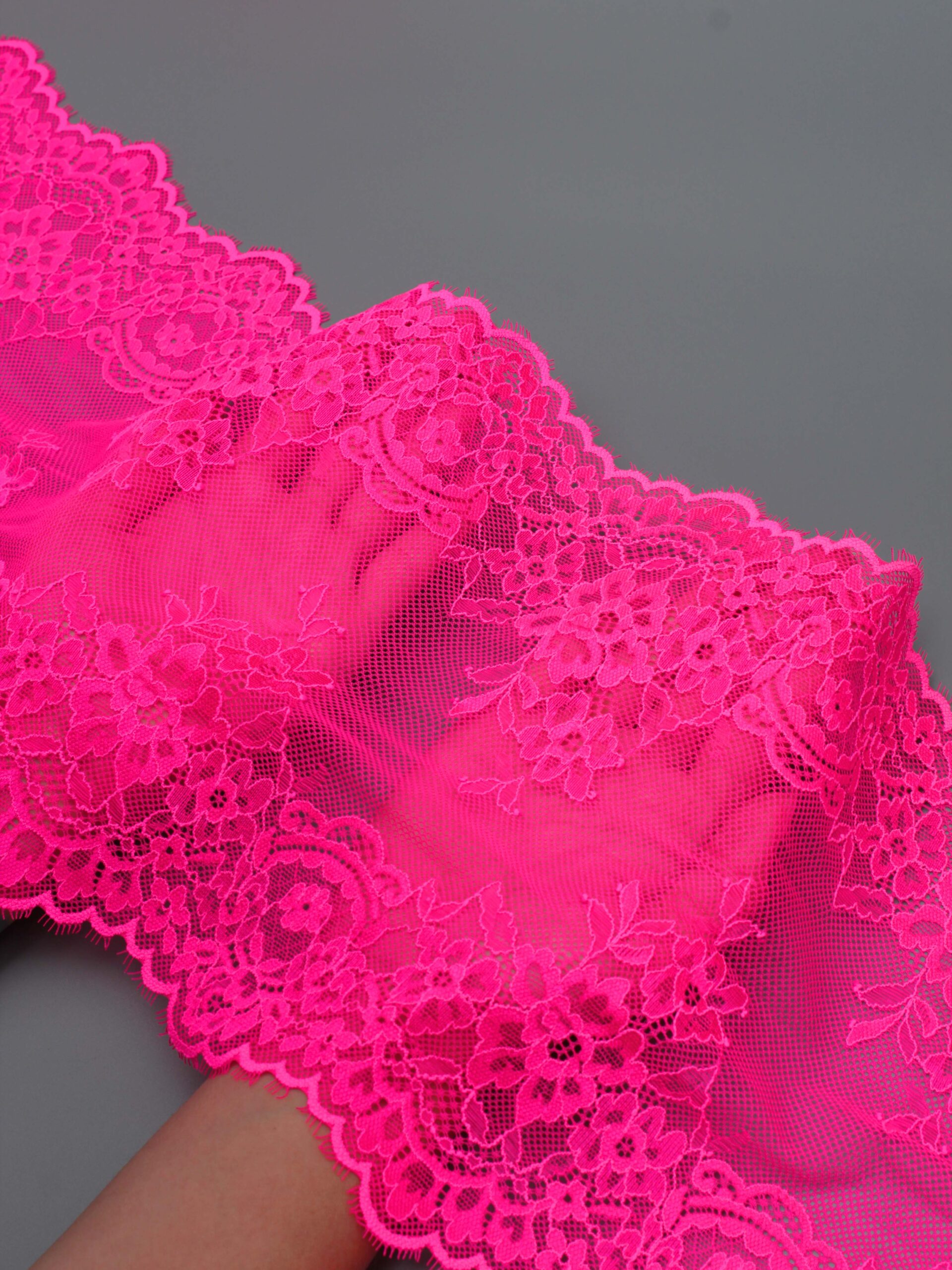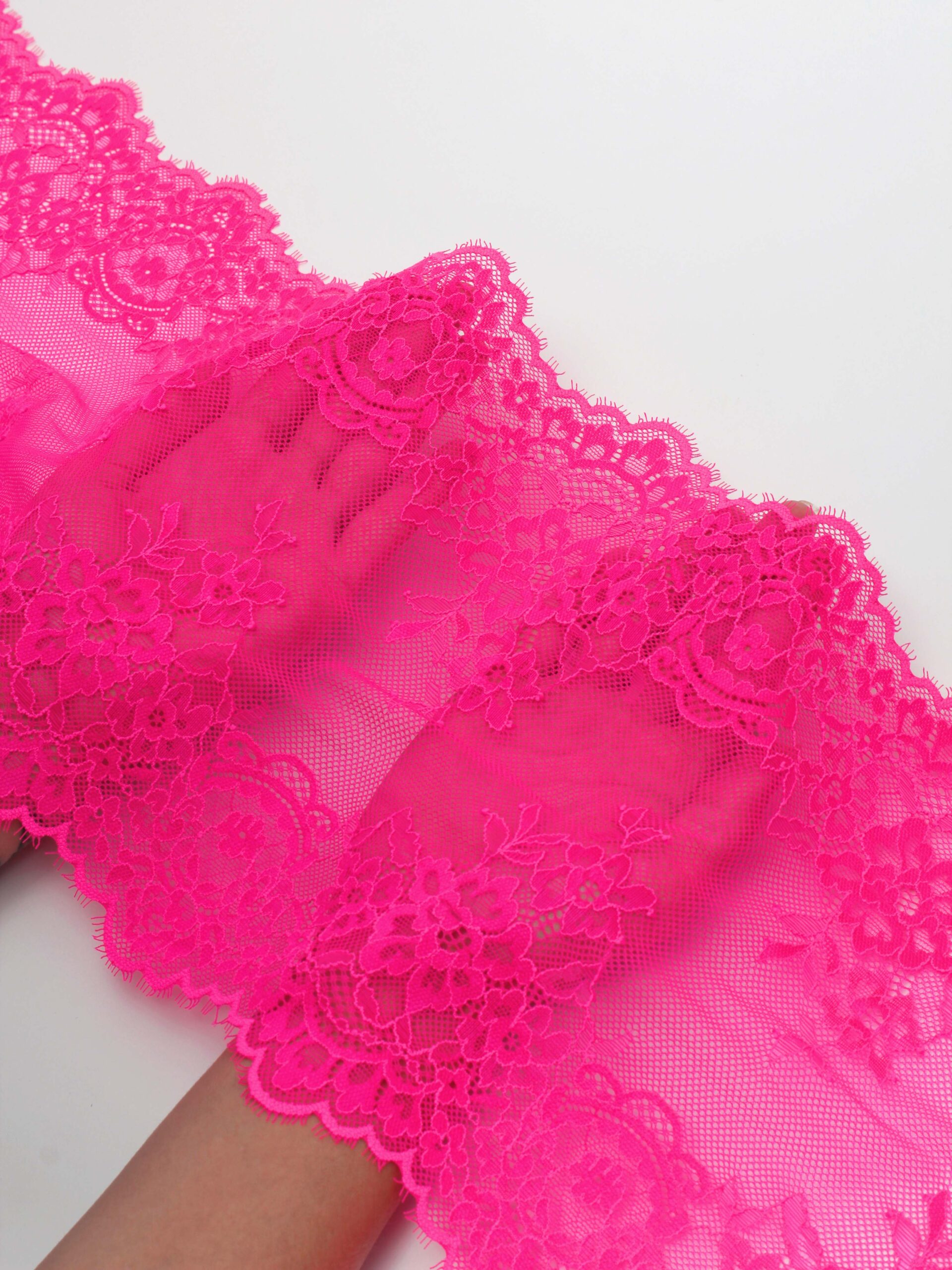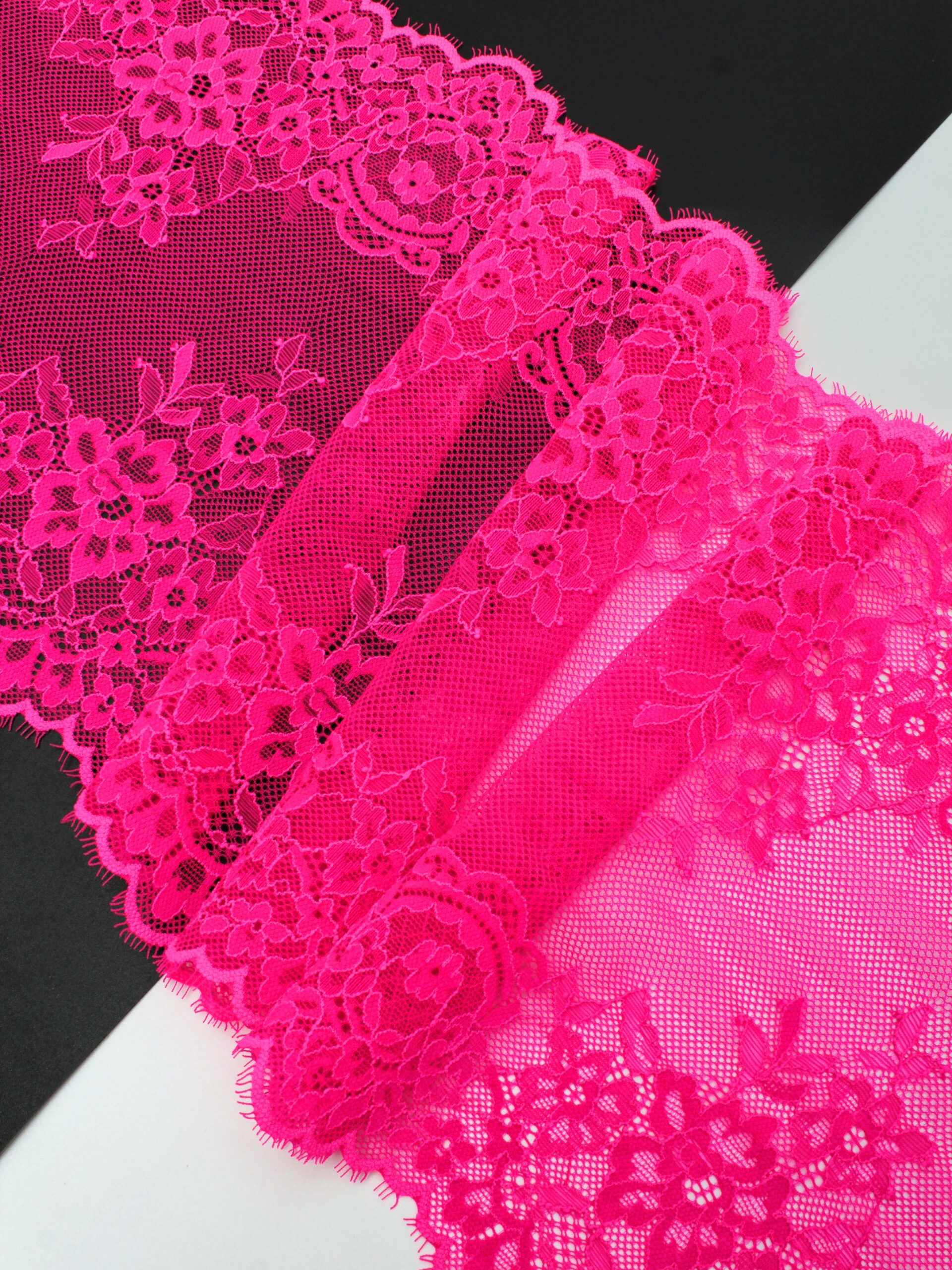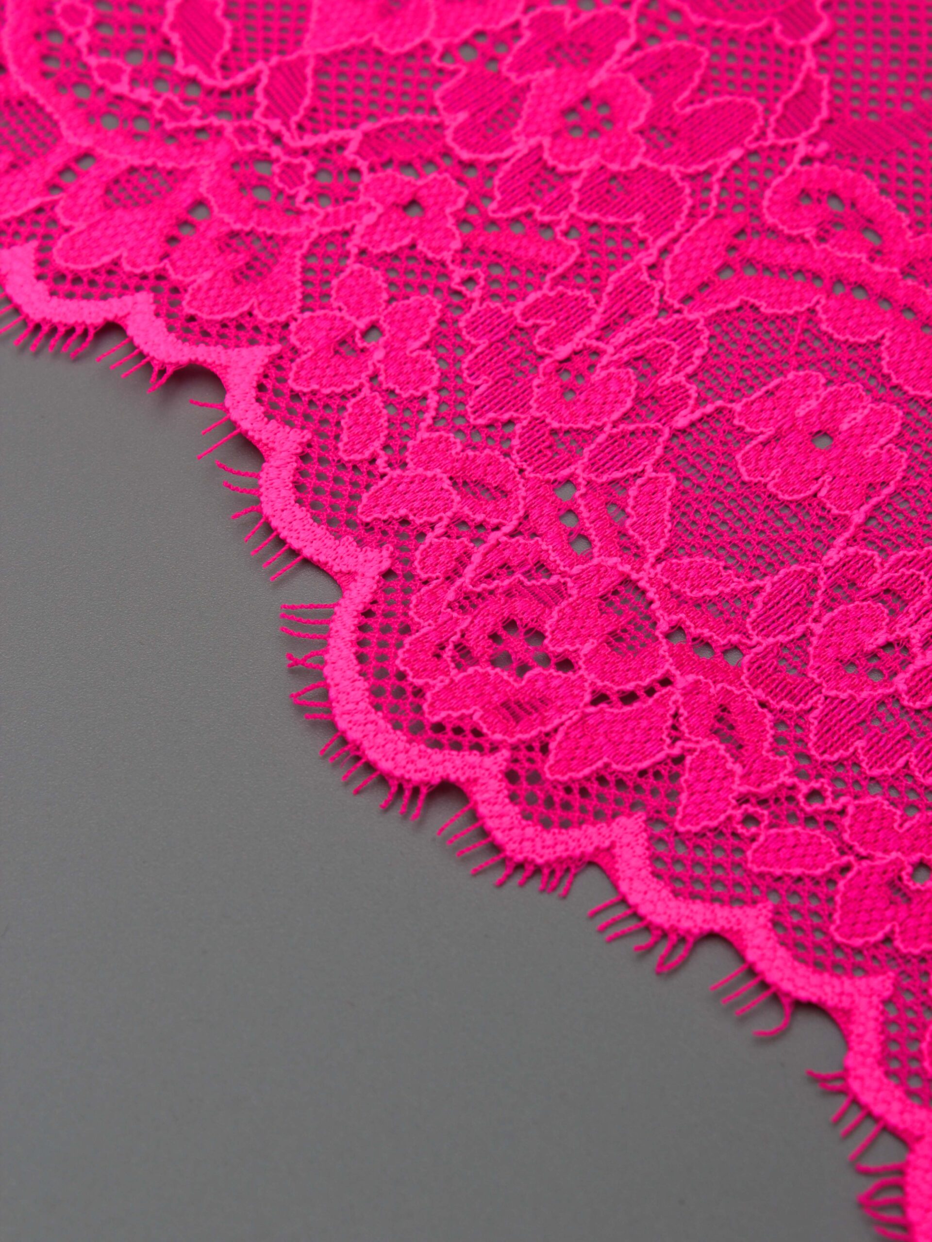 Кружево стрейч розового оттенка с цветочным рисунком. Шантильи эластичное розового неонового цвета. Насыщеннее большинства товаров розового неонового оттенка.