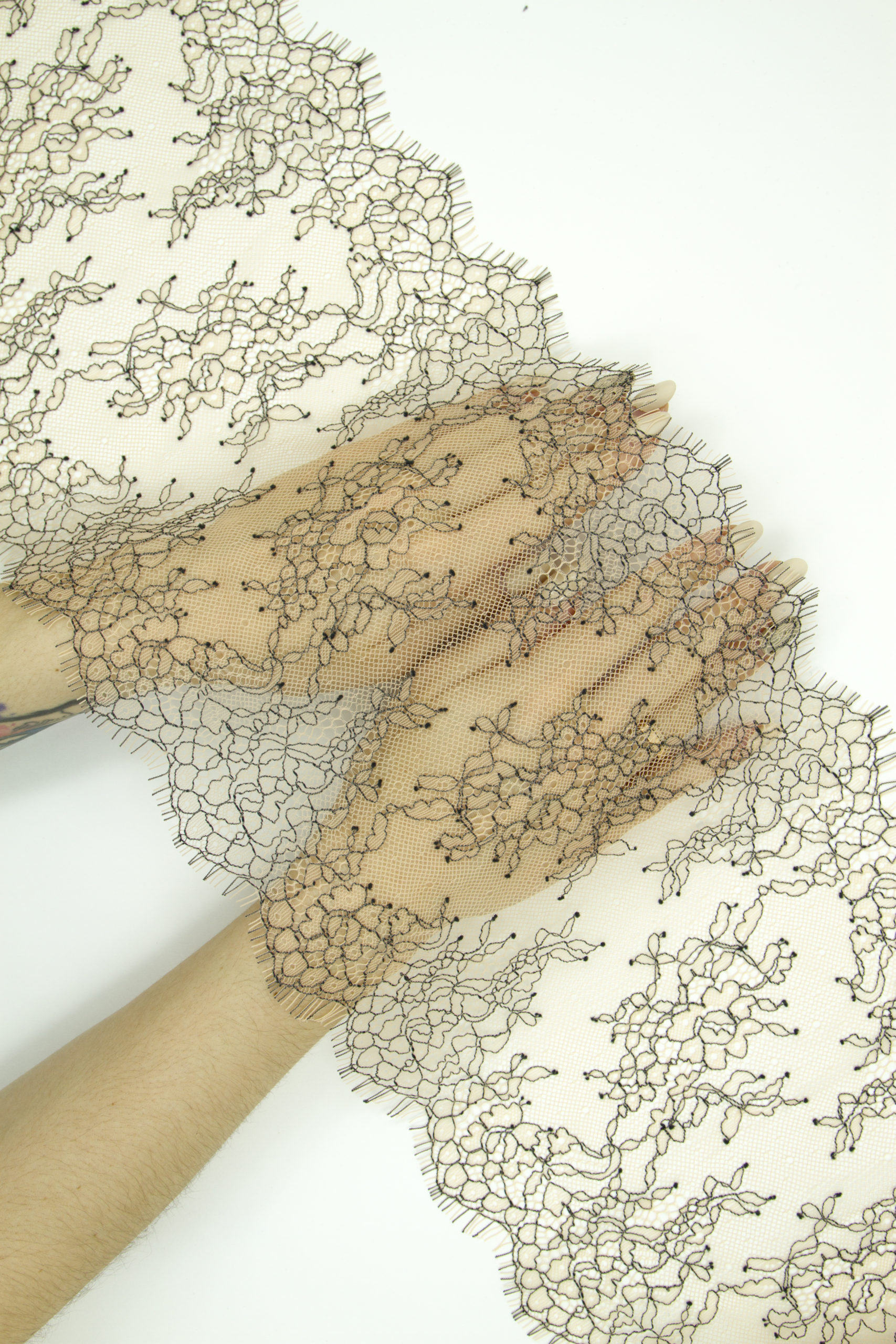Французское кружево шантильи телесное с черным мягкий и тонкий материал. Он хорошо держит форму держит форму, почти не тянется, отличается высокой прочностью, весит очень мало и очень приятное на ощупь. Его используют для пошива и отделки вечерних и коктейльных платьев, свадебных нарядов, нижнего белья. Даже небольшие ажурные вставки придают изделию утонченность. Украсьте французским кружевом блузку, лиф платья, любое изделие из денима, и вы убедитесь, насколько элегантно смотрится такой материал. Шантильи уместно не только на одежде, но и домашнем текстиле. Ажурную ткань применяют для украшения скатертей и салфеток, занавесок.