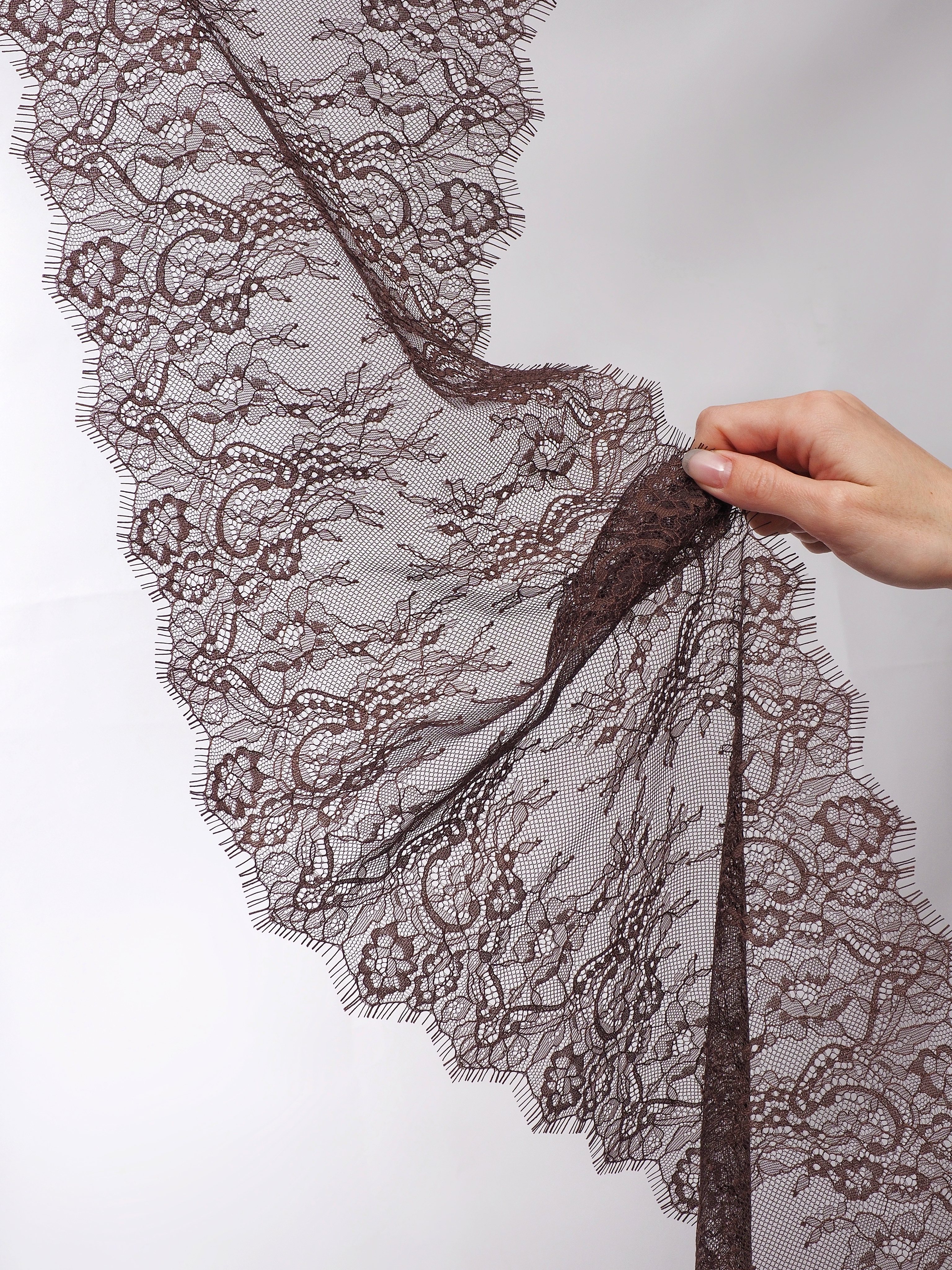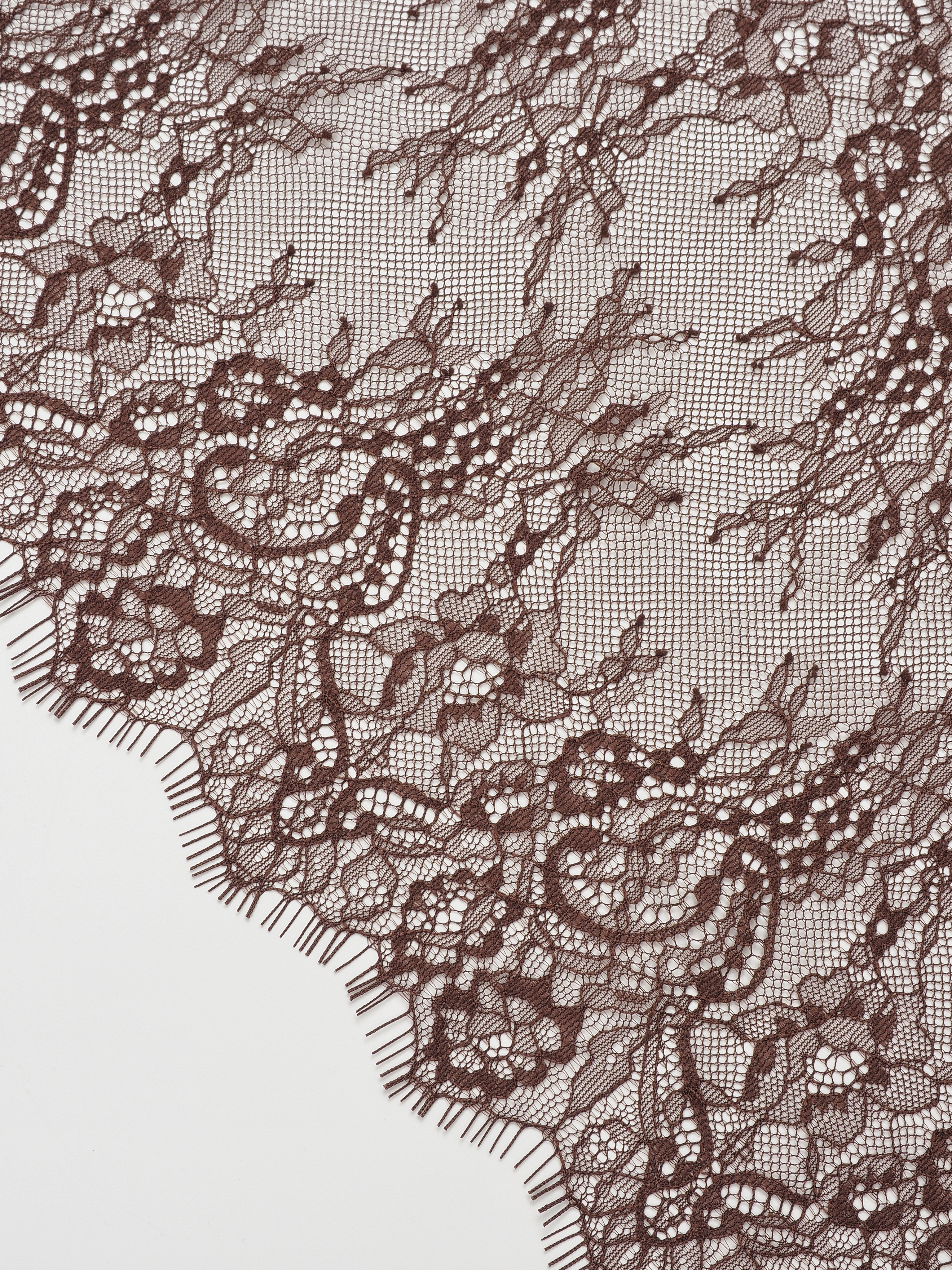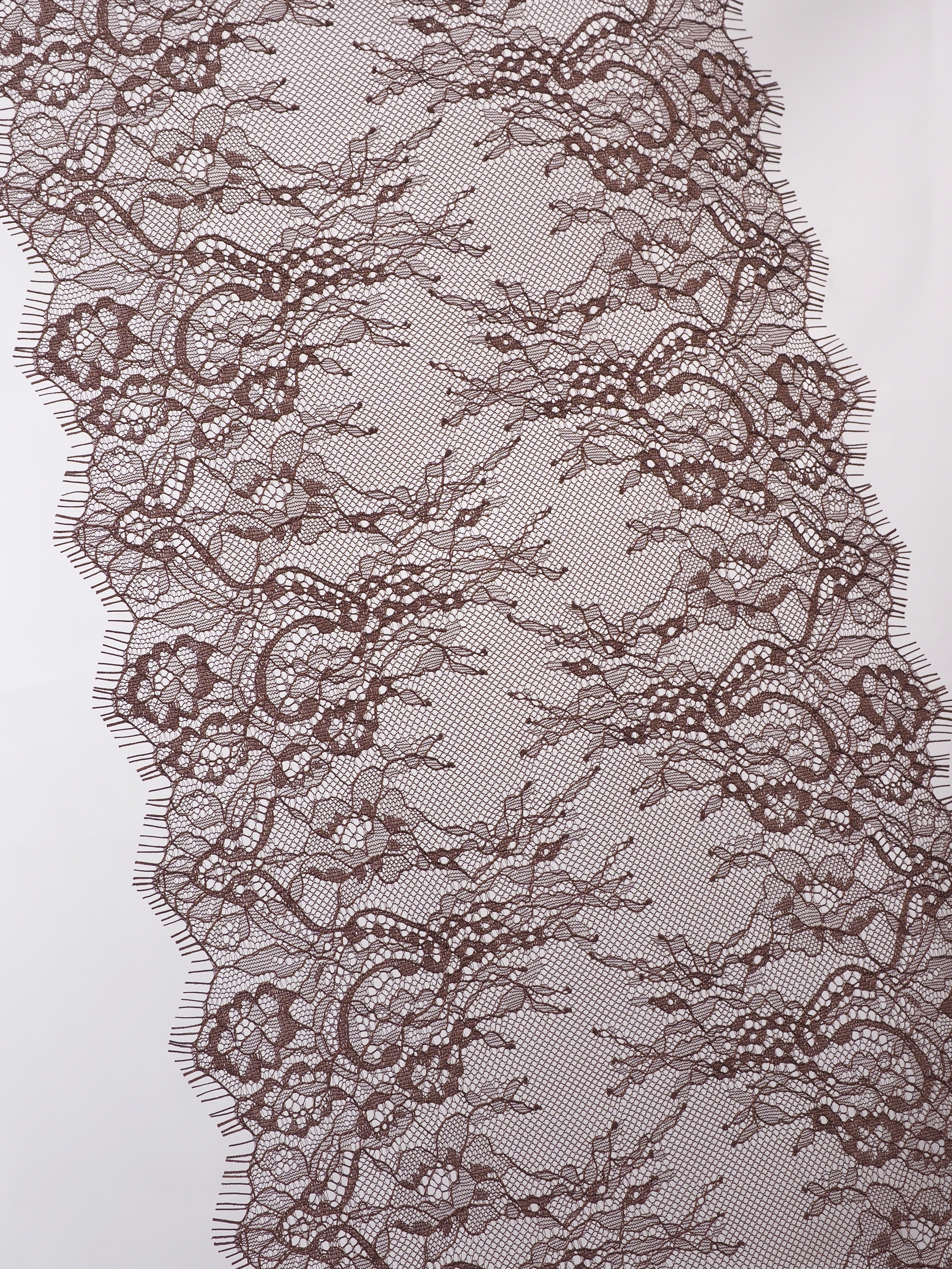 Шантильи кружево с ресничками без эластана с цветочным рисунком коричневого оттенка.