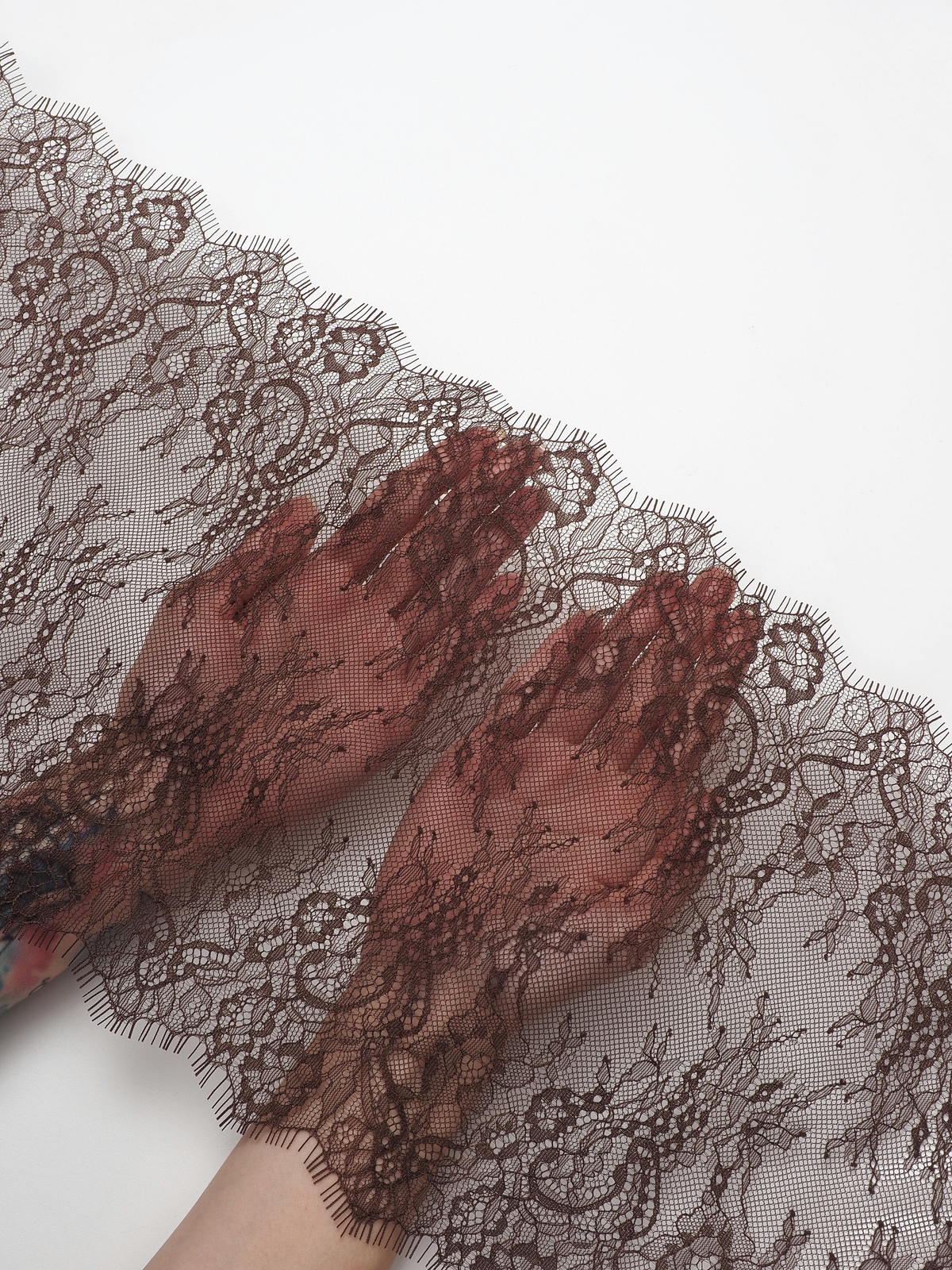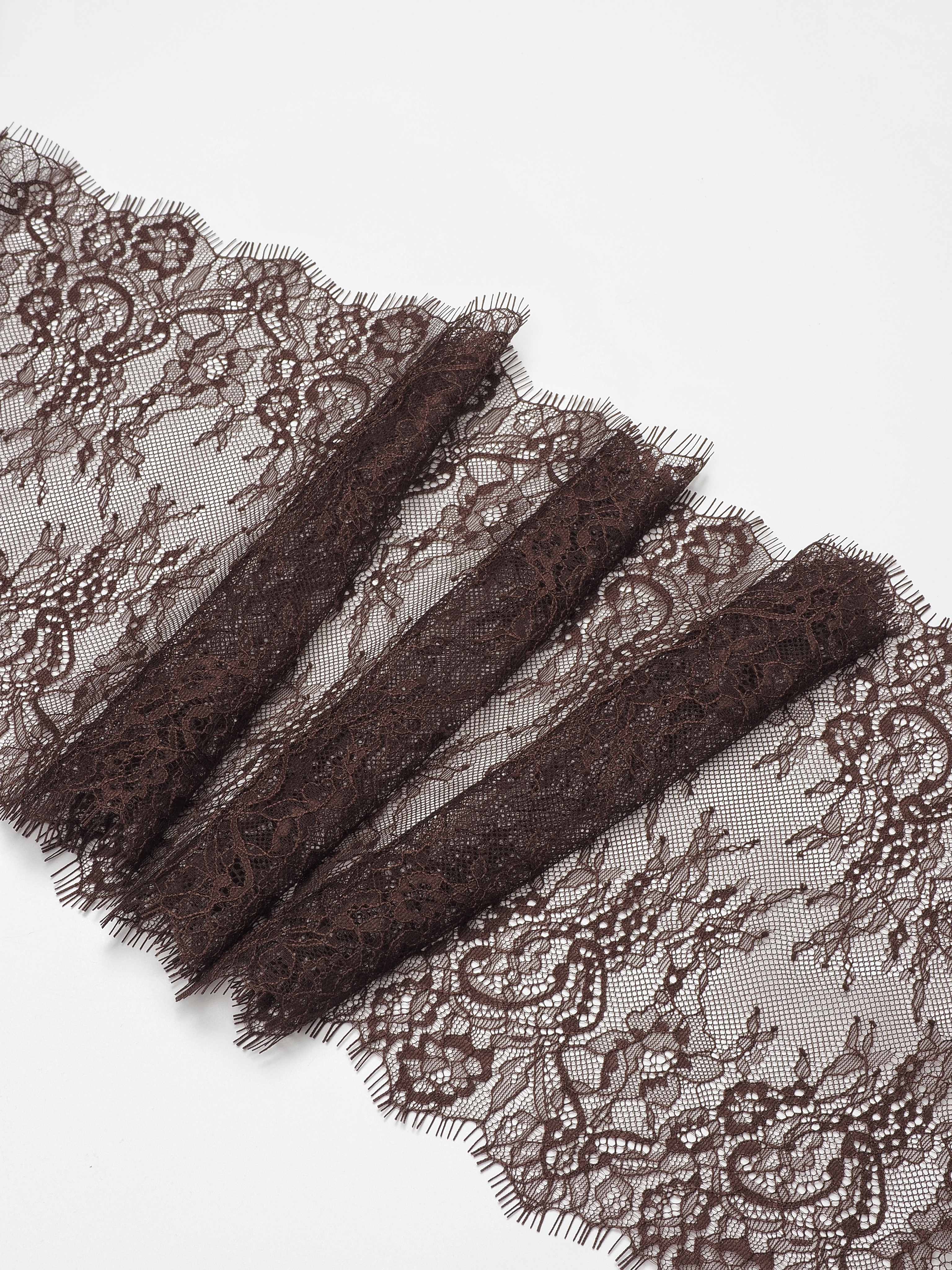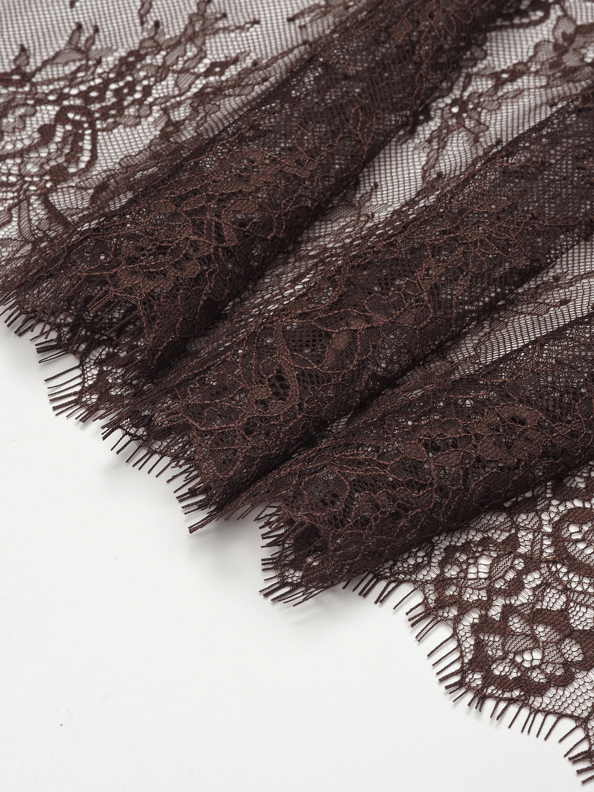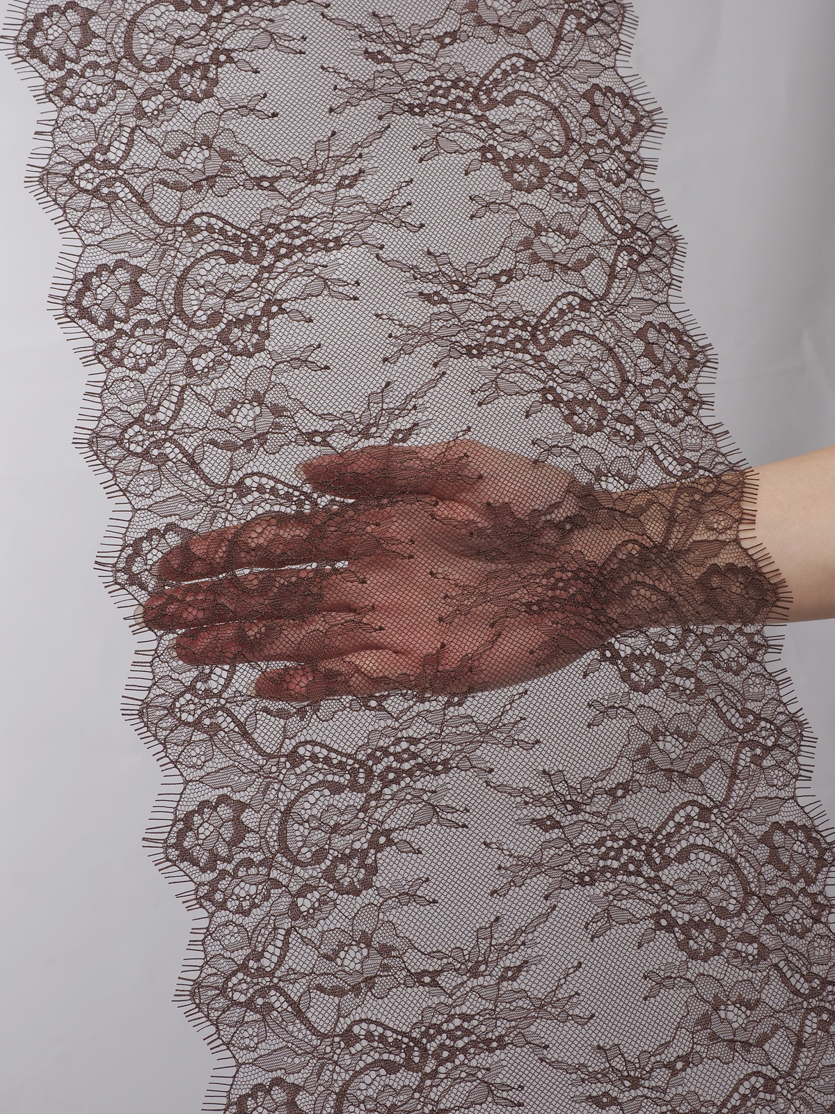 Шантильи кружево с ресничками без эластана с цветочным рисунком коричневого оттенка.