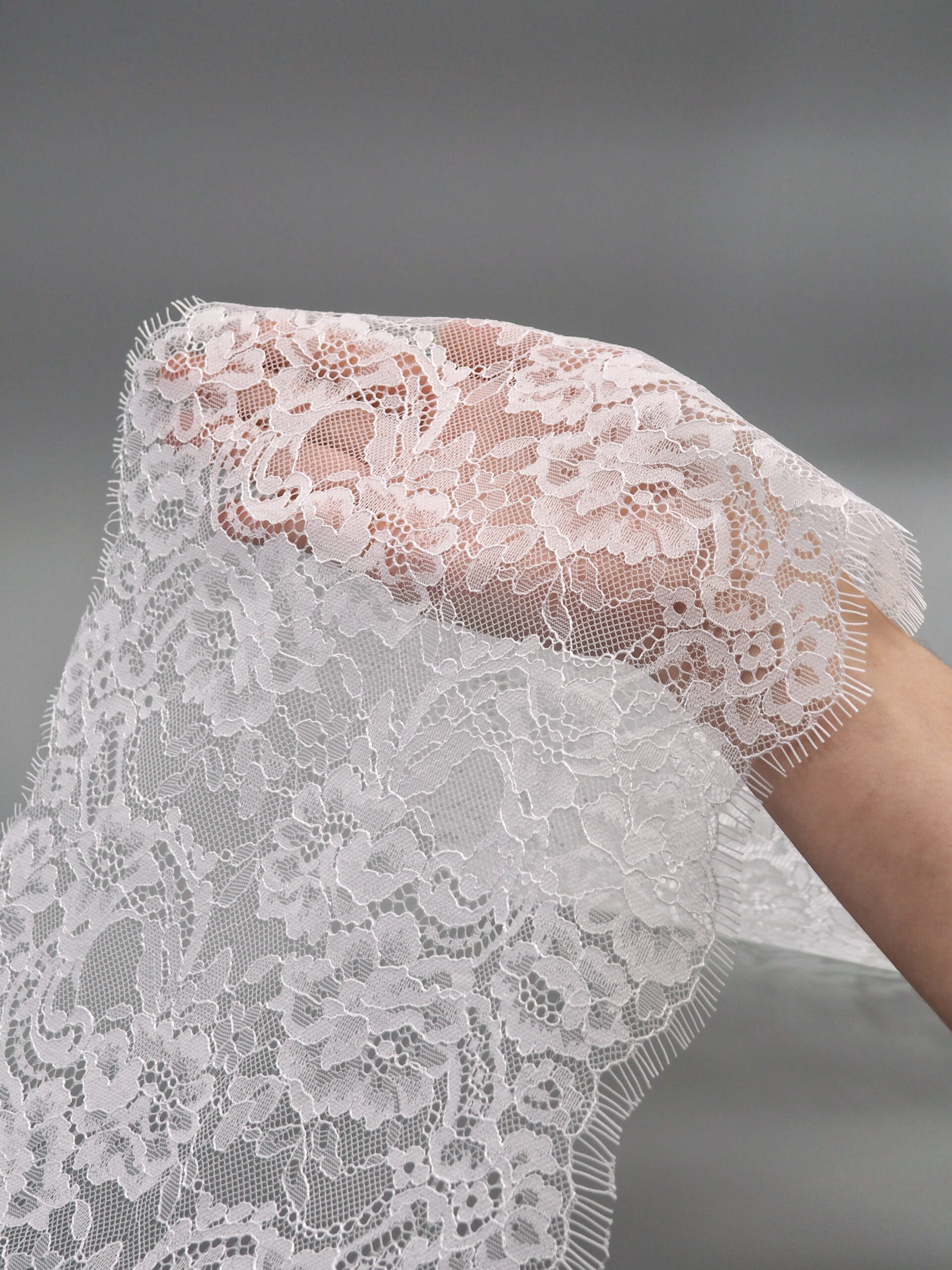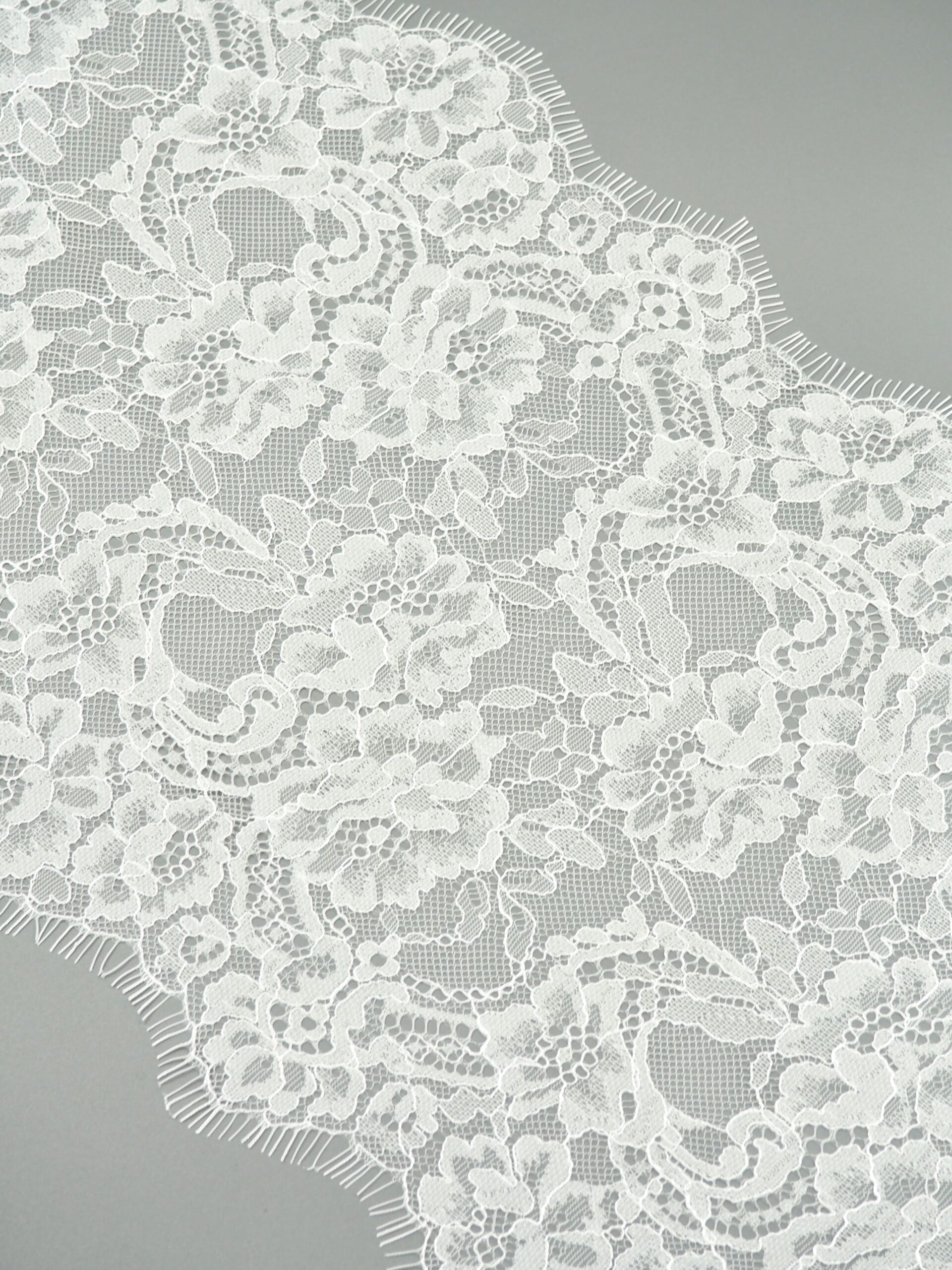Шантильи кружево с ресничками без эластана с цветочным рисунком белого оттенка.