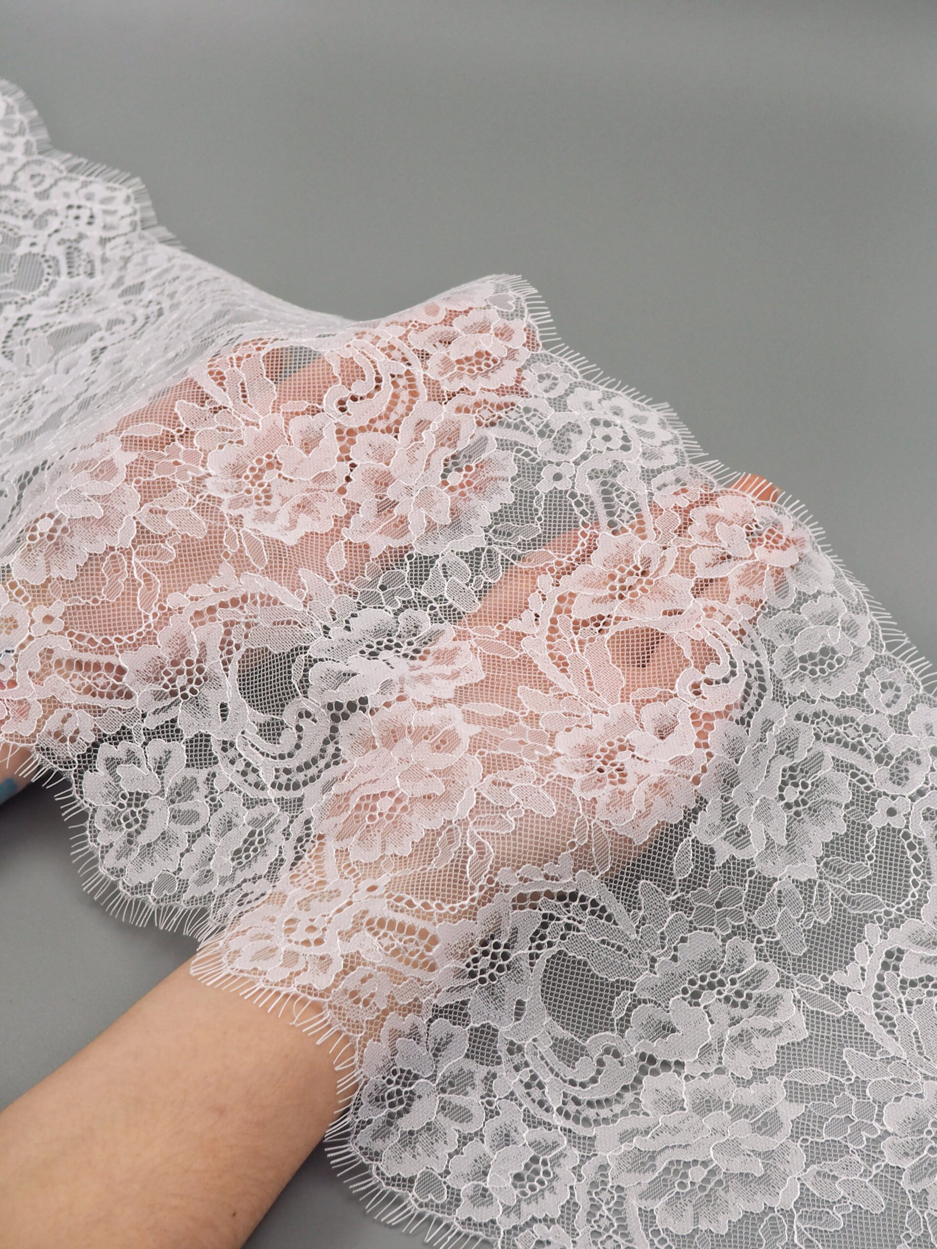 Французское кружево шантильи теплое белое мягкий и тонкий материал. Он хорошо держит форму держит форму, почти не тянется, отличается высокой прочностью, весит очень мало и очень приятное на ощупь. Его используют для пошива и отделки вечерних и коктейльных платьев, свадебных нарядов, нижнего белья. Даже небольшие ажурные вставки придают изделию утонченность. Украсьте французским кружевом блузку, лиф платья, любое изделие из денима, и вы убедитесь, насколько элегантно смотрится такой материал. Шантильи уместно не только на одежде, но и домашнем текстиле. Ажурную ткань применяют для украшения скатертей и салфеток, занавесок.