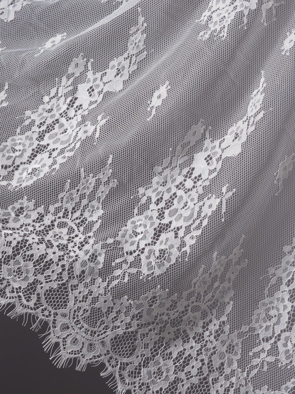 Шантильи кружево с ресничками без эластана с цветочным рисунком белого оттенка.