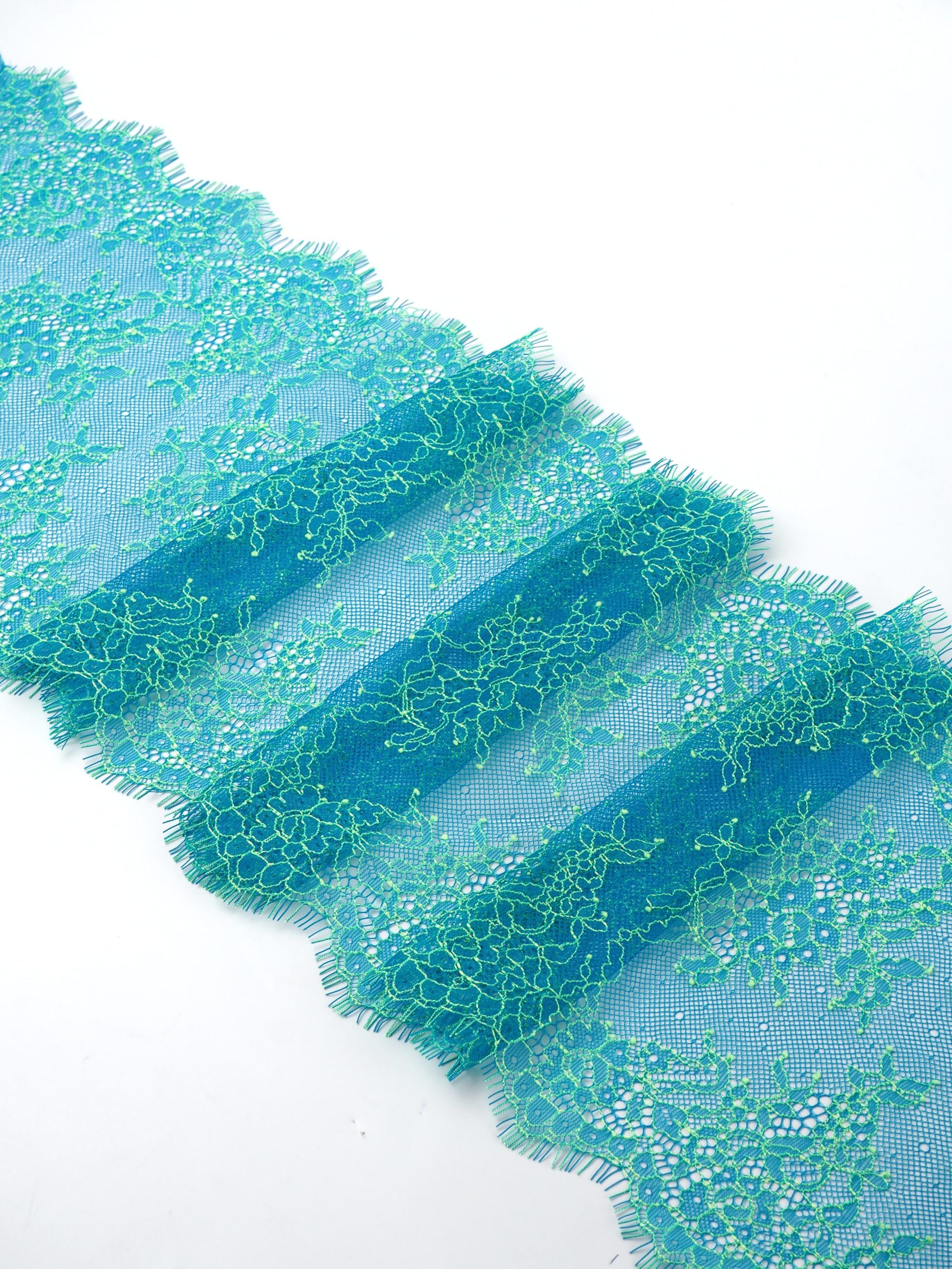 Кружево шантильи тихоокеанский синий с нитью лимон-лайм неэластичное ширина 22 см ОТРЕЗ 0,9 м