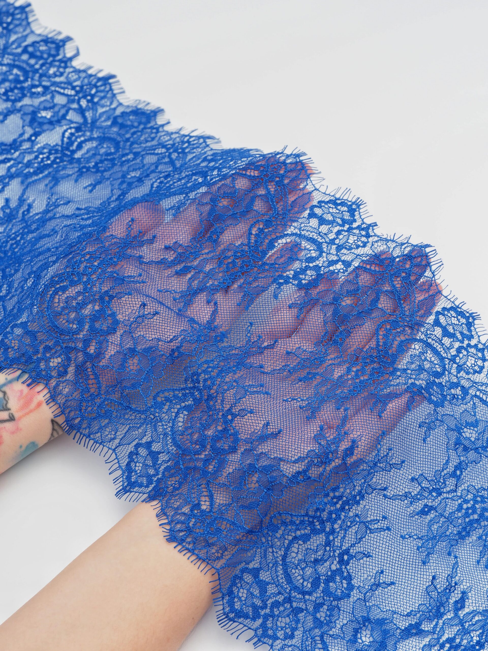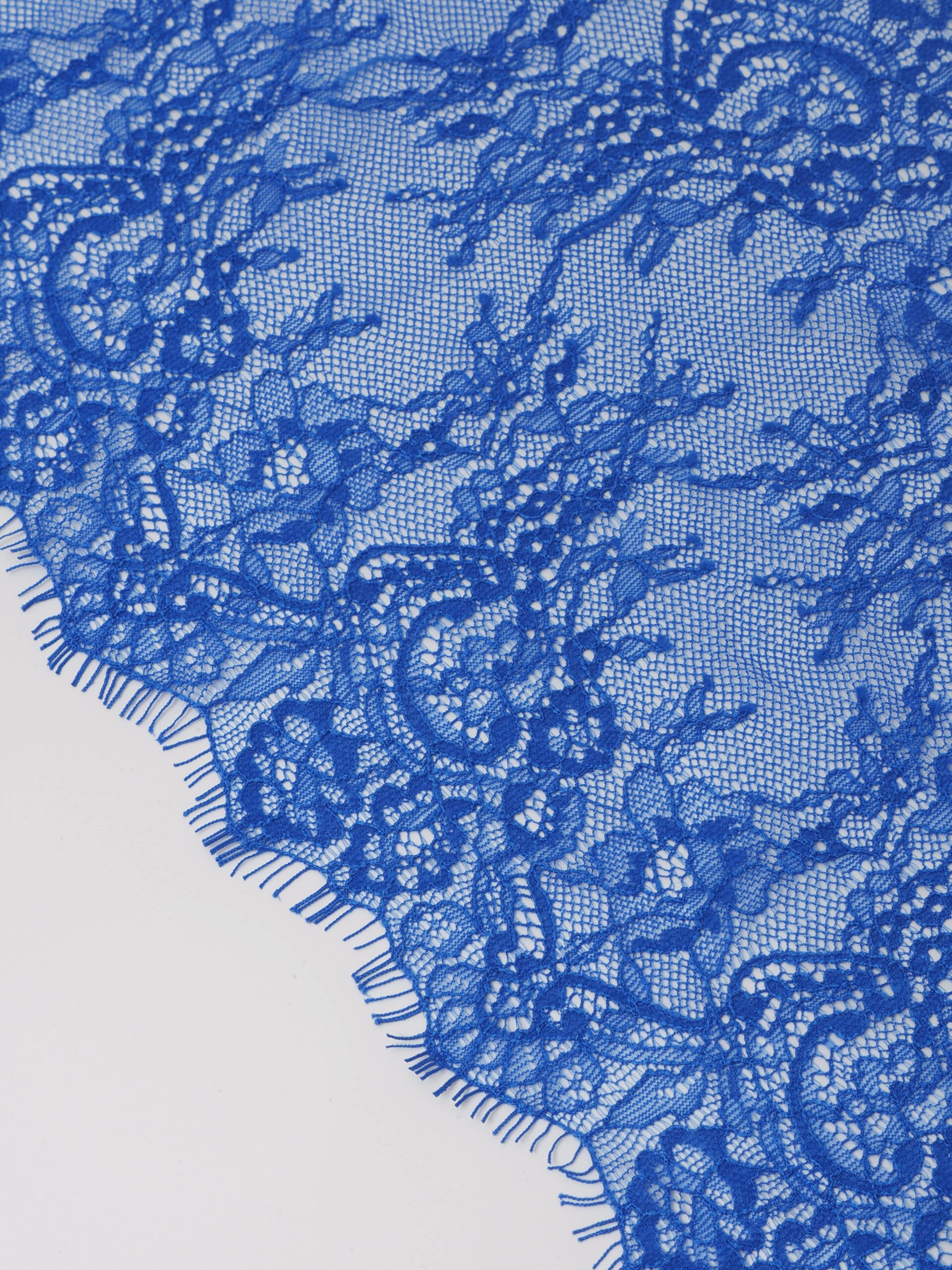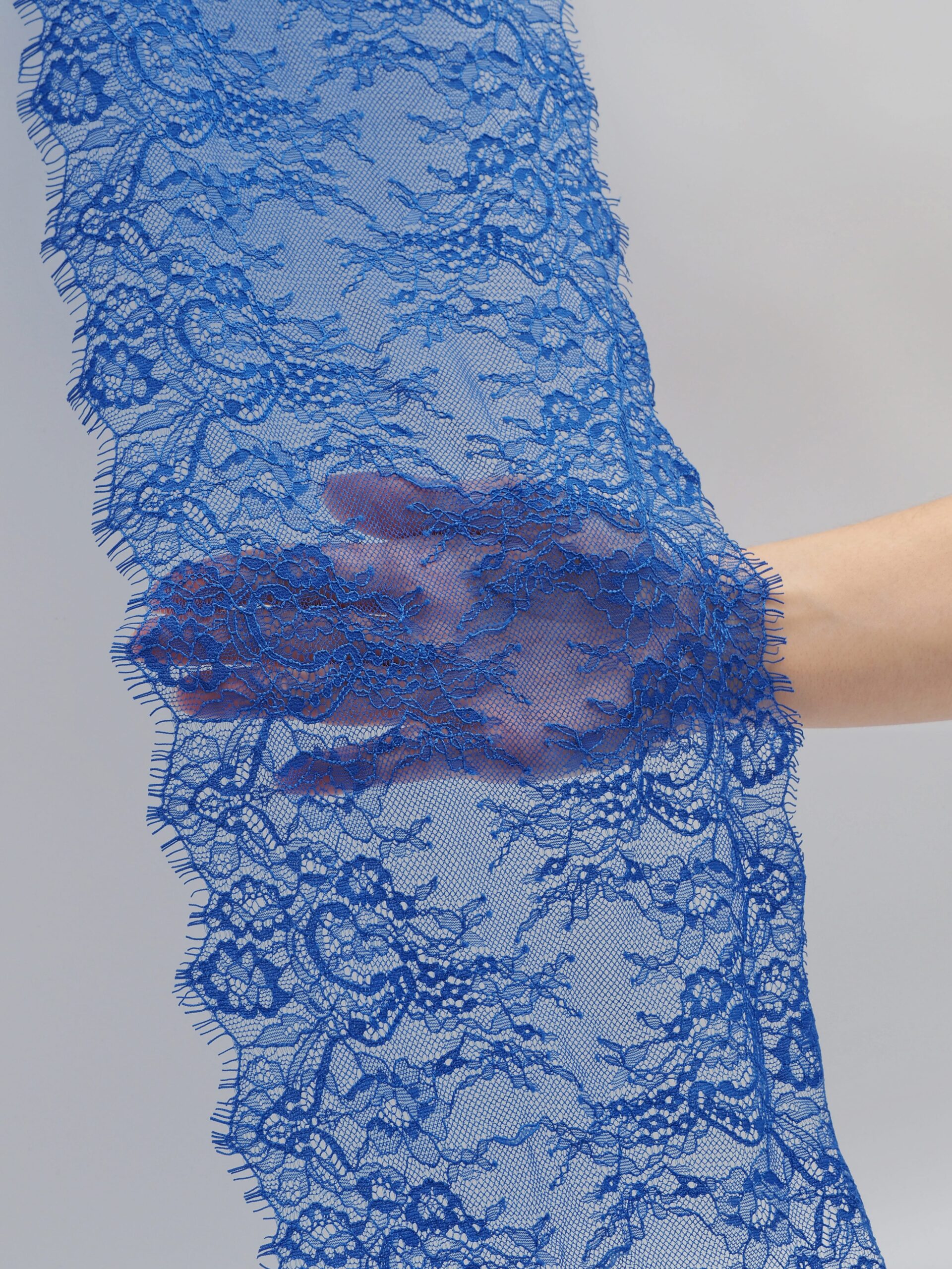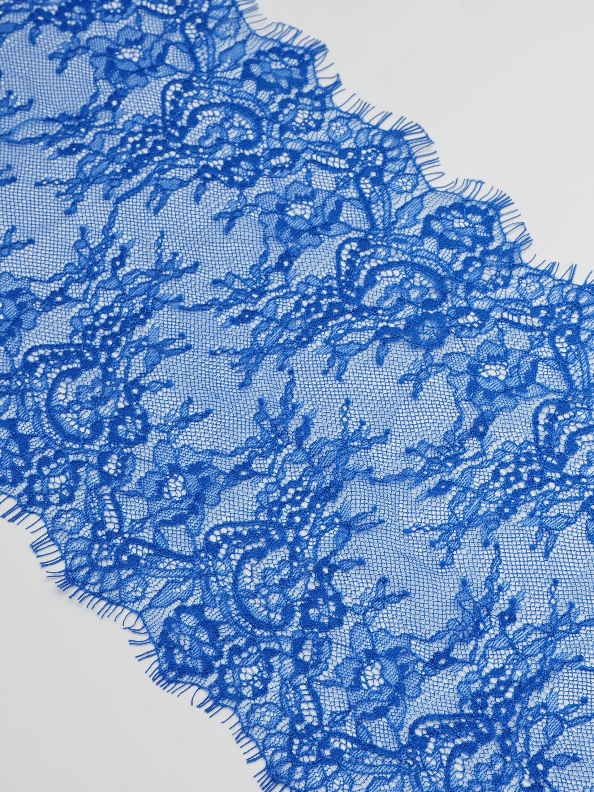 Французское кружево шантильи ультрамарин мягкий и тонкий материал. Он хорошо держит форму держит форму, почти не тянется, отличается высокой прочностью, весит очень мало и очень приятное на ощупь. Его используют для пошива и отделки вечерних и коктейльных платьев, свадебных нарядов, нижнего белья. Даже небольшие ажурные вставки придают изделию утонченность. Украсьте французским кружевом блузку, лиф платья, любое изделие из денима, и вы убедитесь, насколько элегантно смотрится такой материал. Шантильи уместно не только на одежде, но и домашнем текстиле. Ажурную ткань применяют для украшения скатертей и салфеток, занавесок.