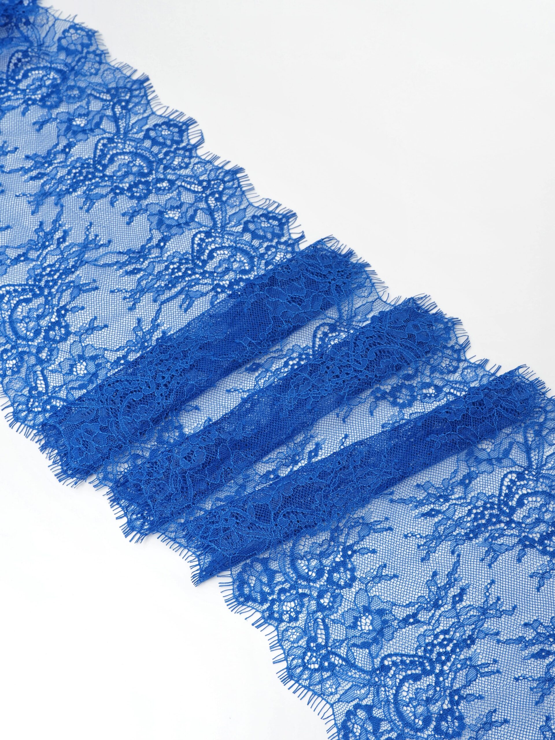 Французское кружево шантильи ультрамарин мягкий и тонкий материал. Он хорошо держит форму держит форму, почти не тянется, отличается высокой прочностью, весит очень мало и очень приятное на ощупь. Его используют для пошива и отделки вечерних и коктейльных платьев, свадебных нарядов, нижнего белья. Даже небольшие ажурные вставки придают изделию утонченность. Украсьте французским кружевом блузку, лиф платья, любое изделие из денима, и вы убедитесь, насколько элегантно смотрится такой материал. Шантильи уместно не только на одежде, но и домашнем текстиле. Ажурную ткань применяют для украшения скатертей и салфеток, занавесок.