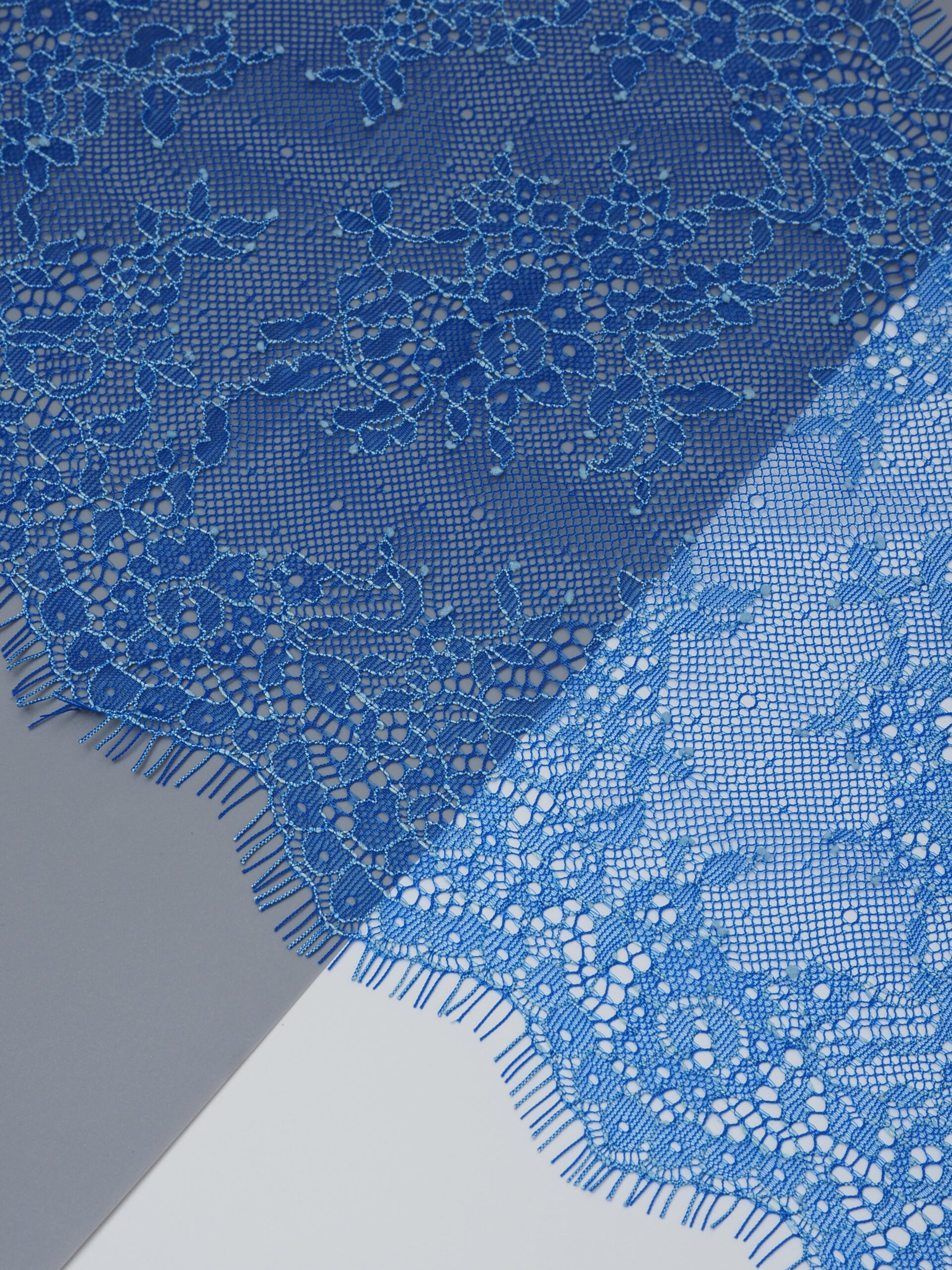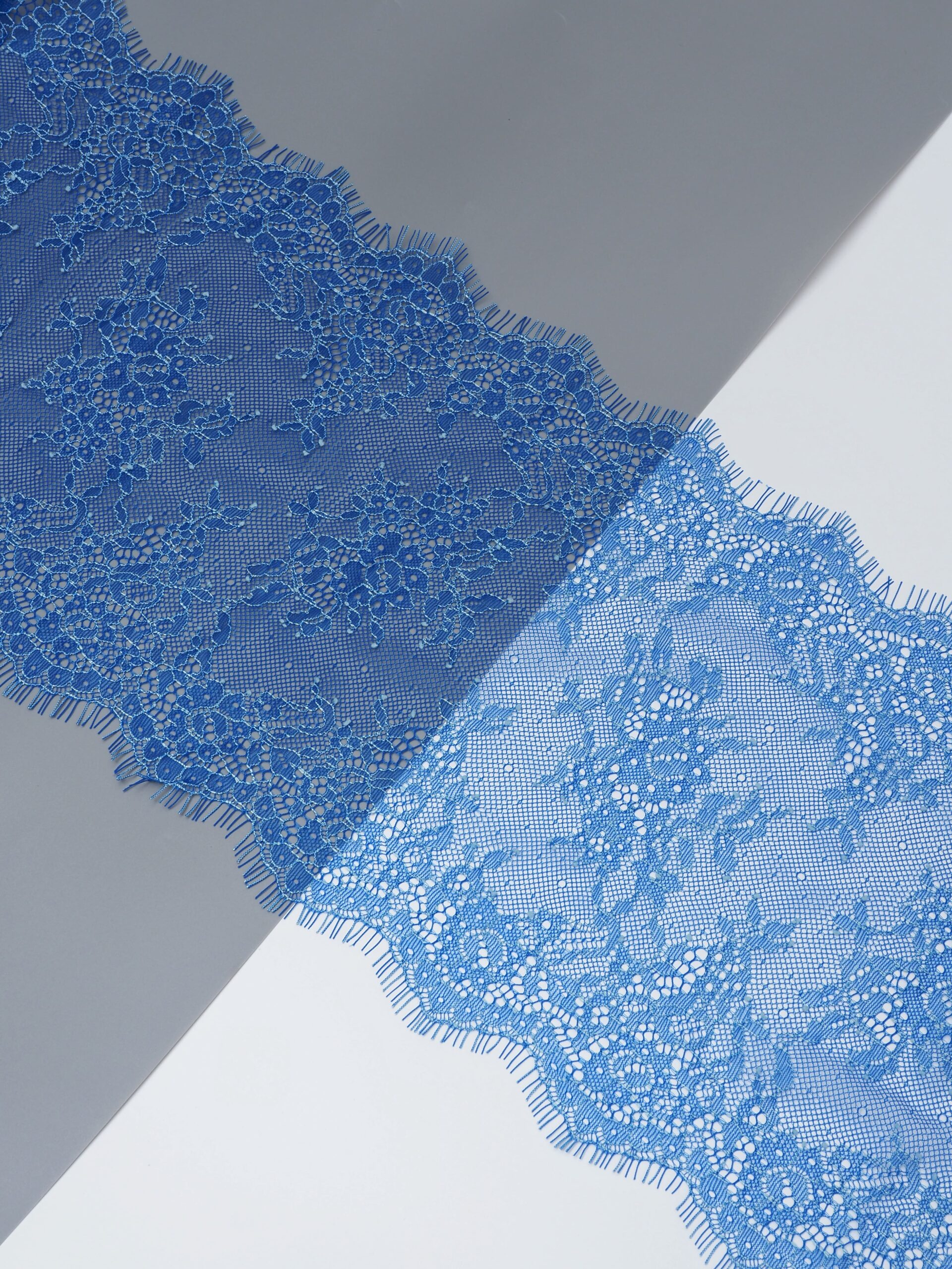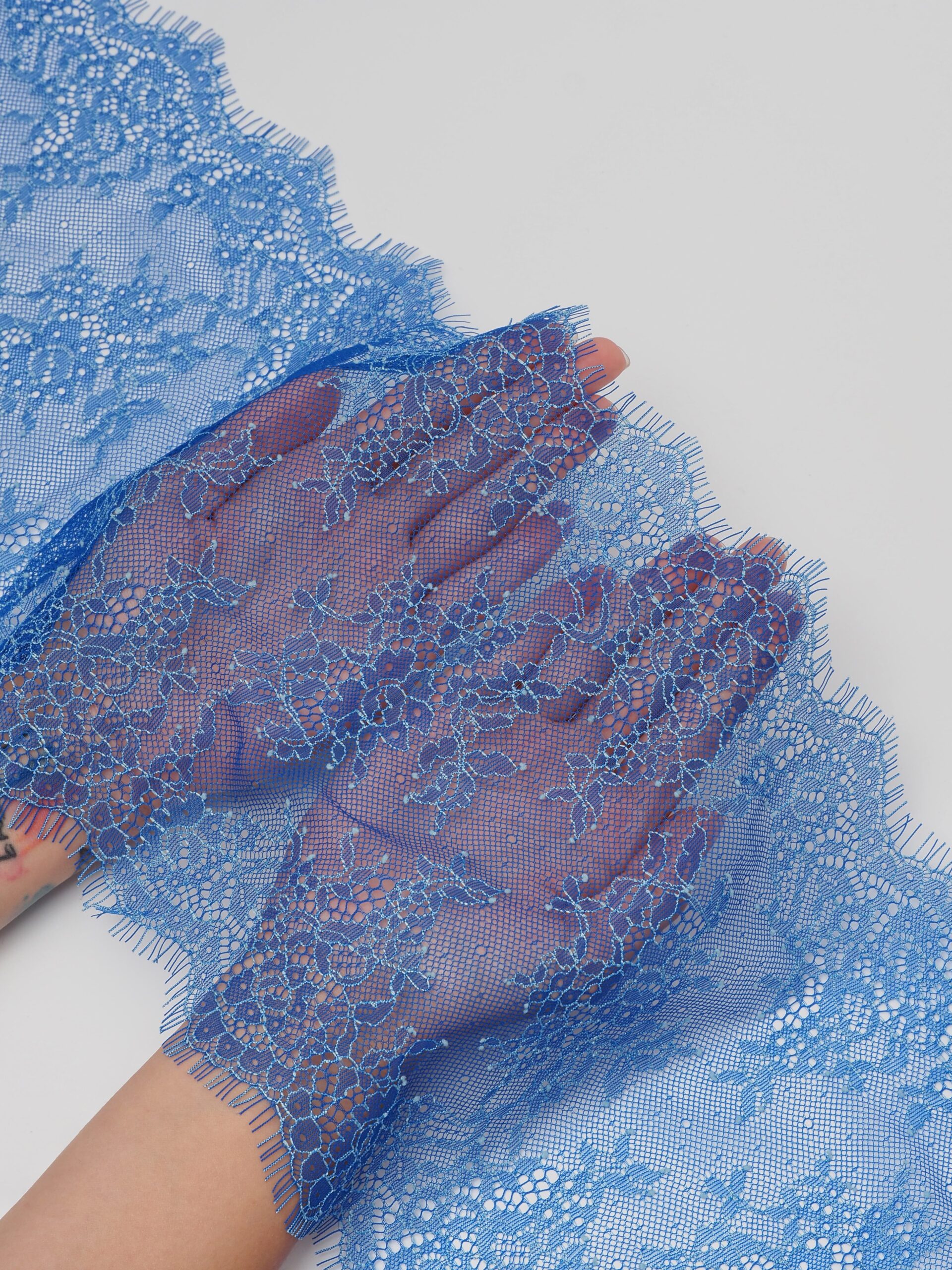 Французское кружево шантильи ультрамарин с голубой нитью мягкий и тонкий материал. Он хорошо держит форму, почти не тянется, отличается высокой прочностью, весит очень мало и очень приятное на ощупь. Его используют для пошива и отделки вечерних и коктейльных платьев, свадебных нарядов, нижнего белья. Даже небольшие ажурные вставки придают изделию утонченность. Украсьте французским кружевом блузку, лиф платья, любое изделие из денима, и вы убедитесь, насколько элегантно смотрится такой материал. Шантильи уместно не только на одежде, но и домашнем текстиле. Ажурную ткань применяют для украшения скатертей и салфеток, занавесок.