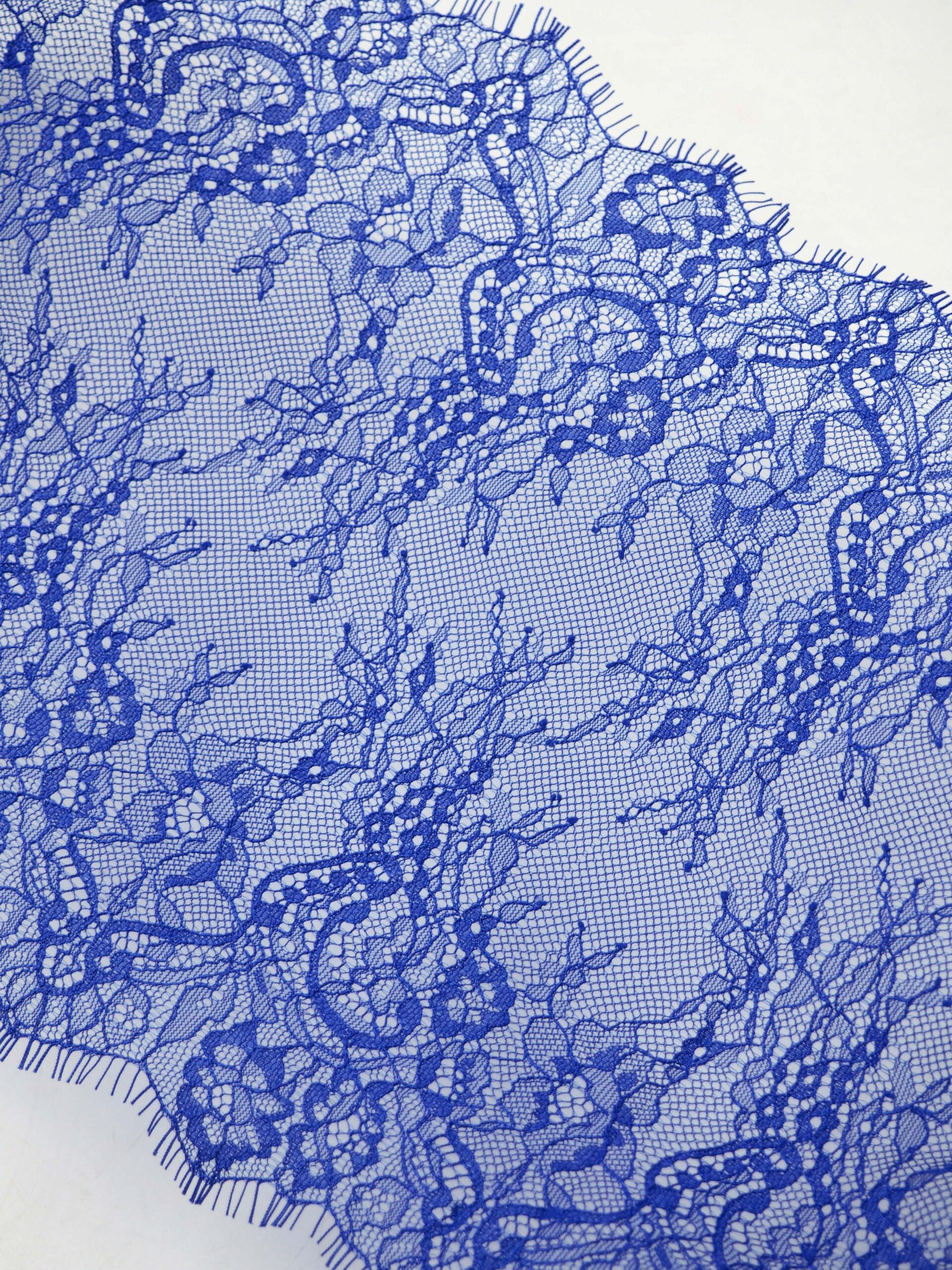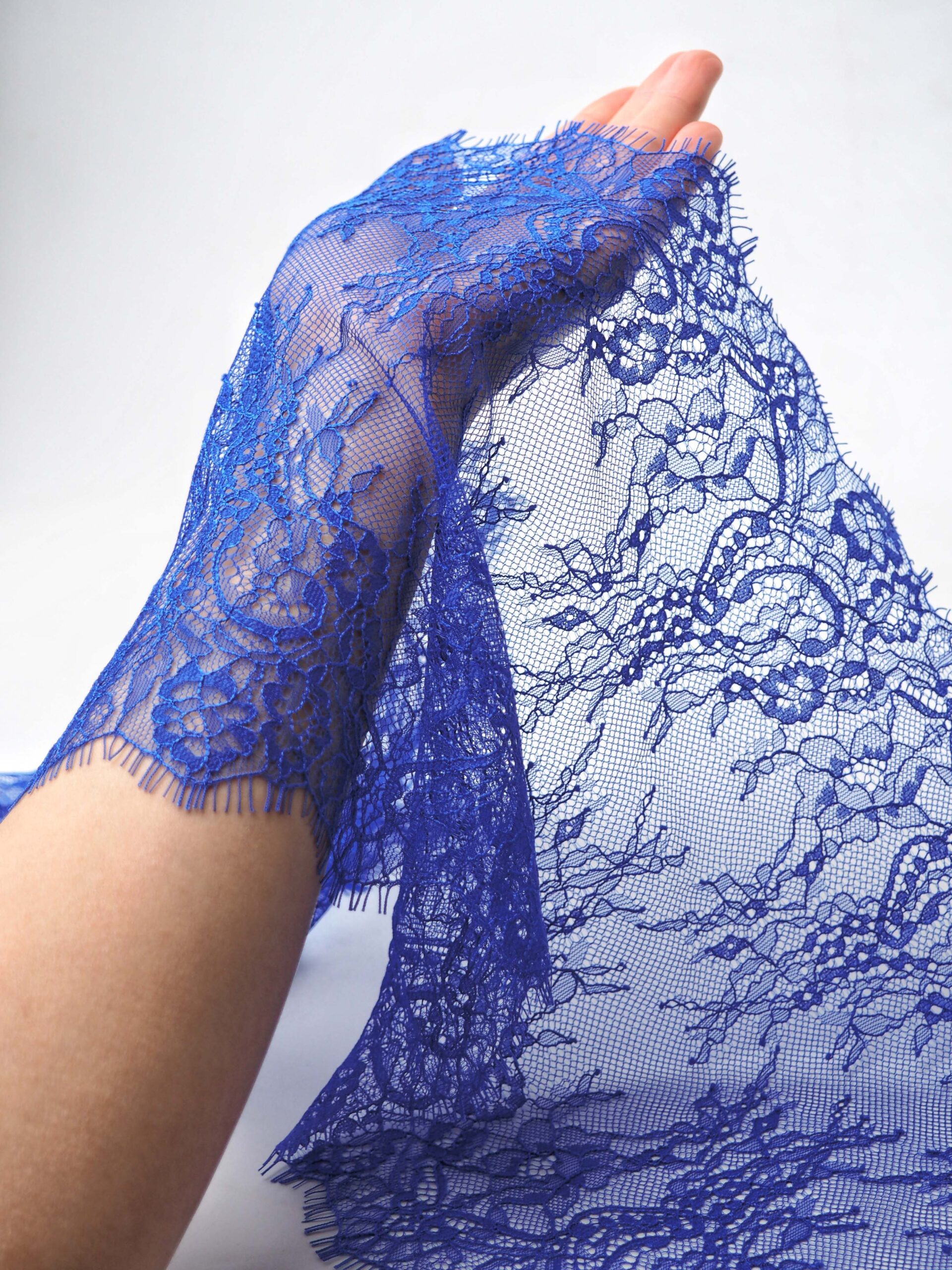 Французское кружево шантильи васильковое мягкий и тонкий материал. Он хорошо держит форму держит форму, почти не тянется, отличается высокой прочностью, весит очень мало и очень приятное на ощупь. Его используют для пошива и отделки вечерних и коктейльных платьев, свадебных нарядов, нижнего белья. Даже небольшие ажурные вставки придают изделию утонченность. Украсьте французским кружевом блузку, лиф платья, любое изделие из денима, и вы убедитесь, насколько элегантно смотрится такой материал. Шантильи уместно не только на одежде, но и домашнем текстиле. Ажурную ткань применяют для украшения скатертей и салфеток, занавесок.