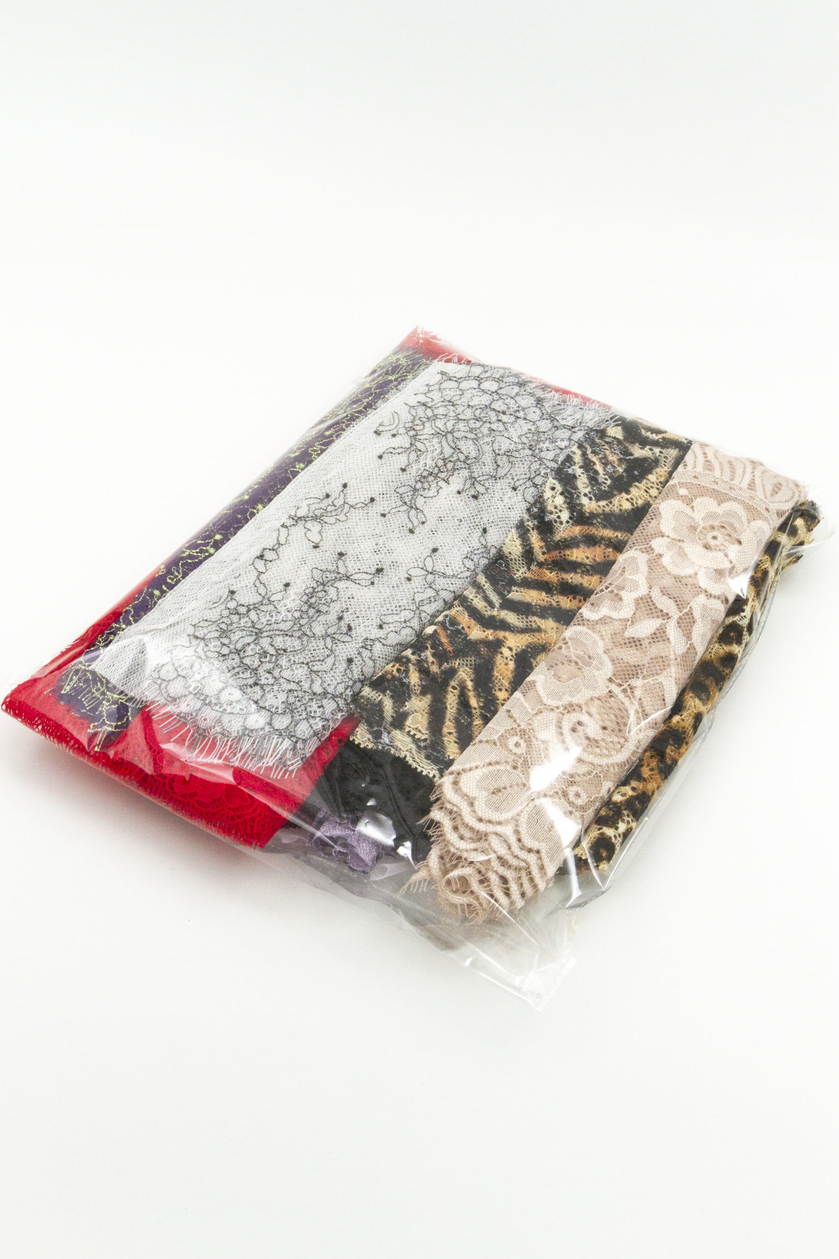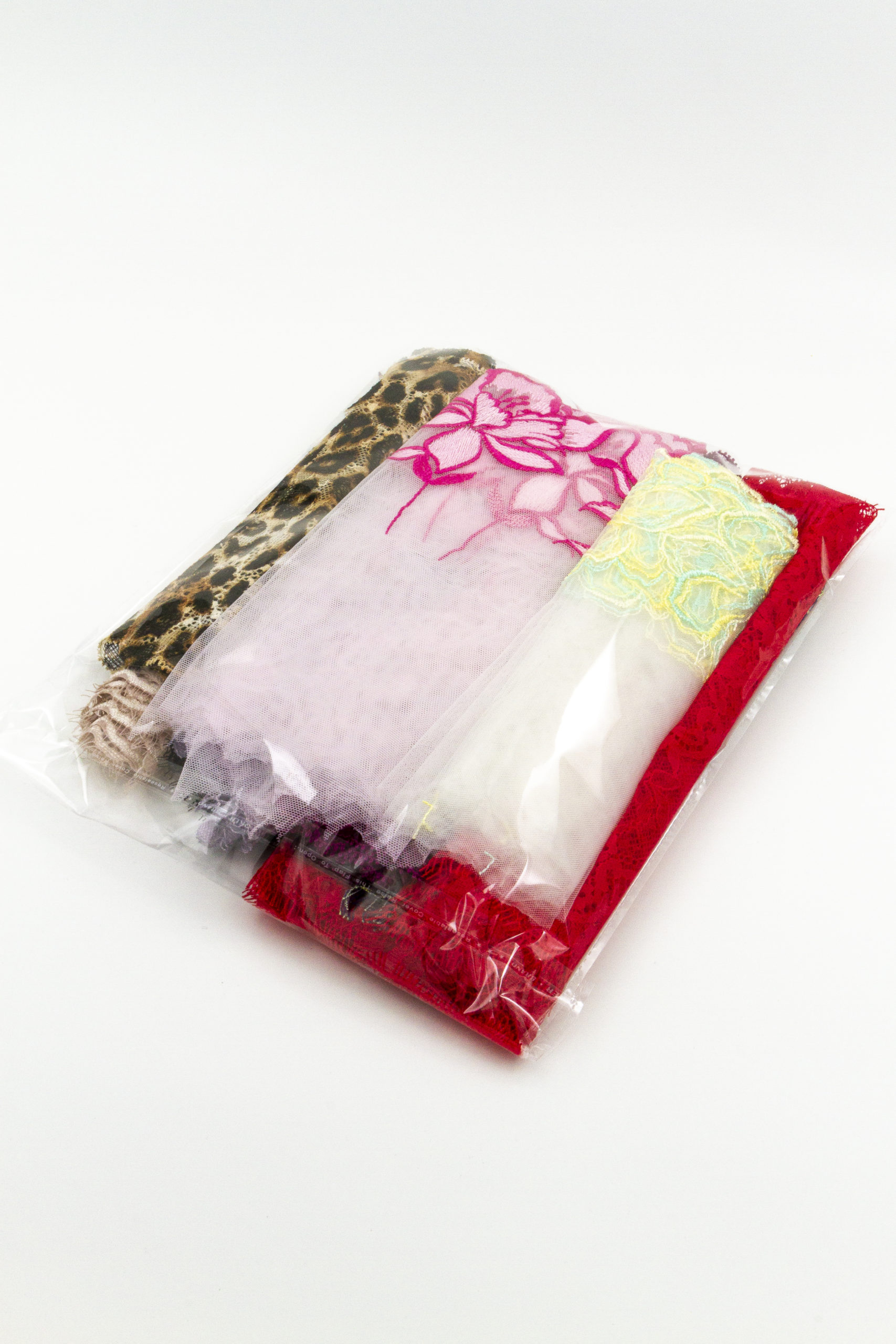 Набор кружева: Состоит из отрезов от 0,5 до 2,5 метров эластичного кружева, шантильи, вышивок на сетке. В сумме около 10-12 метров