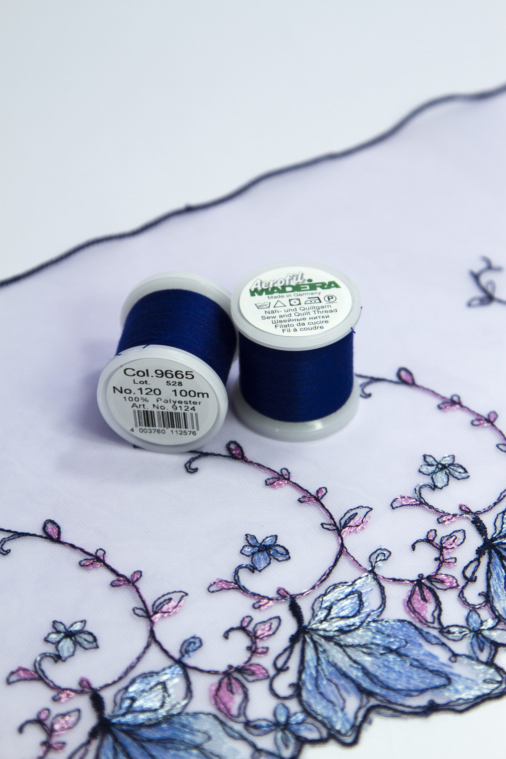 Универсальные нитки Madeira aerofil 120 синего оттенка для любых видов тканей. Можно использовать на швейной машинке и вручную.